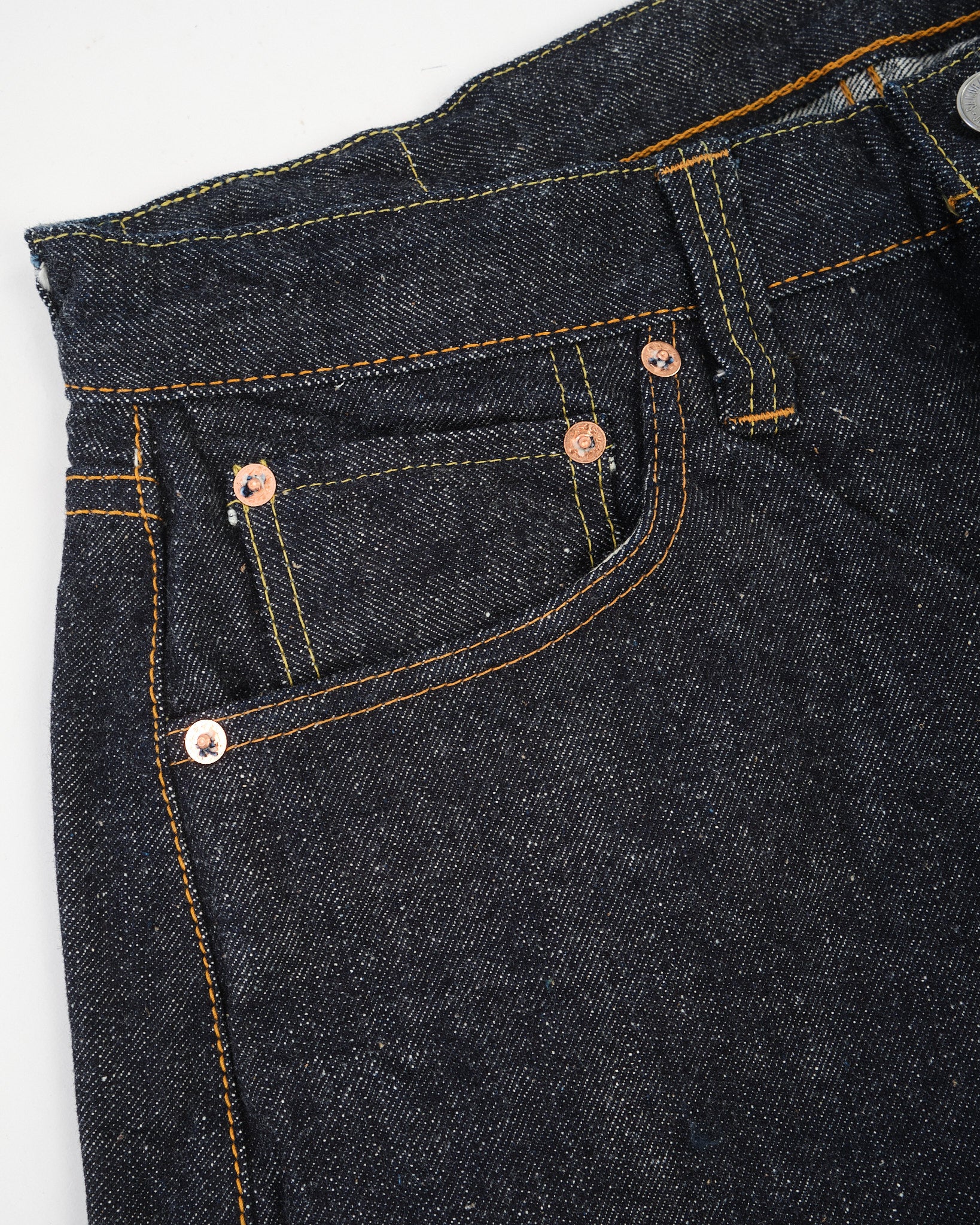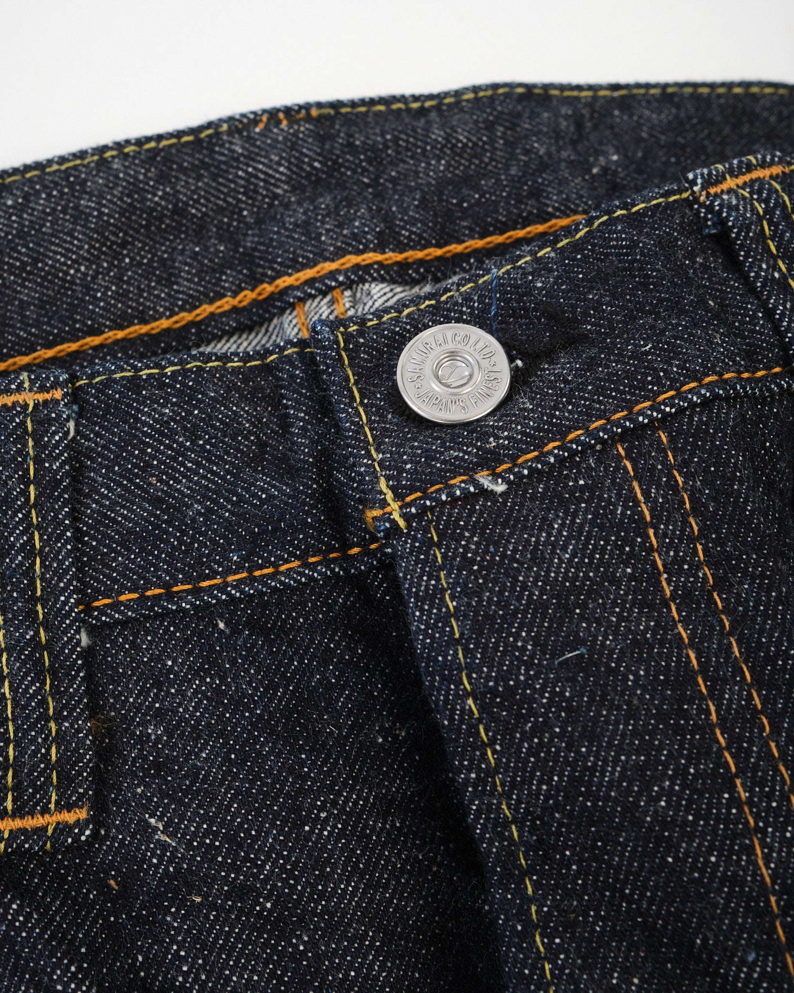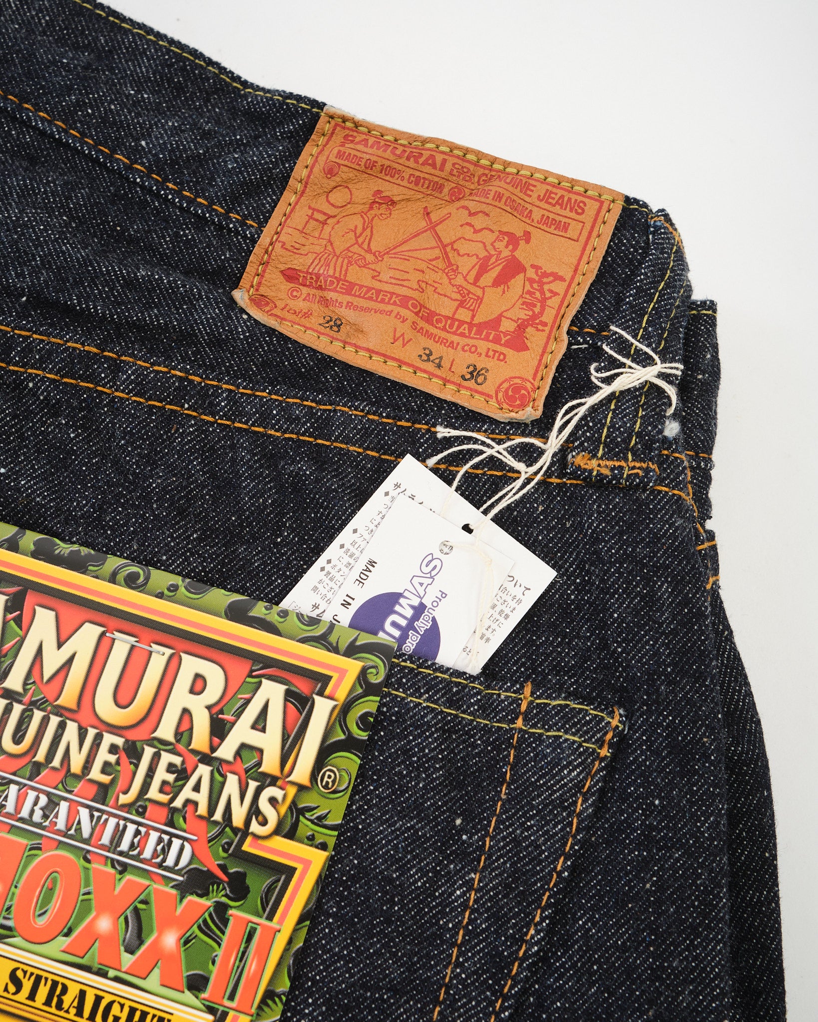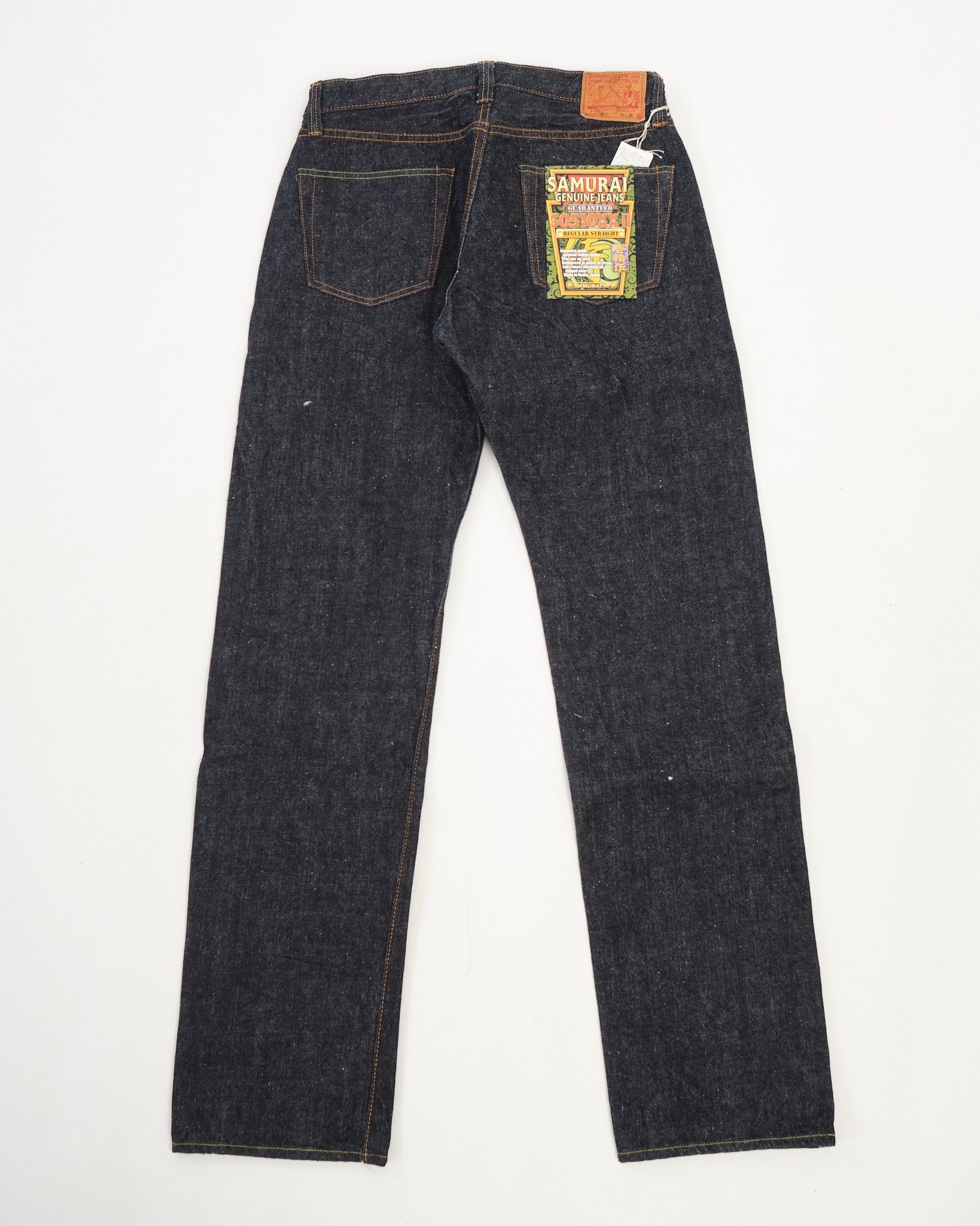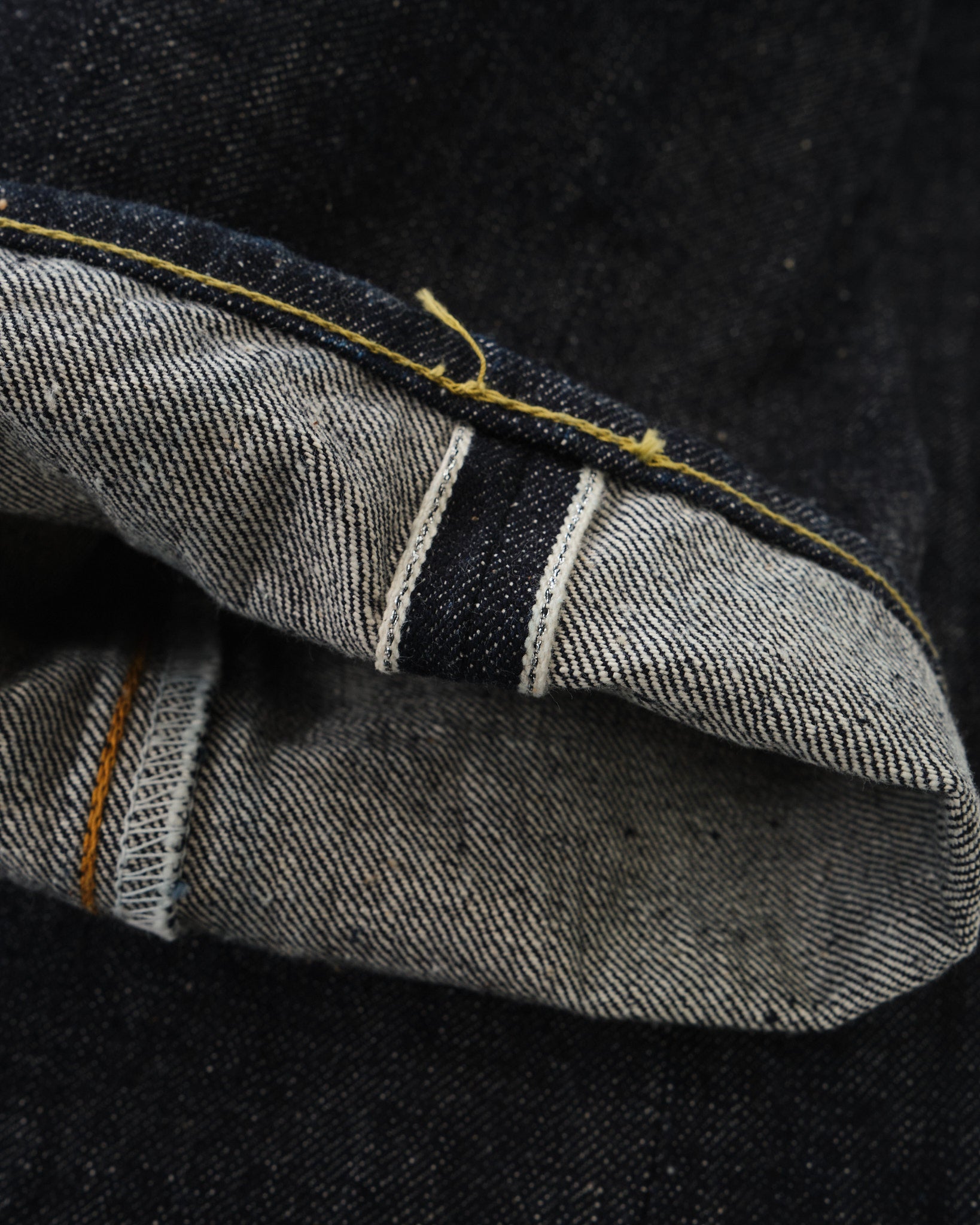 The S0510XXII stands as a true representative of Samurai Jeans: a 15oz regular straight cut built from the brand’s iconic Otokogi selvedge denim. Woven from slubby #6 cotton threads with bits of cotton waste left in the mix, this fabric pushes vintage looms to their limits, producing a rugged, uneven texture that evolves into sharp, high-contrast fades.