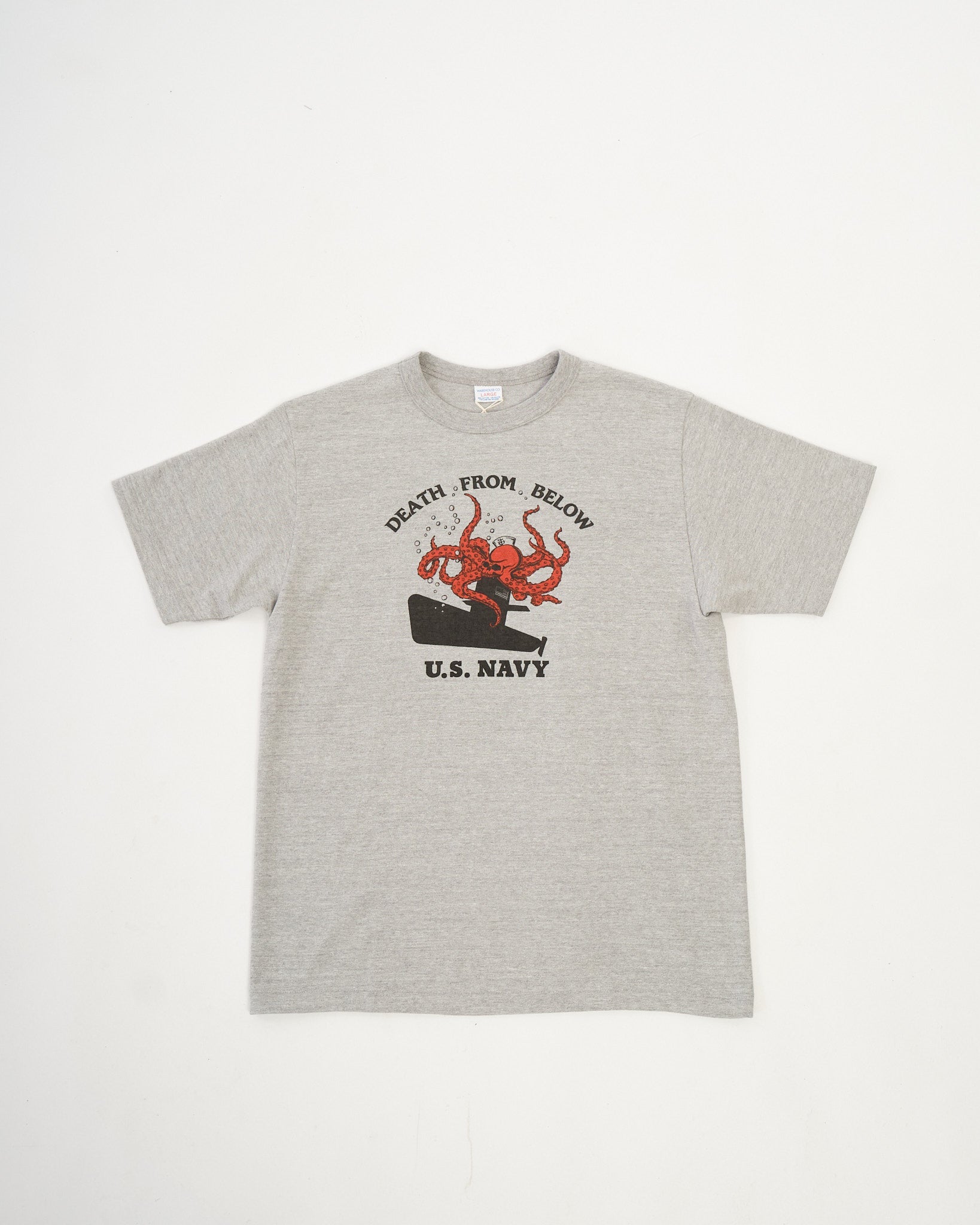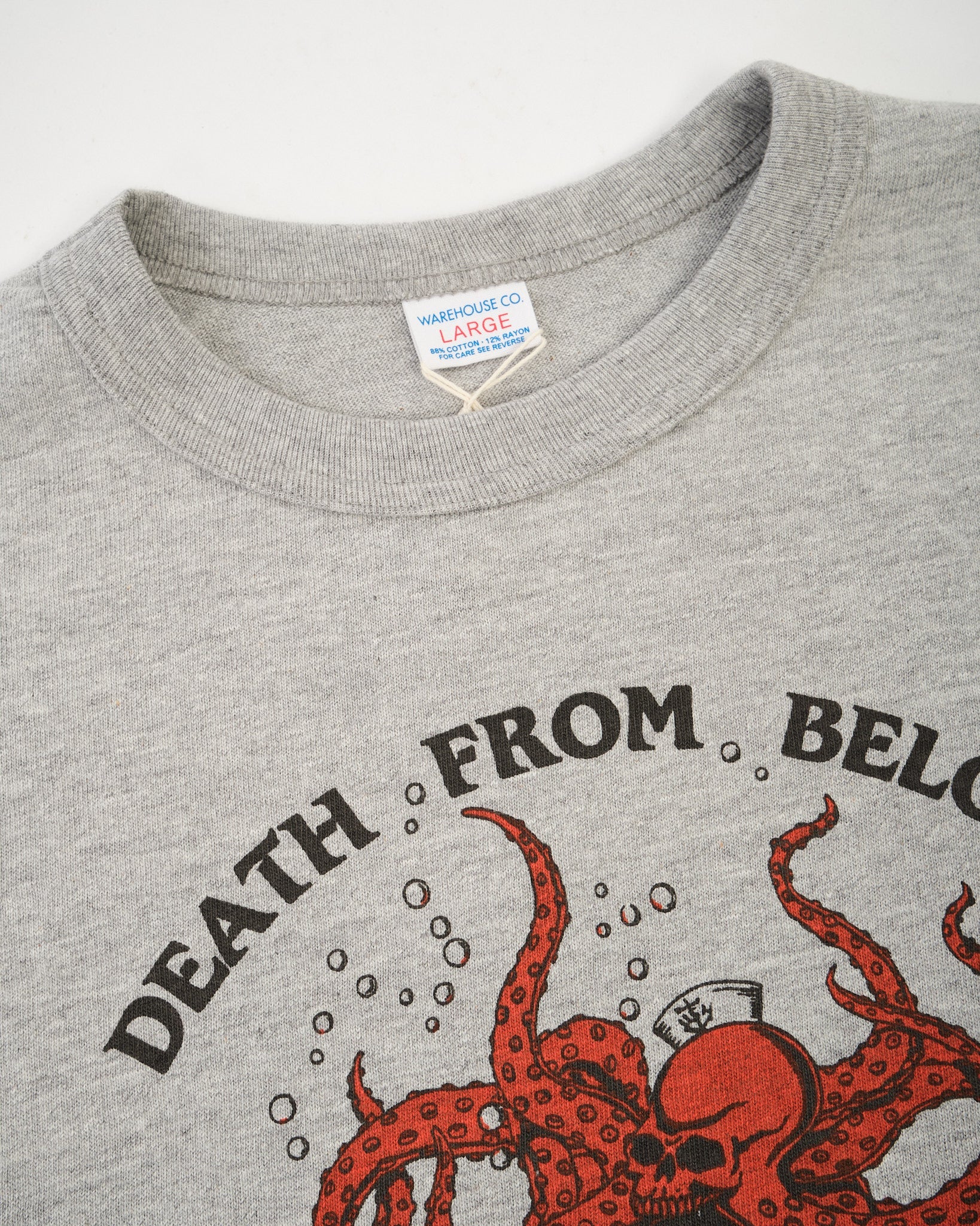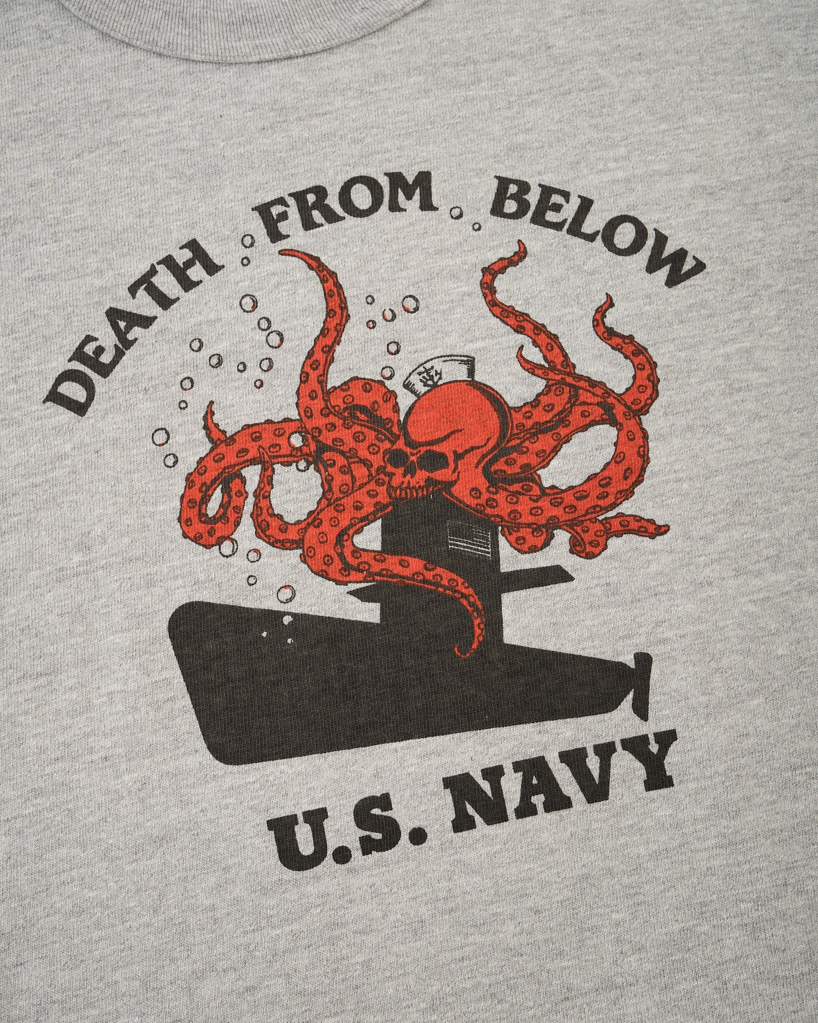The “Death From Below” graphic adds a bold, vintage-inspired touch rooted in military and collegiate sports heritage. With its soft heather texture and authentic fit, this piece captures the essence of true vintage athletic wear.