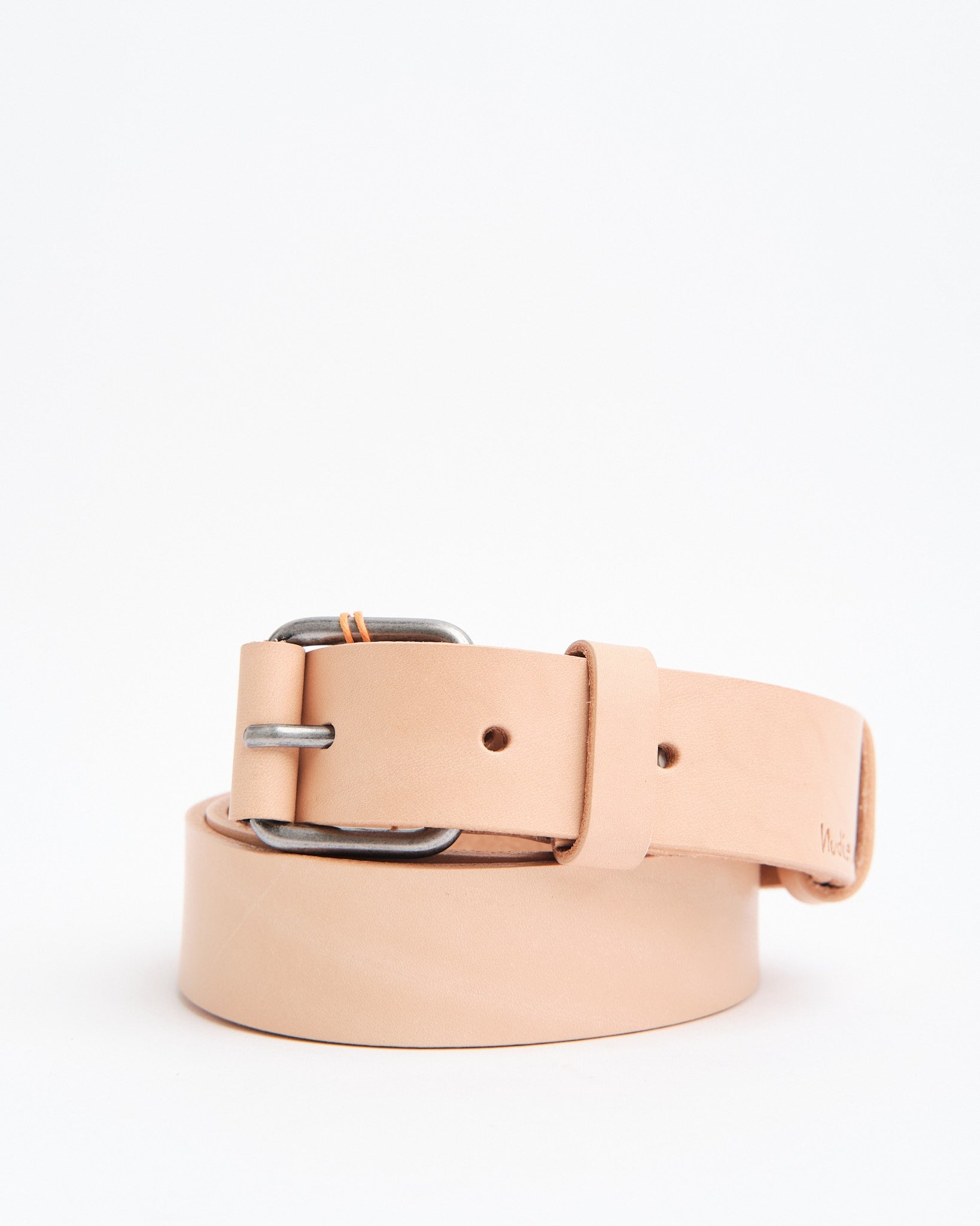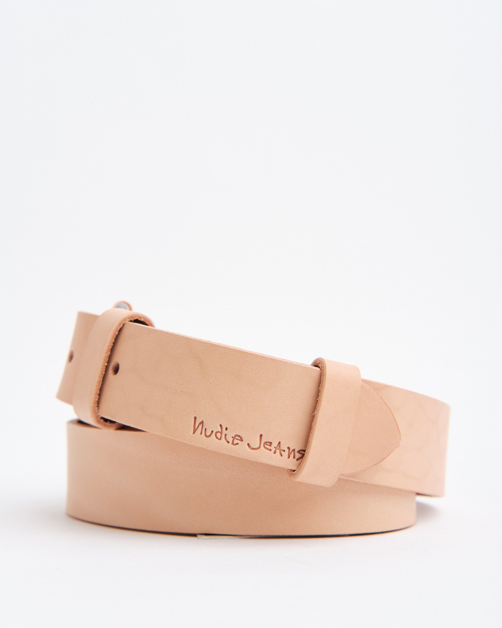 Dwayne lærbelte naturlig fra Nudie Jeans Co. Laget av vegetabilsk garvet fullnarvet lær som vil eldes vakkert. To løkker, metallspenne og Nudie Jeans preget logo. 100% lær og 28 mm bredde. Størrelsene er i cm. Laget i Polen.