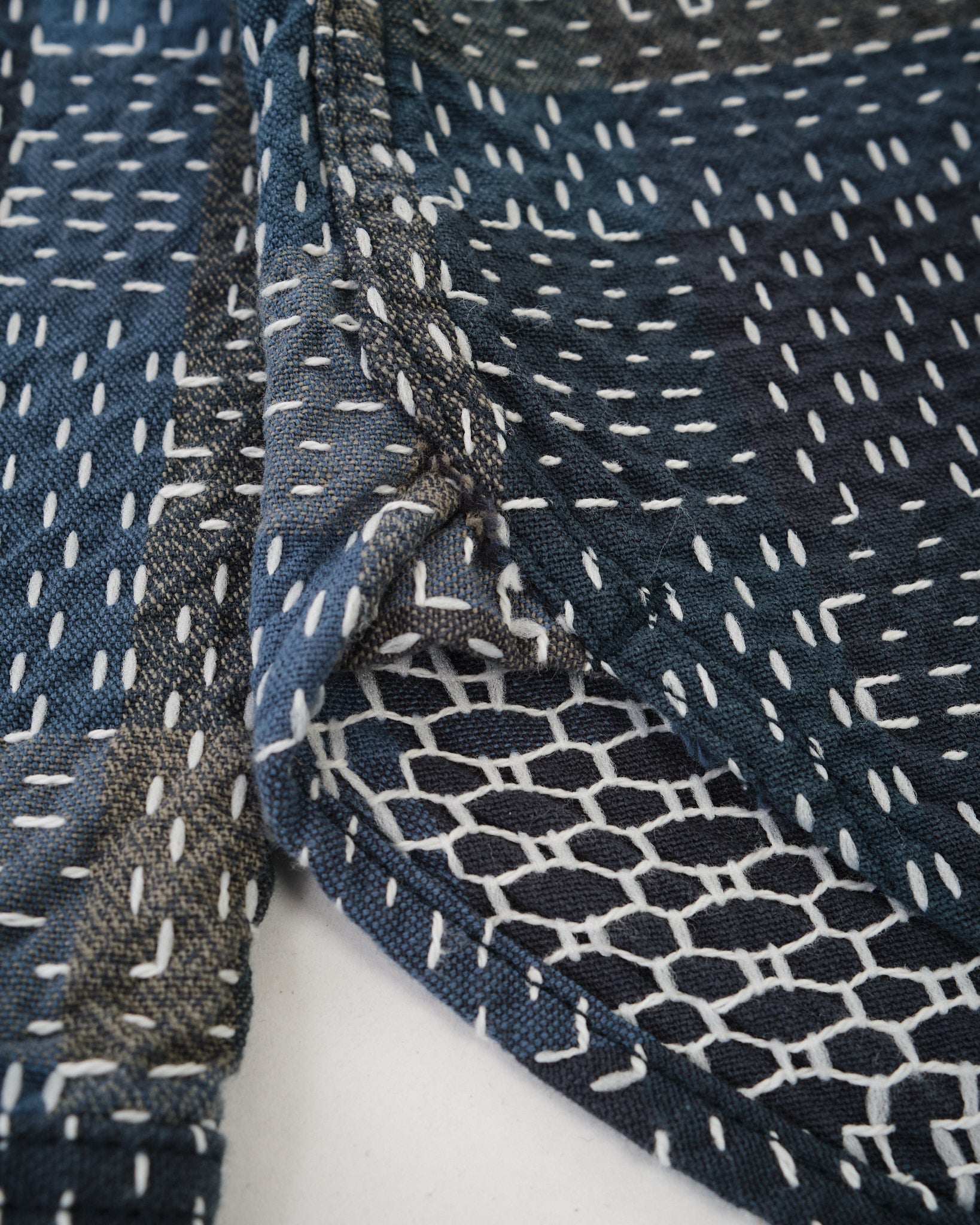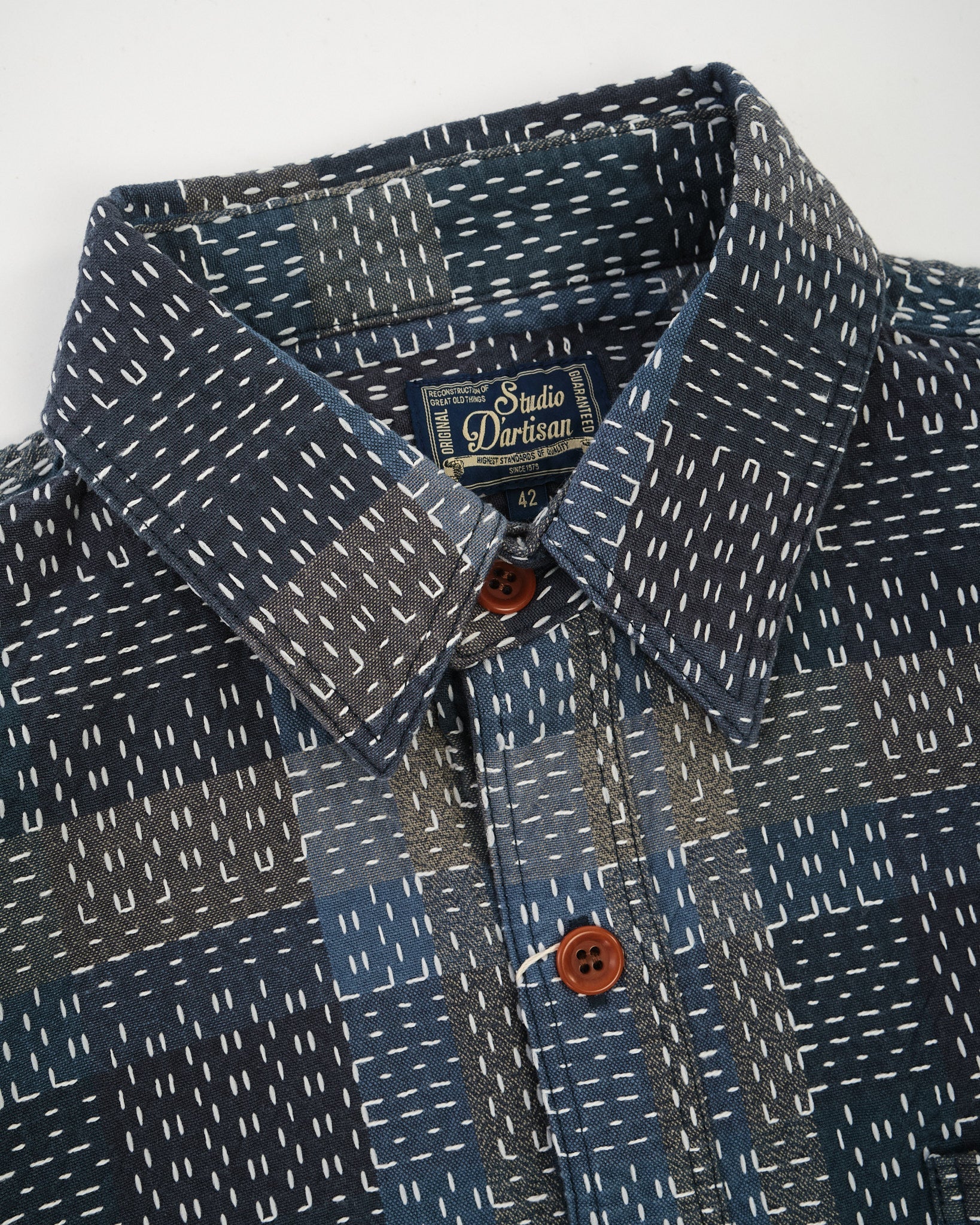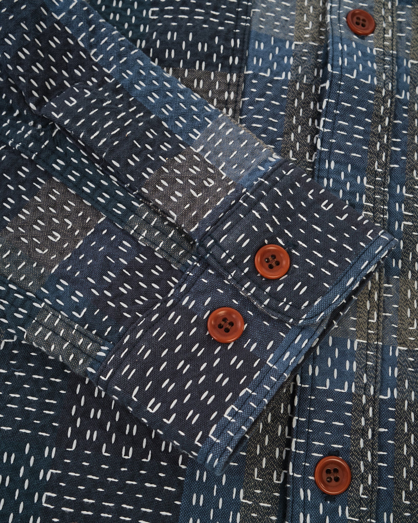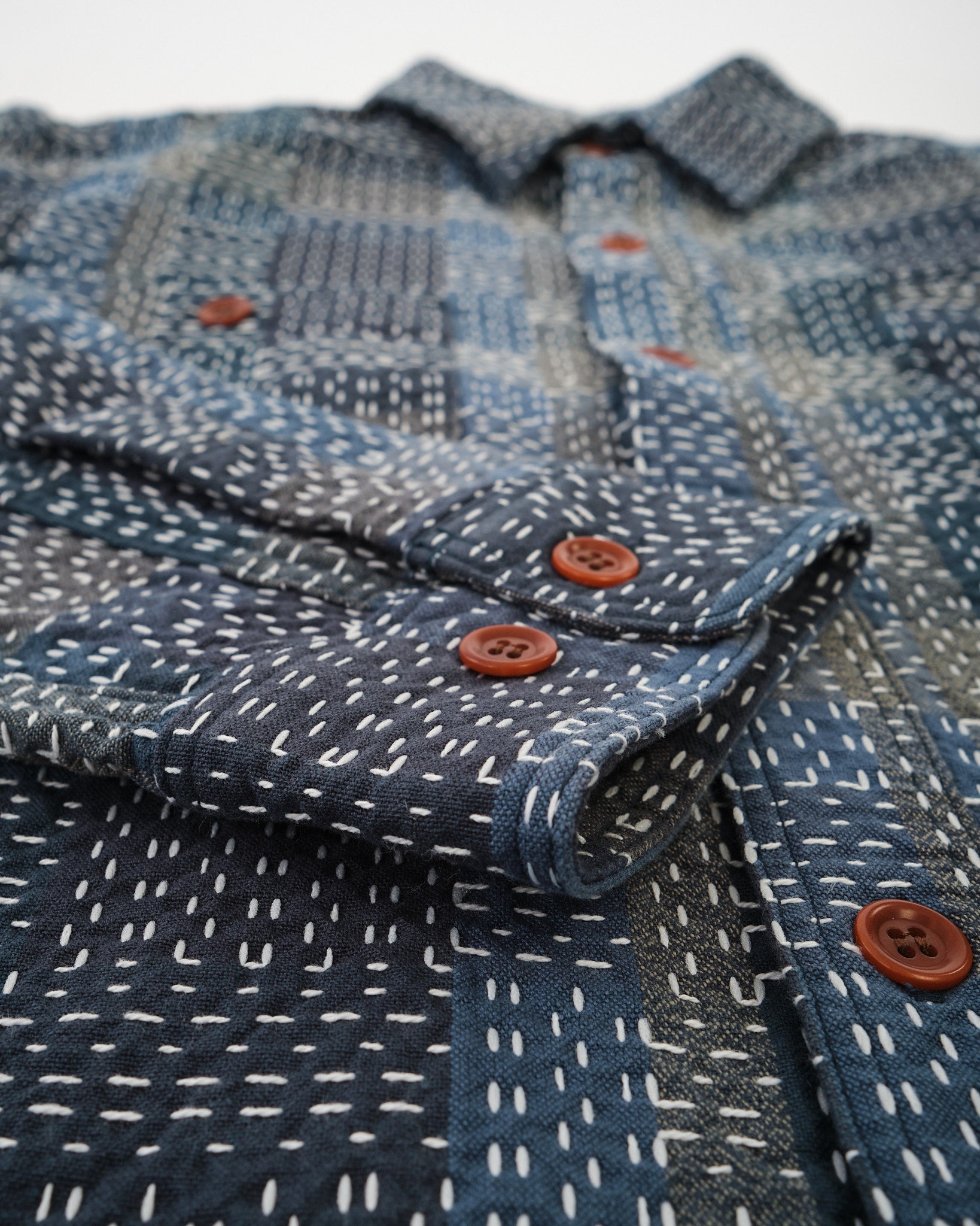 STUDIO D'ARTISAN Noragi Sashiko-skjorten (5651) er en moderne tolkning av tradisjonelt japansk arbeidstøy, inspirert av Noragi, de robuste plaggene som ble båret av arbeidere i tidligere århundrer. Designet med sashiko-søm som løper både vertikalt og horisontalt, viser denne skjorten frem en unik håndlaget estetikk som hedrer Japans rike tekstilarv.