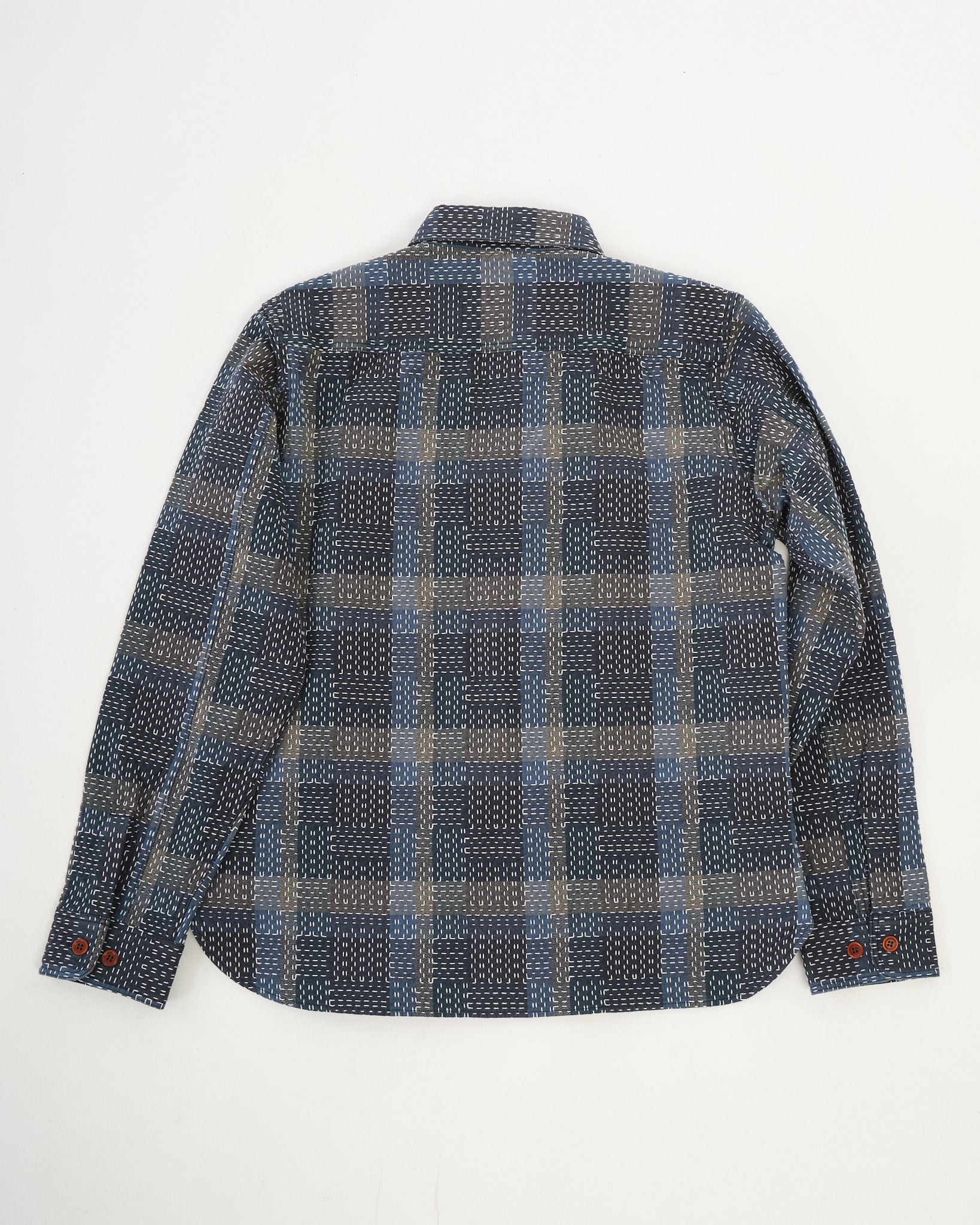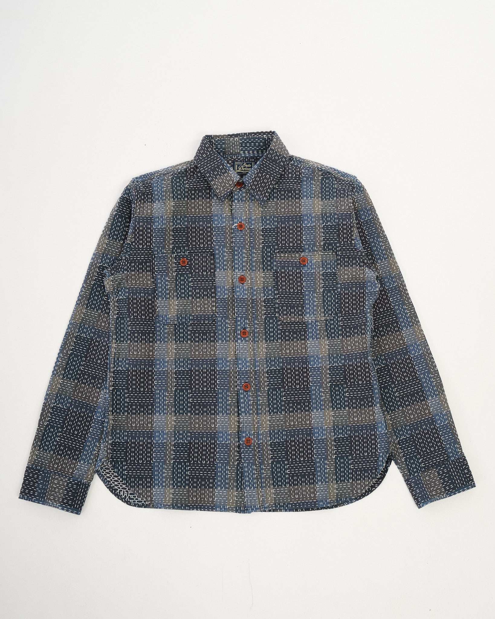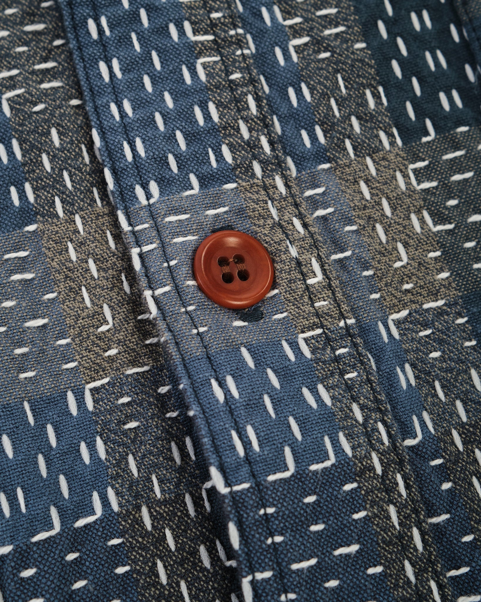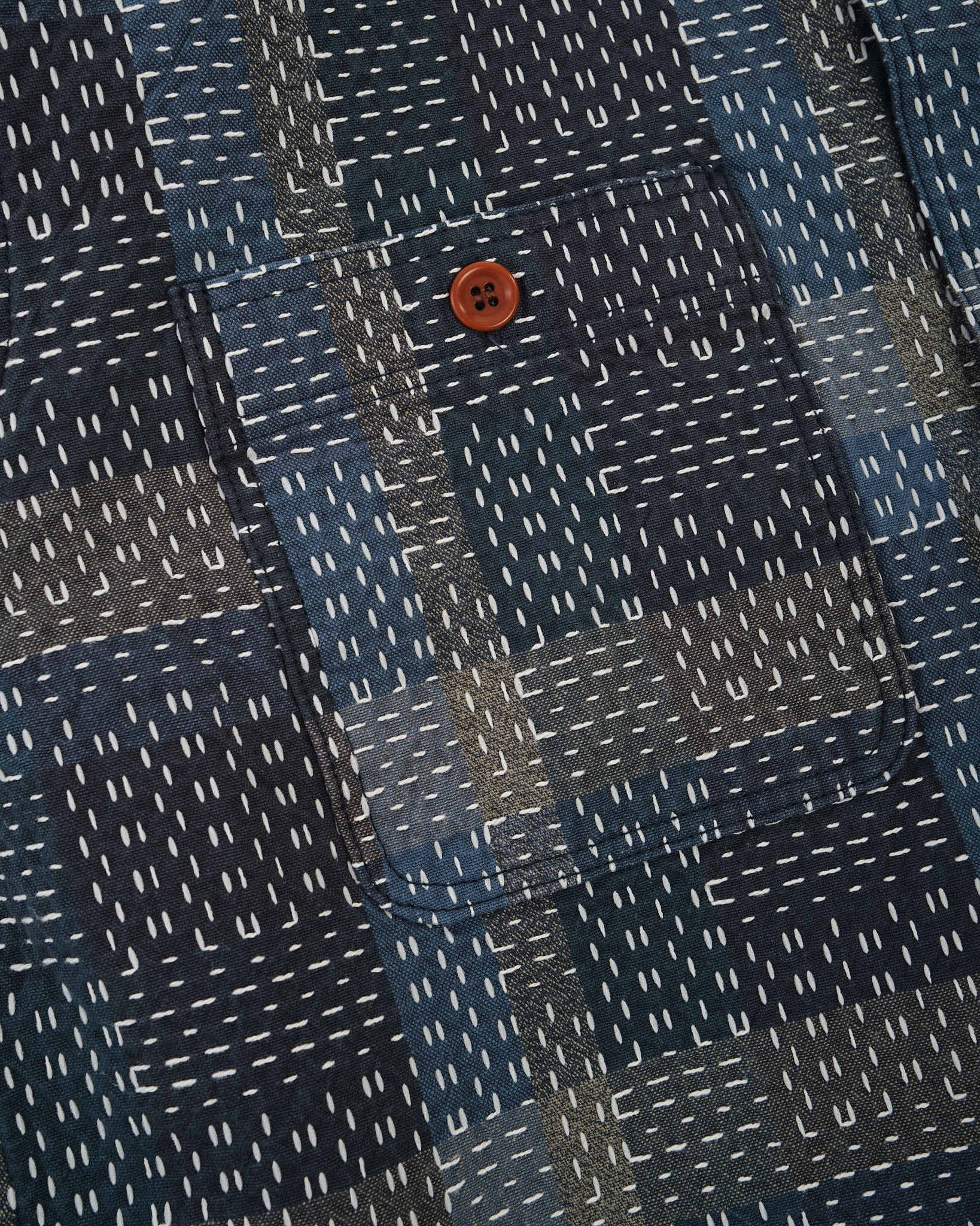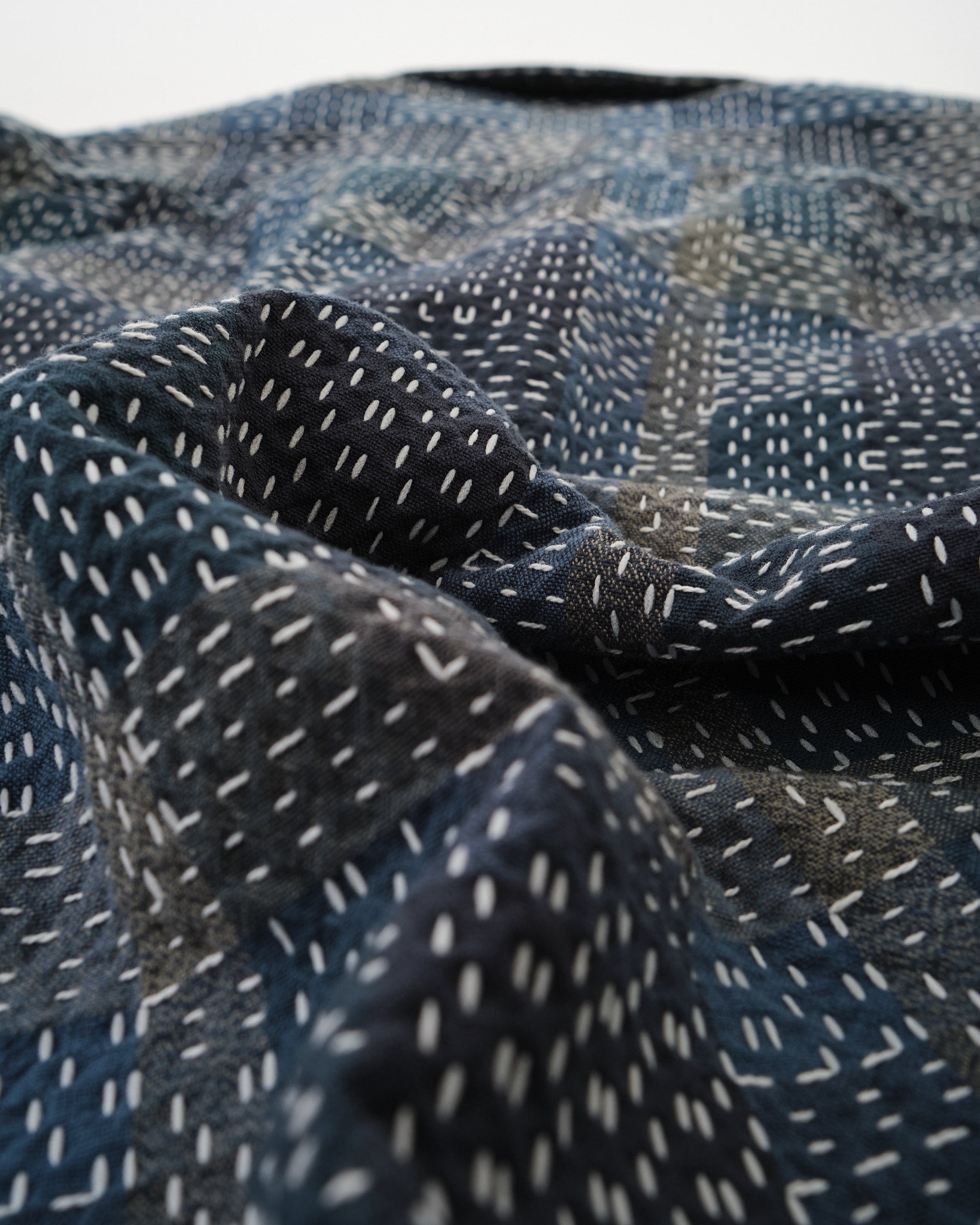 STUDIO D'ARTISAN Noragi Sashiko-skjorten (5651) er en moderne tolkning av tradisjonelt japansk arbeidstøy, inspirert av Noragi, de robuste plaggene som ble båret av arbeidere i tidligere århundrer. Designet med sashiko-søm som løper både vertikalt og horisontalt, viser denne skjorten frem en unik håndlaget estetikk som hedrer Japans rike tekstilarv.