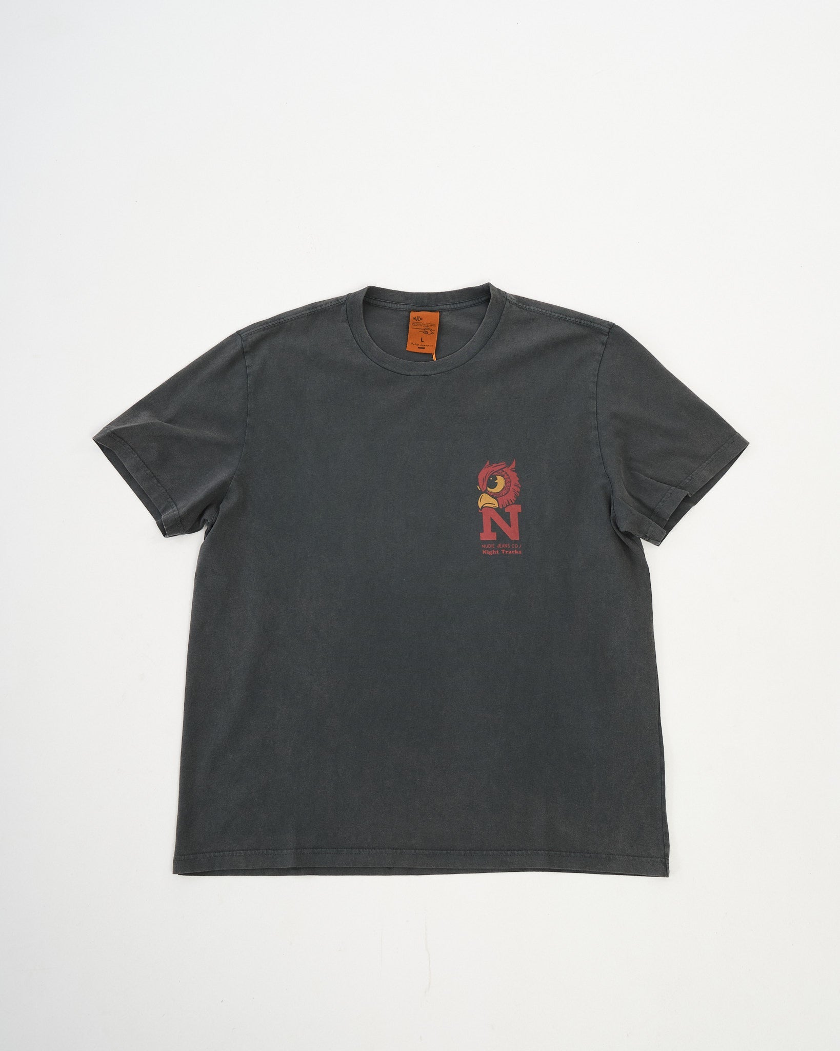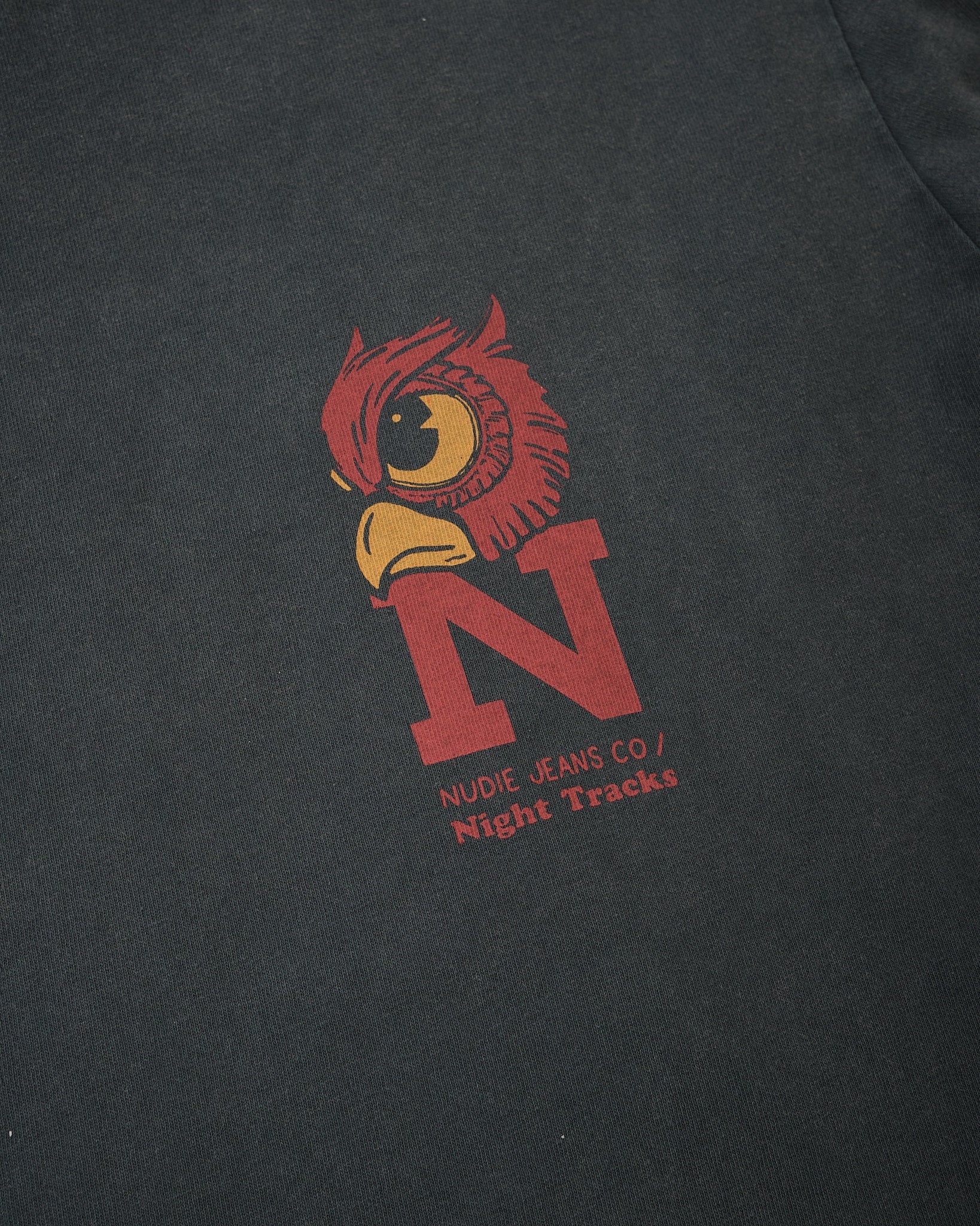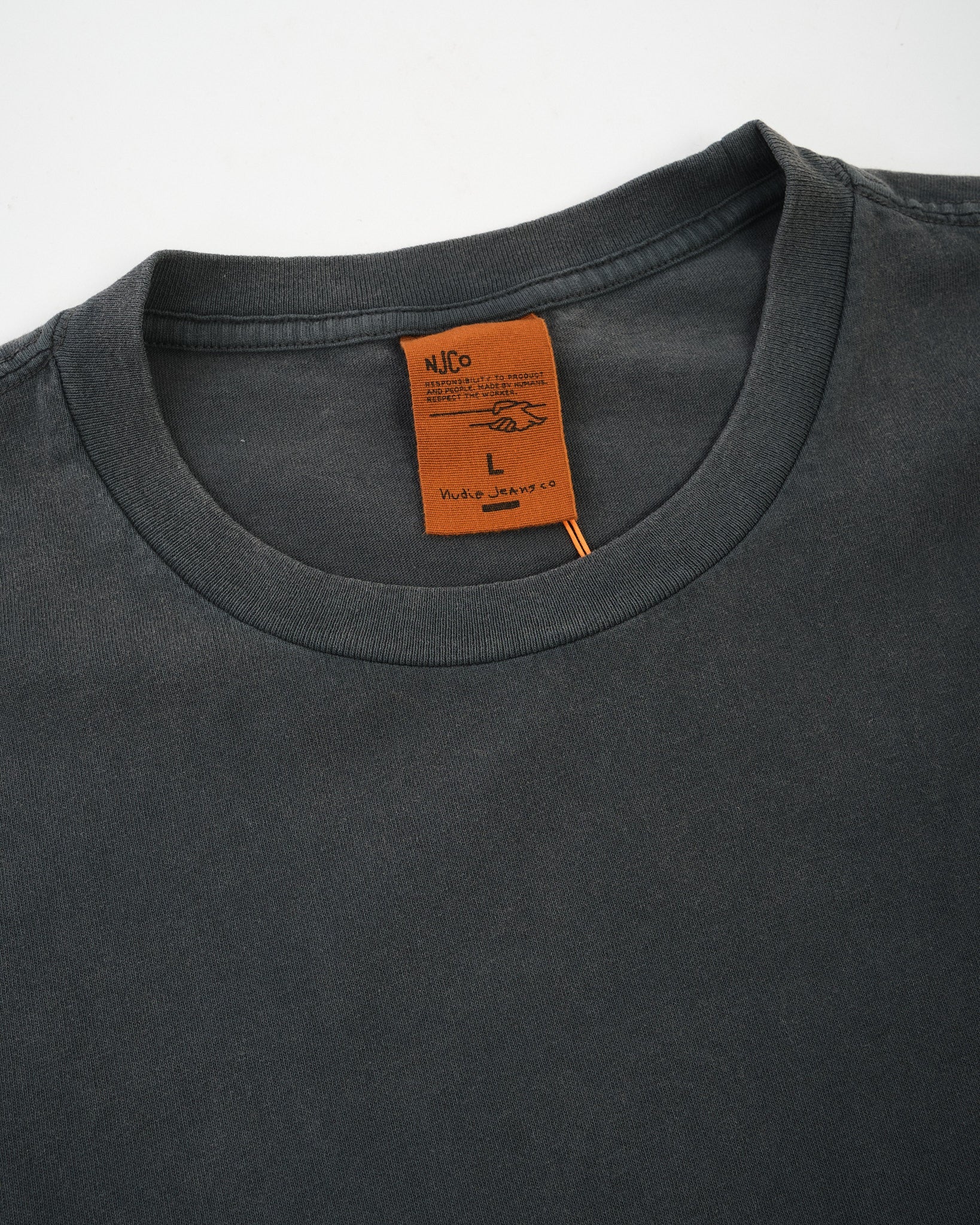 Roy Night Tracks-T-skjorten i antrasitt tar en godt slitt favoritt og gjør den akkurat passe skarp. Laget av økologisk bomull med åpent ende garn for en subtilt røff tekstur, er den plaggfarget og falmet for en perfekt innlevd følelse. Et brysttrykk tilfører en stille identitet, mens den vanlige passformen og ribbet mannskapshals holder ting komfortabelt klassisk. Enten den er lagdelt eller båret solo, håndterer denne t-skjorten fritidskledning med letthet og selvtillit.