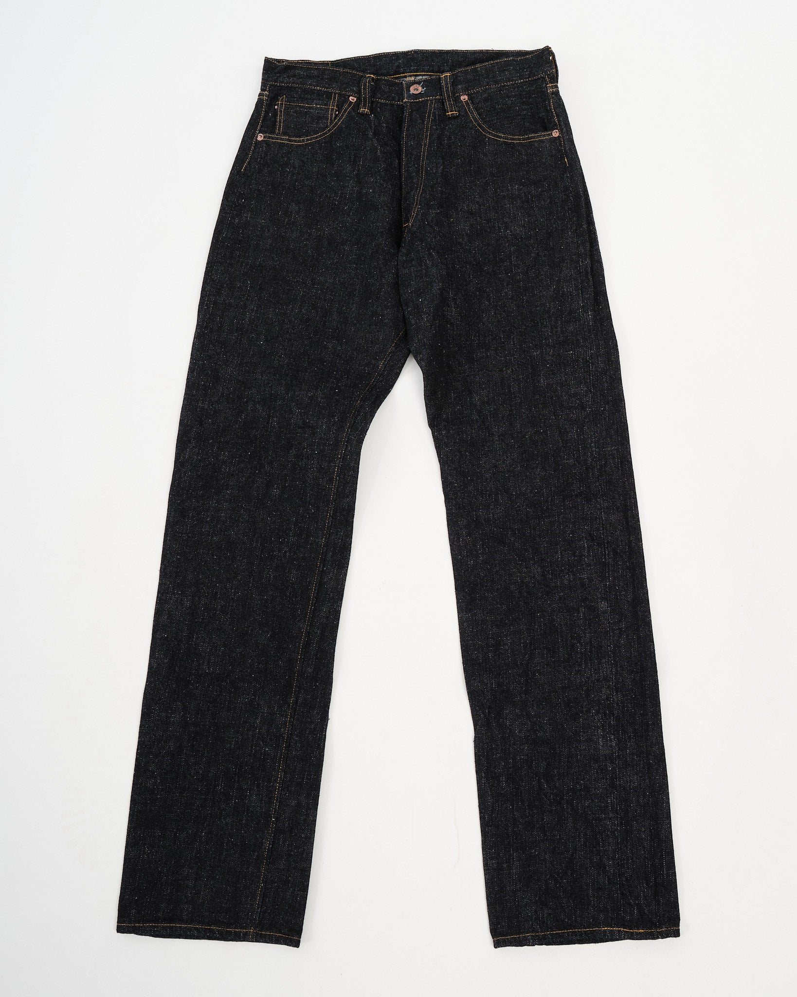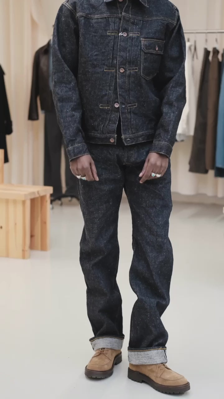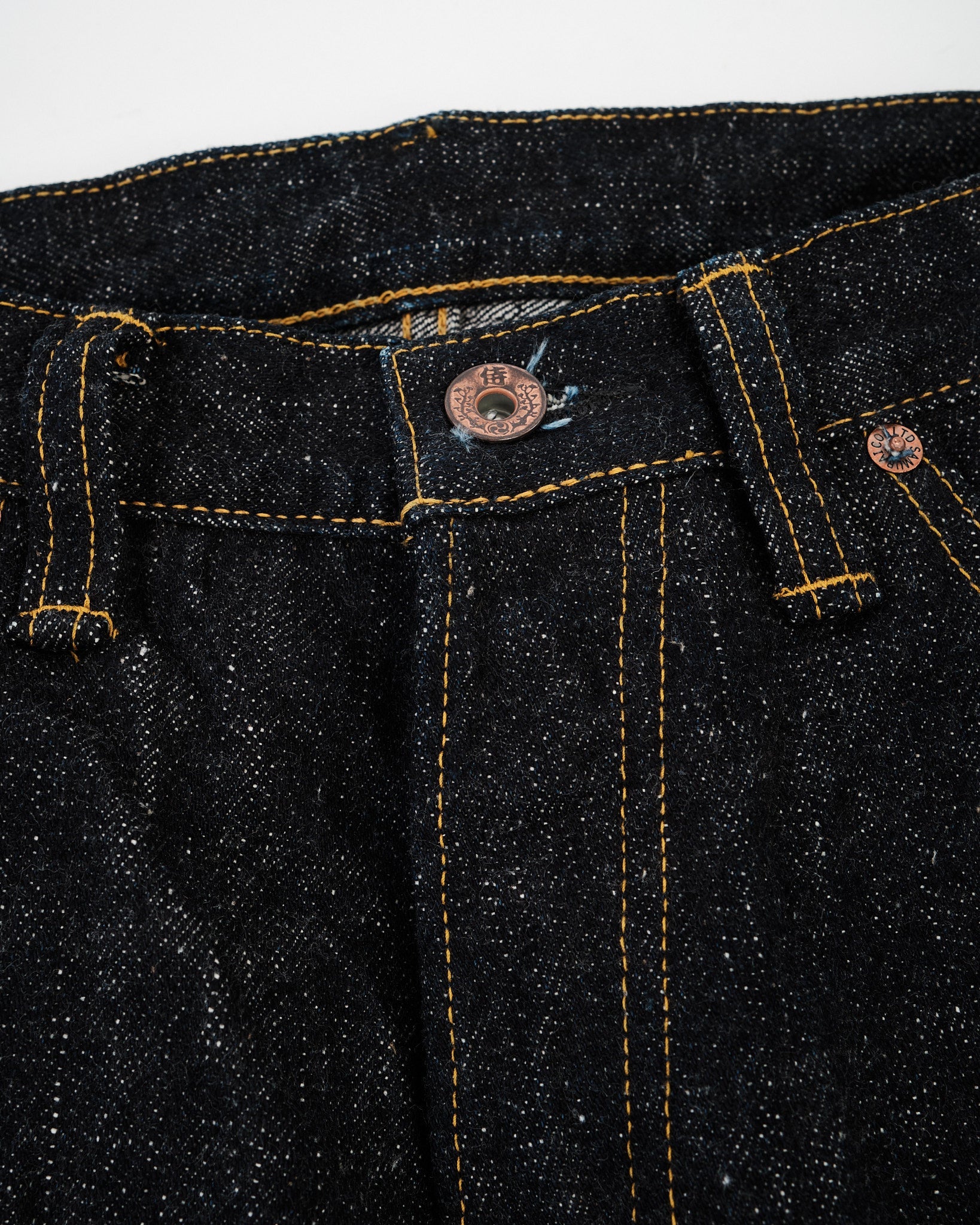 Details carry Samurai’s signature historical flair: the buttons are newly crafted iron with a “sentoku”-inspired finish, recalling the lacquered copper tones of traditional Japanese tea ceremony utensils. With use, the surface patinates into a subdued, beautiful sheen. Reinforced with copper Samurai Co rivets and 8oz slubby denim pocket bags, the build is made to withstand heavy wear.