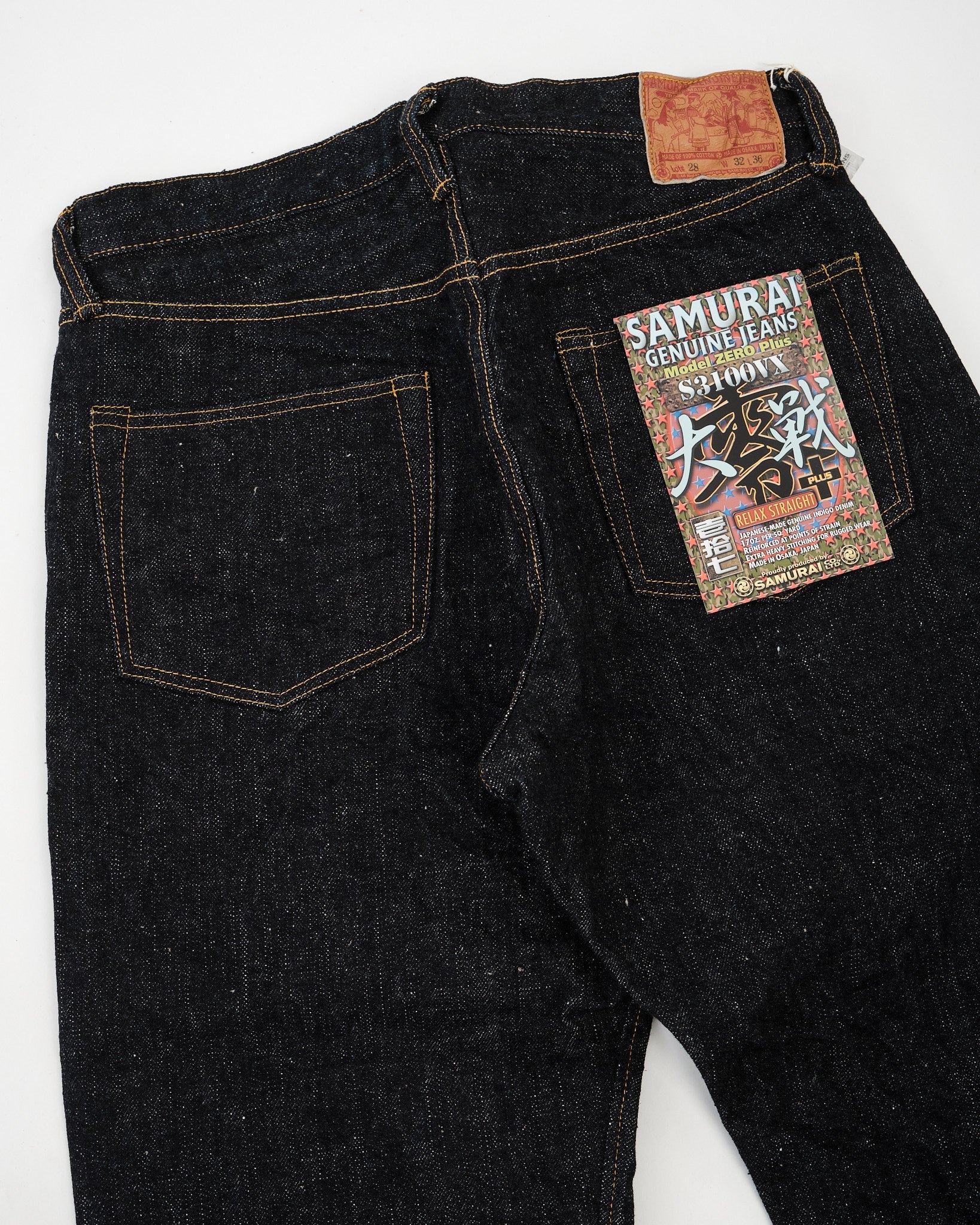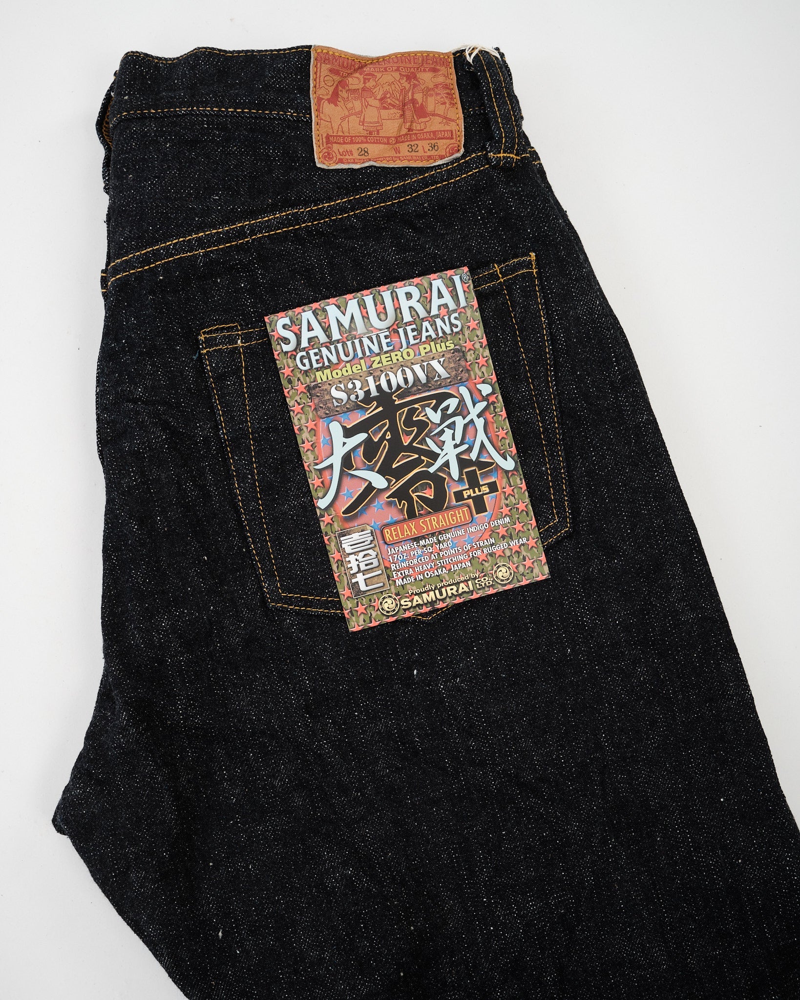 Each pair includes an exclusive flasher, a commemorative leather patch, and an initial serial number, making it both a rugged garment and a collectible piece of Samurai heritage. A wide, relaxed fit that stays true to wartime denim roots — tough, practical, and timeless.