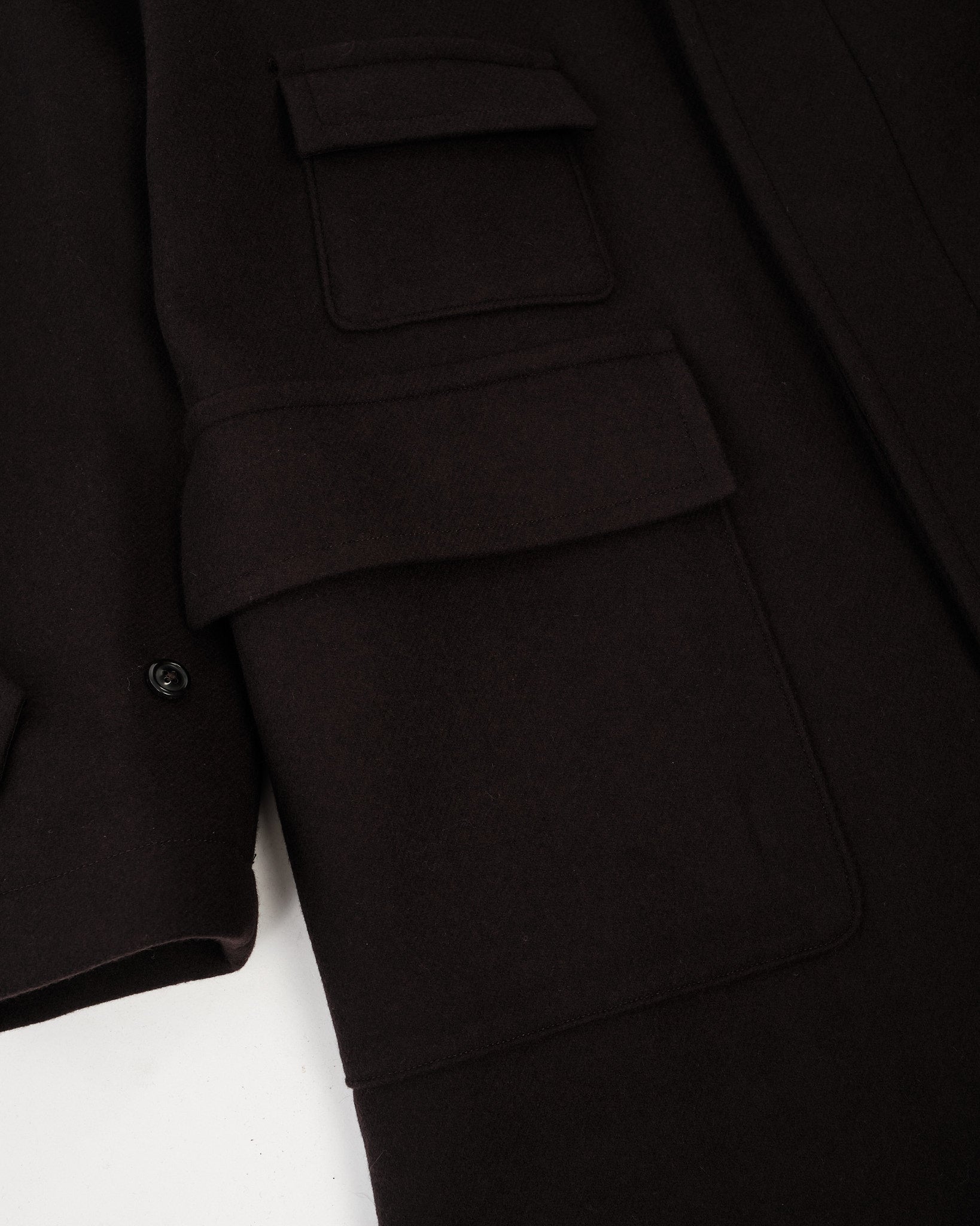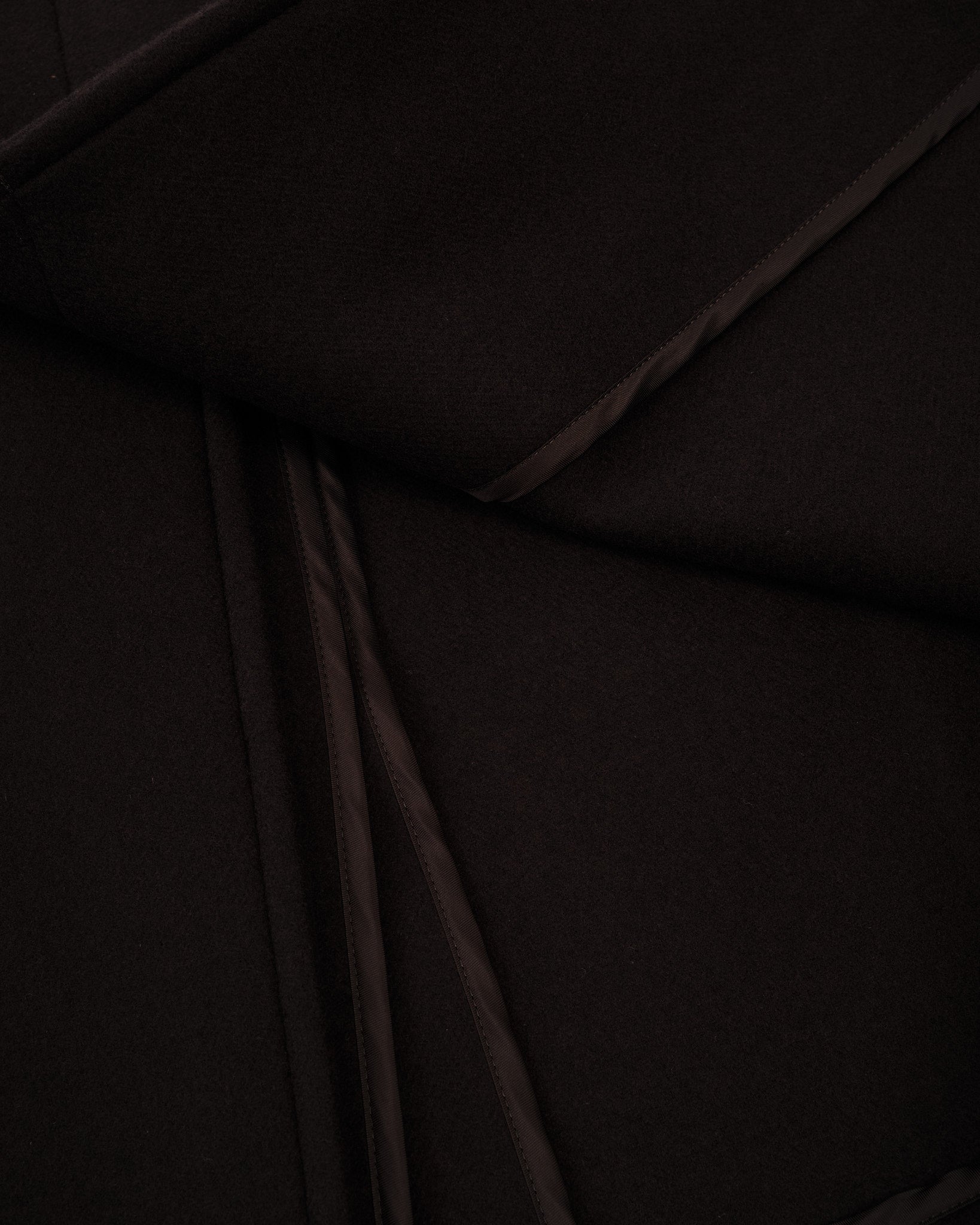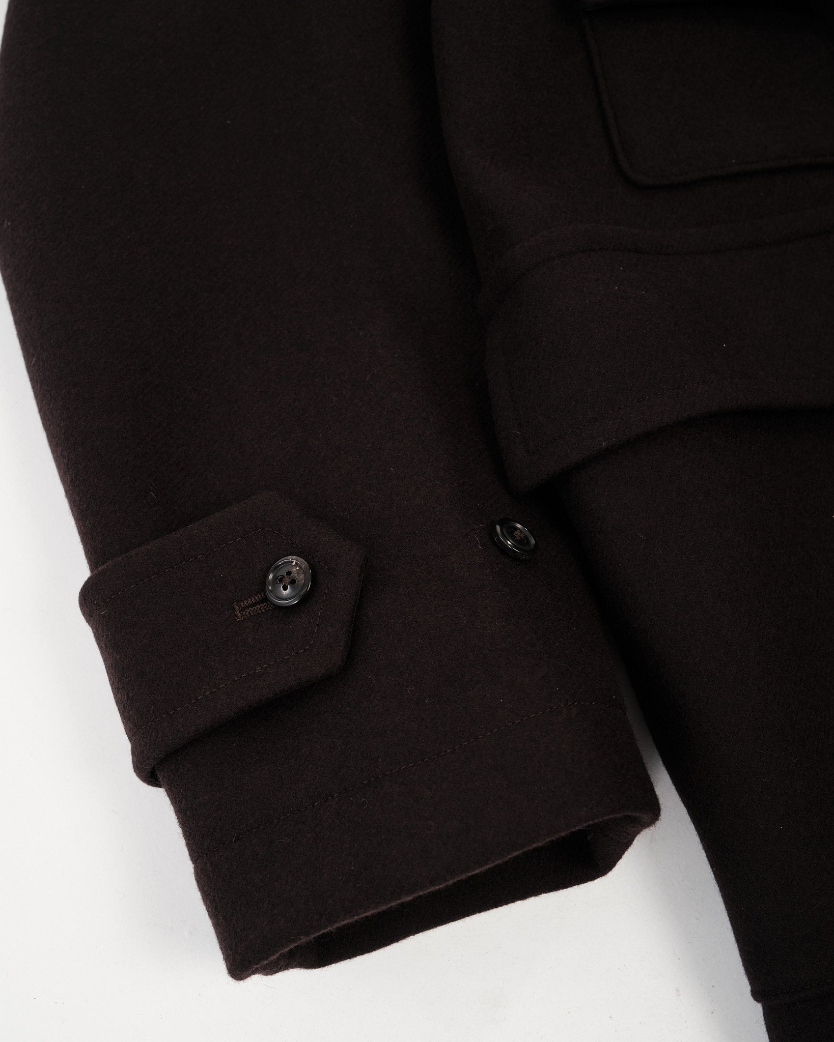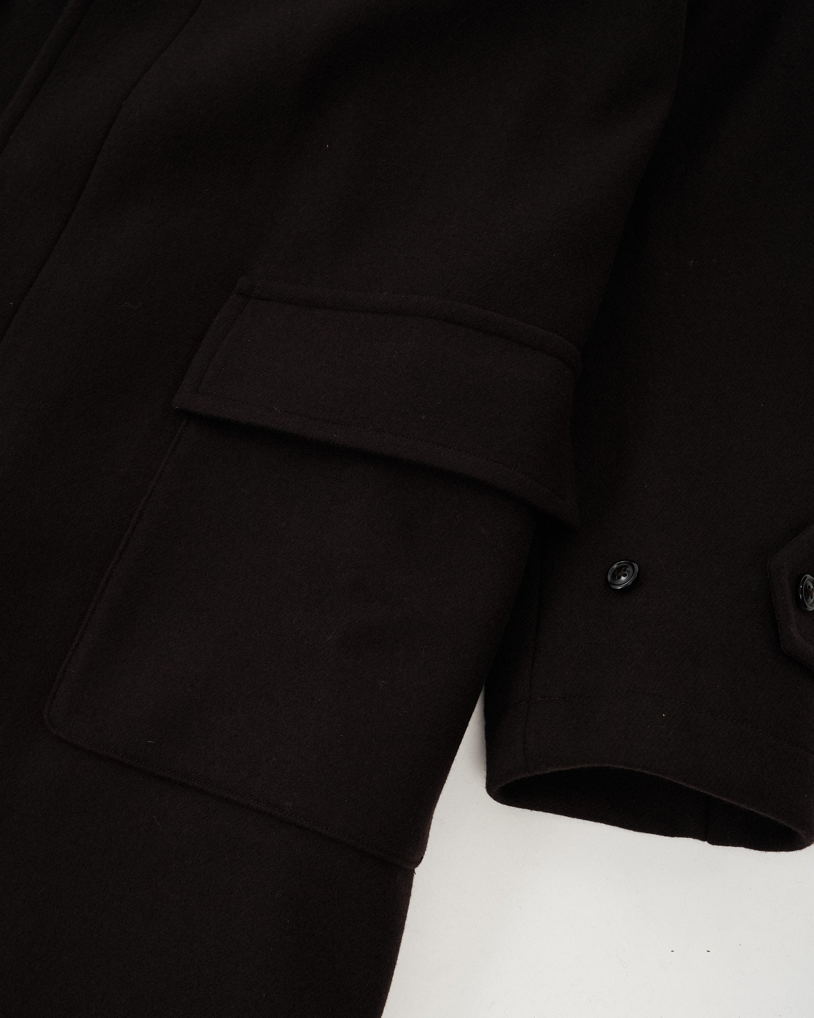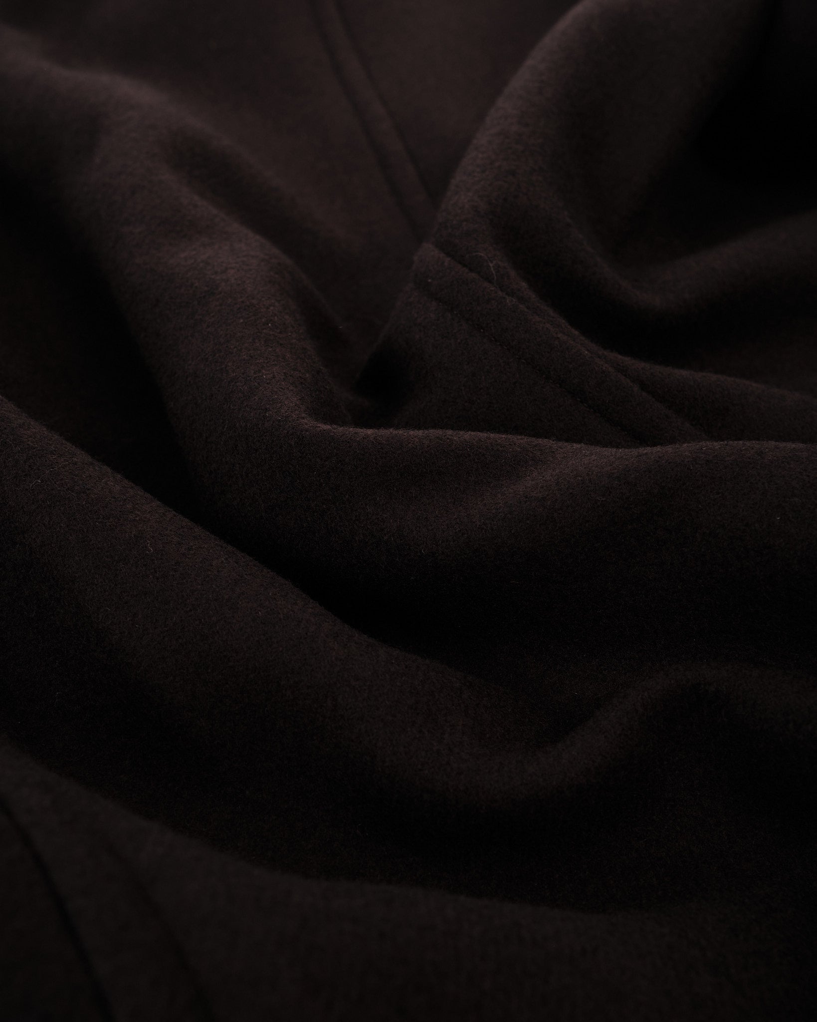 The KAPTAIN SUNSHINE Traveller Coat (KS25FCO03) i Brun kombinerer luksus og funksjonalitet sømløst. Laget av et dobbelstoff melton i revers, er denne kåpen vevd med ultrafine 16,5-mikron Super140’s ullfibre, som tilbyr den perfekte balansen av fasthet og letthet. Stoffet er farget med bomull for å oppnå en rik, dyp farge, mens den tette vevingen sikrer mykhet, glans, og elegant smidig tekstur.