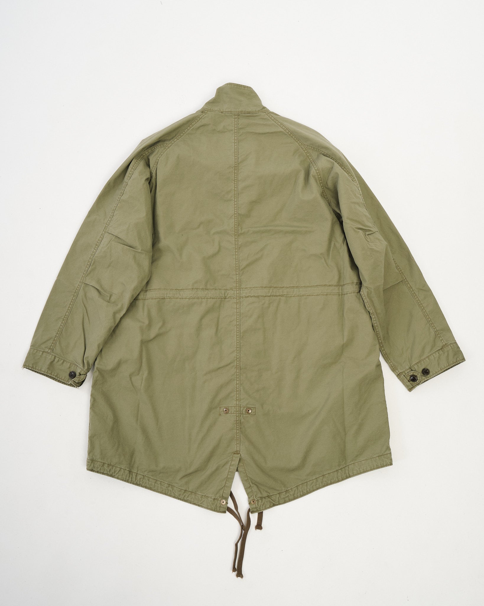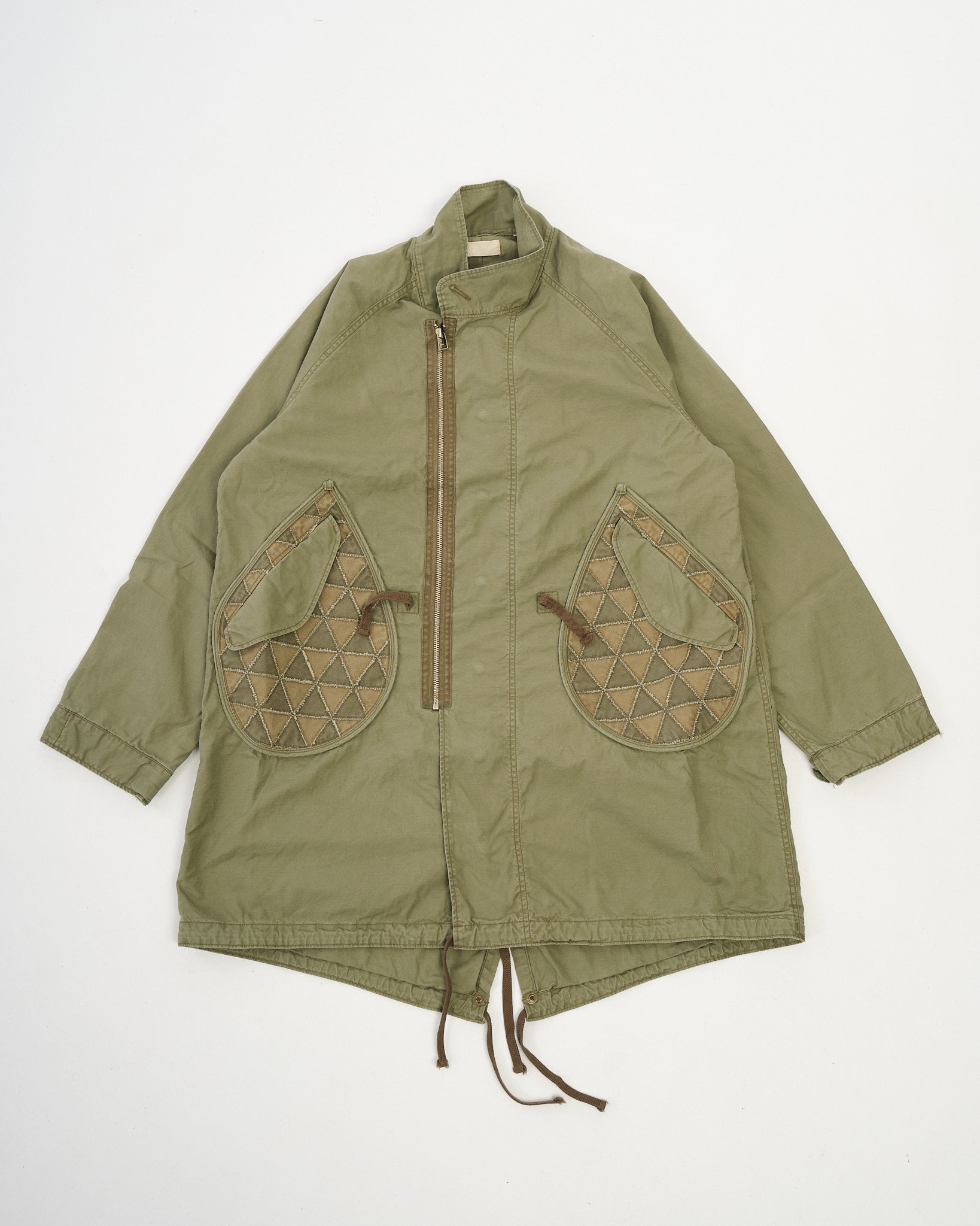 Designet med en fiskehalekant, tar dette plagget inspirasjon fra vintage militære parkaser samtidig som det inkorporerer tsugihagi (lappearbeid) detaljer, noe som gir den en unik tekstur og dybde. Den olivenfargede fargeveien forsterker dens robuste estetikk, noe som gjør den til et perfekt lagdelingsplagg for overgangssesonger. Laget i Japan, legemliggjør den presis håndverkskunst med et unikt, arvinspirert utseende.