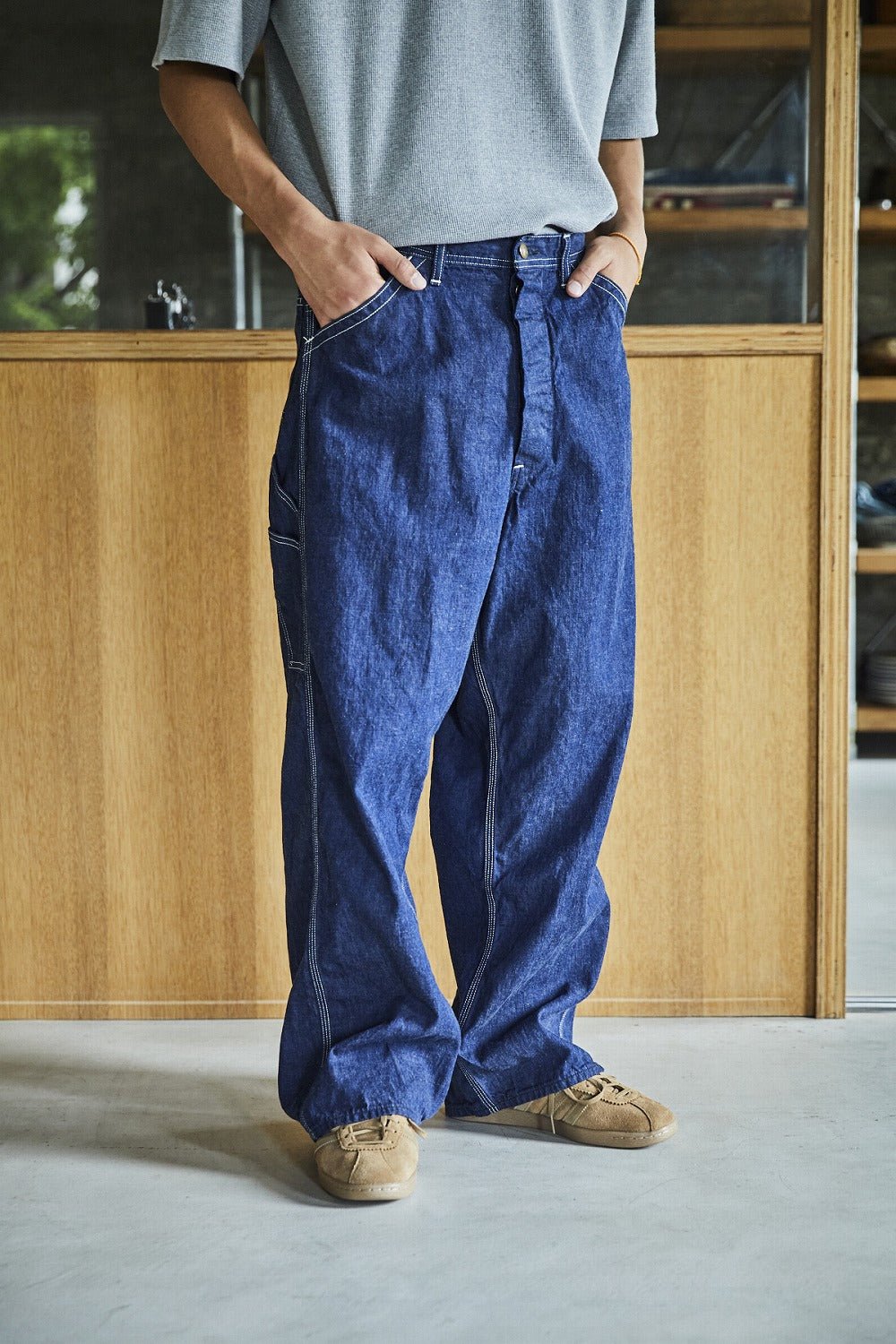 Med sin brede beinsilhuett, trippelsydde sømmer, og verktøyklare detaljer som hammerløkken og overdimensjonerte baklommer, forblir disse buksene tro mot sine røtter uten å føles som et kostyme. Den en-vask finishen gir dem en myk berøring rett fra dag én samtidig som de bevarer struktur og dybde.