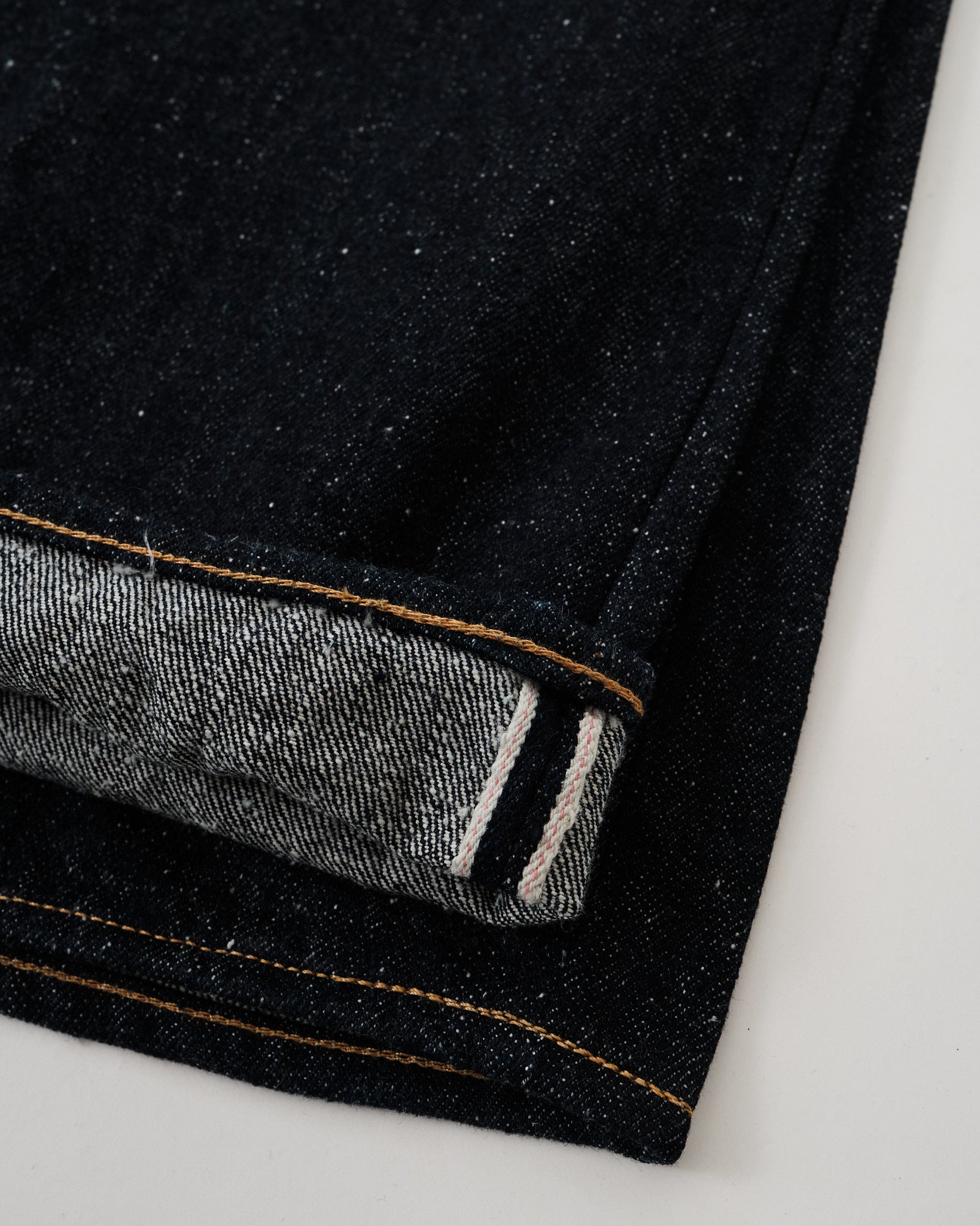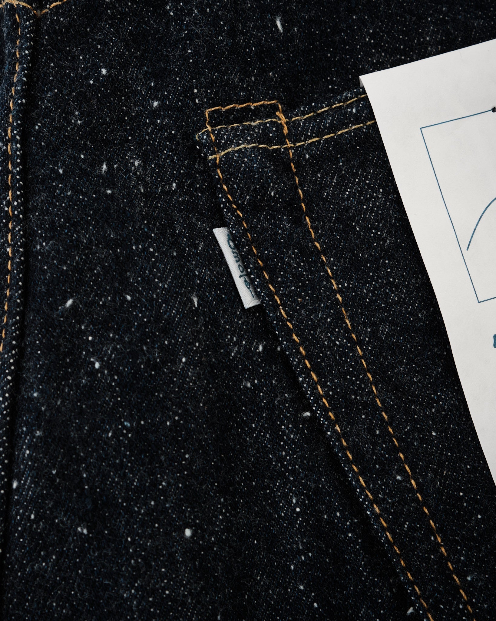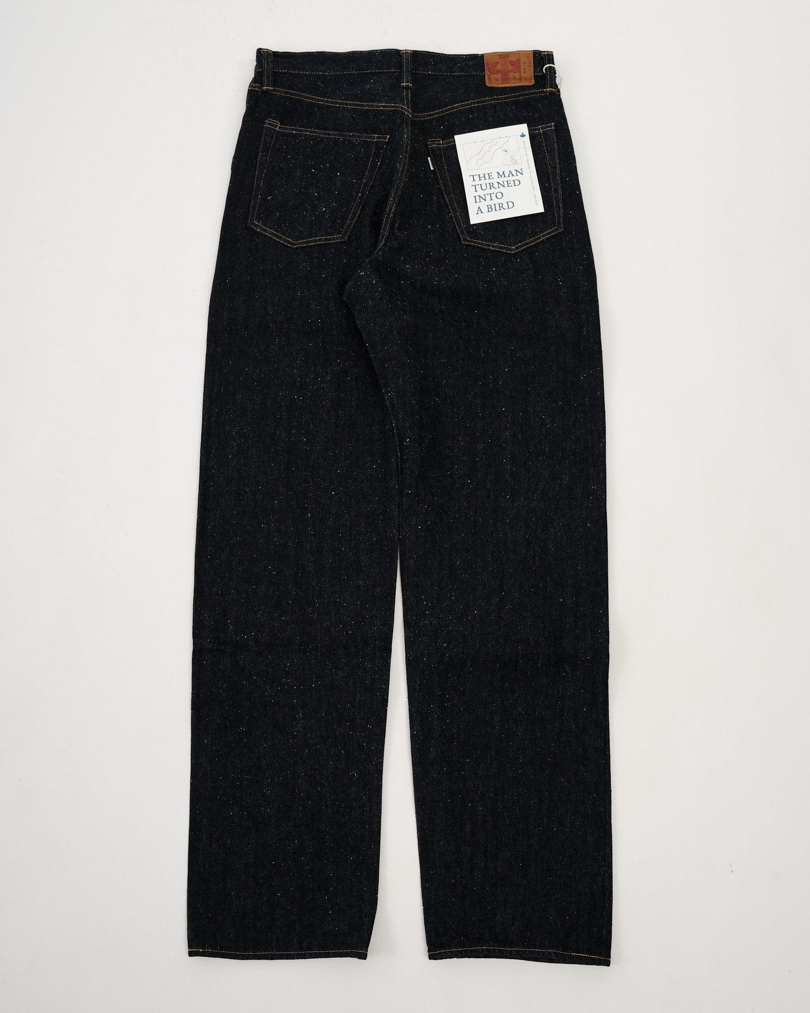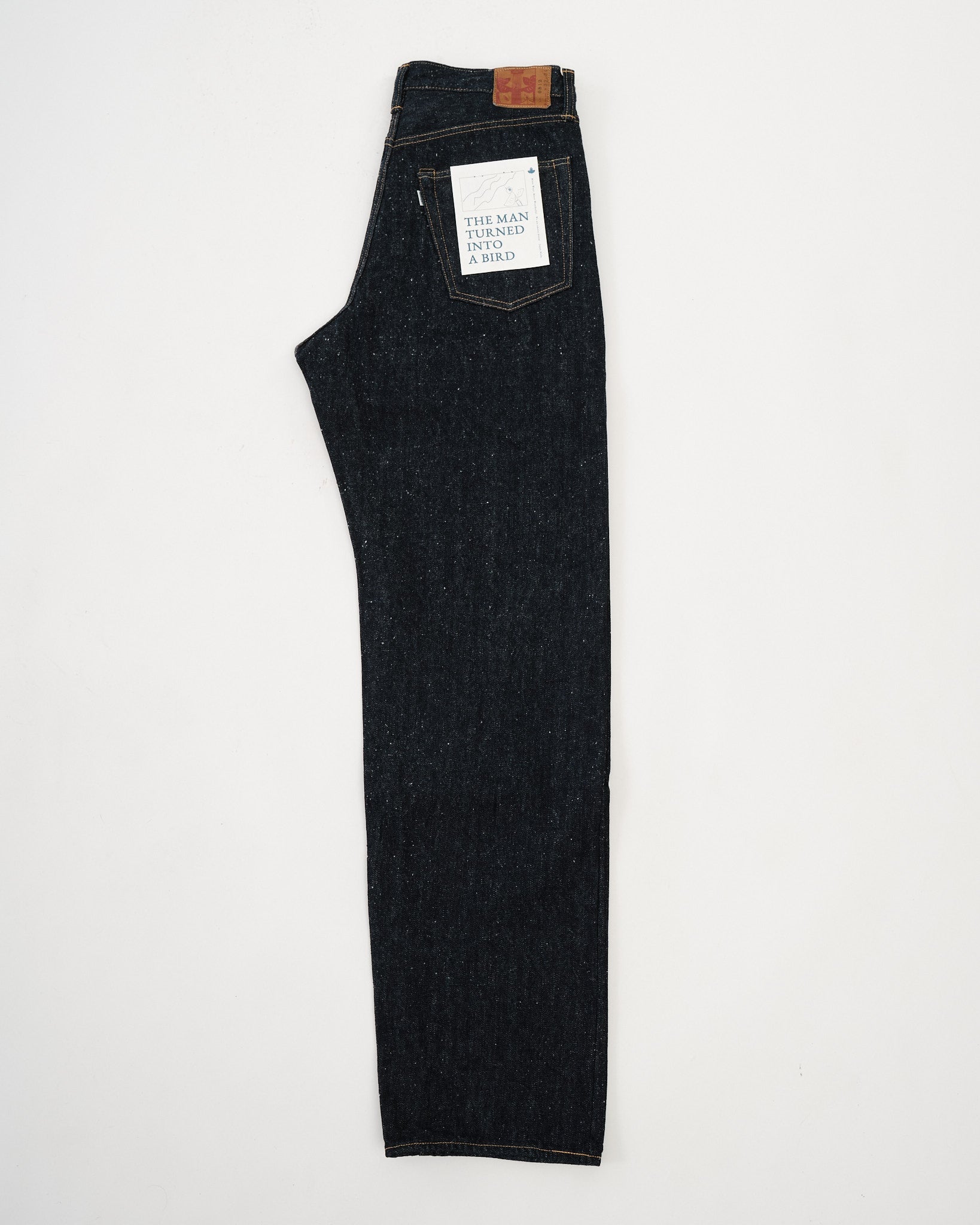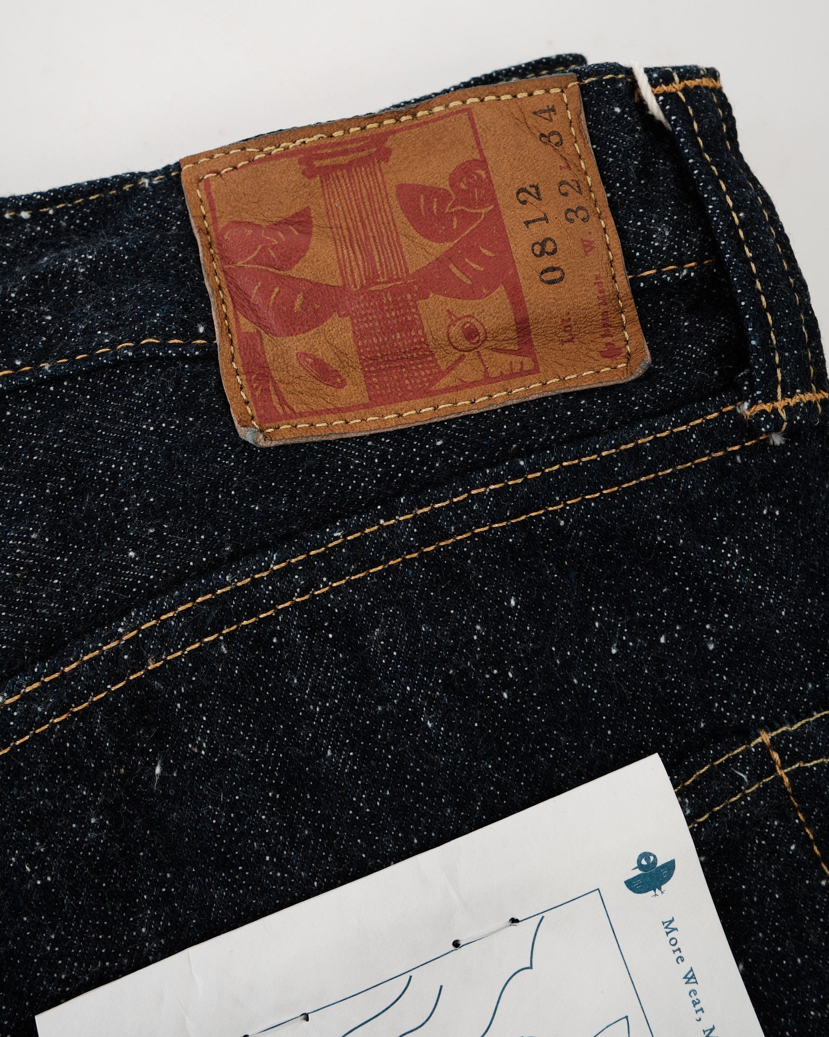 Style number: 0812 16oz nep denim with a textured, vintage-inspired finish Warp yarns blend short cotton fibers for a rugged, uneven look Weft yarns spun using the "gara-bo" technique for a rustic, hand-spun feel Rope-dyed with 100% pure indigo for deep, high-contrast fades over time Woven on a 1950s GL8 Toyoda Automatic Loom for a breathable, textured structure Unsanforized but rinsed to preserve raw texture while ensuring comfort OMOTO’s blue-green “MIMI” selvedge for an authentic denim detail Custom-branded sheep leather patch for a premium touch Hidden rivets & raised belt loops for added durability Herringbone pocket bag with washing record for vintage authenticity
