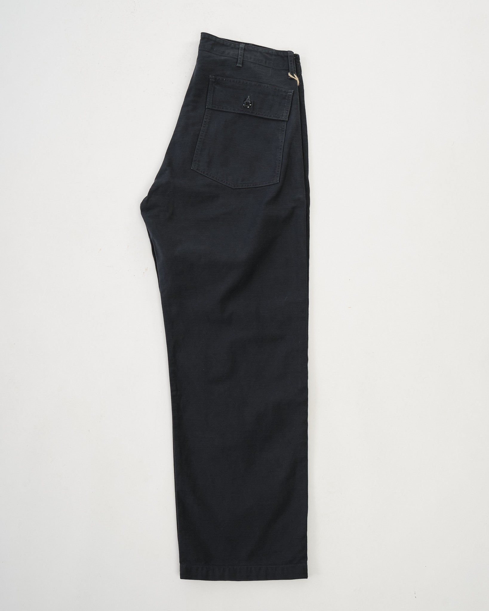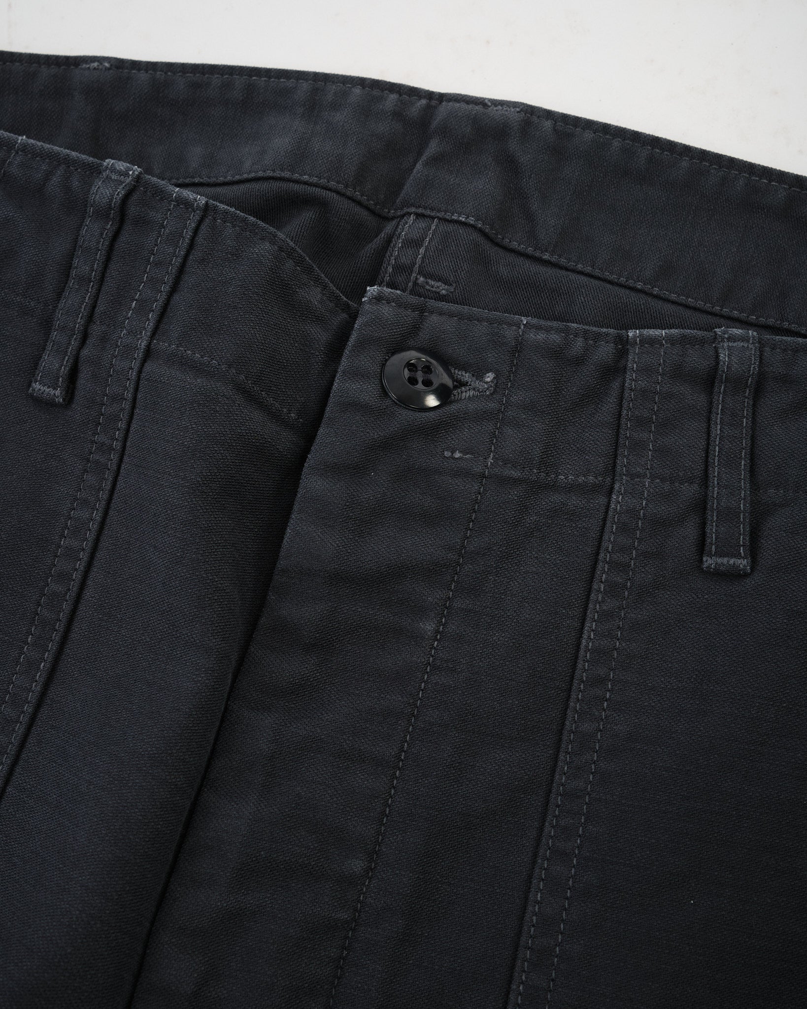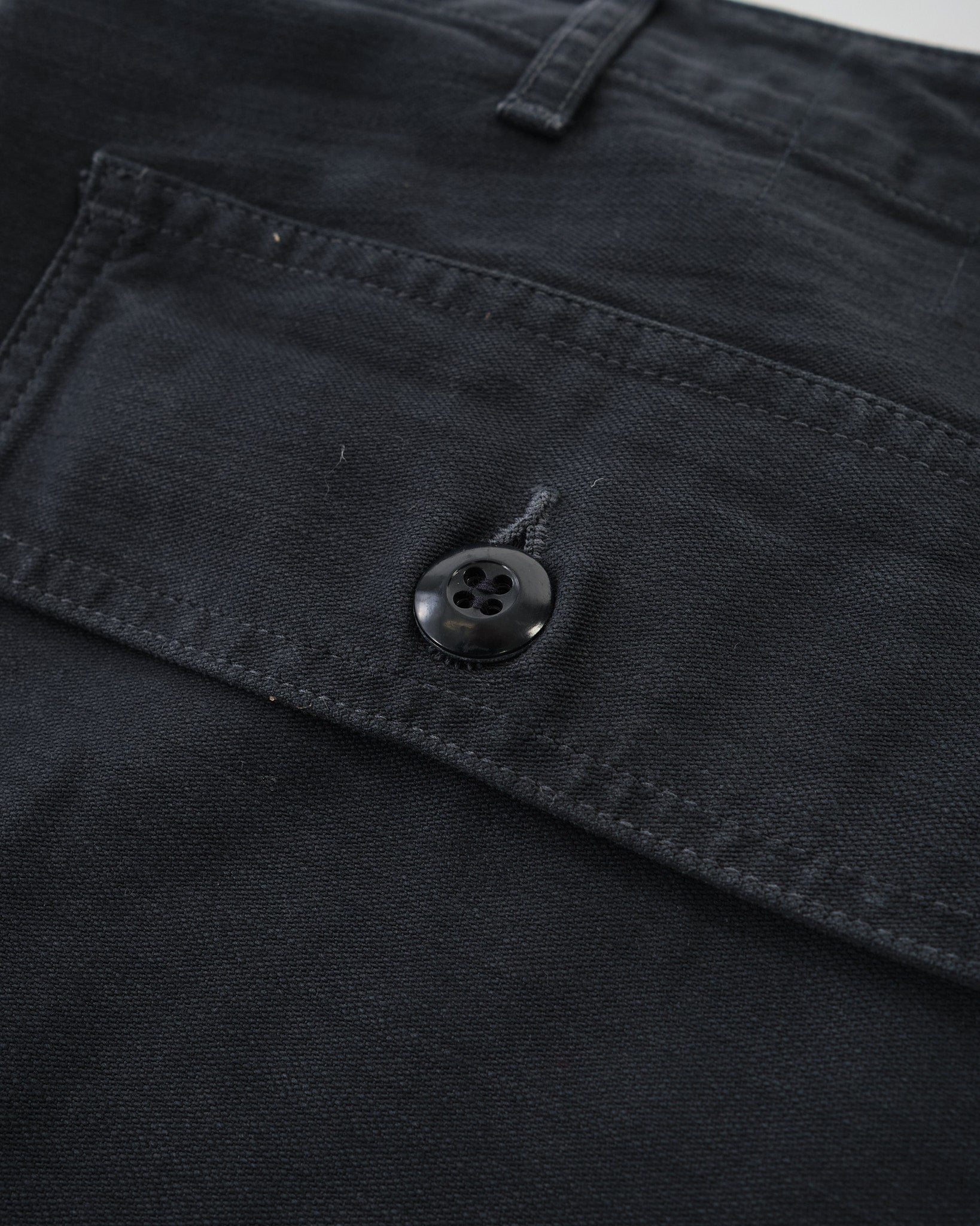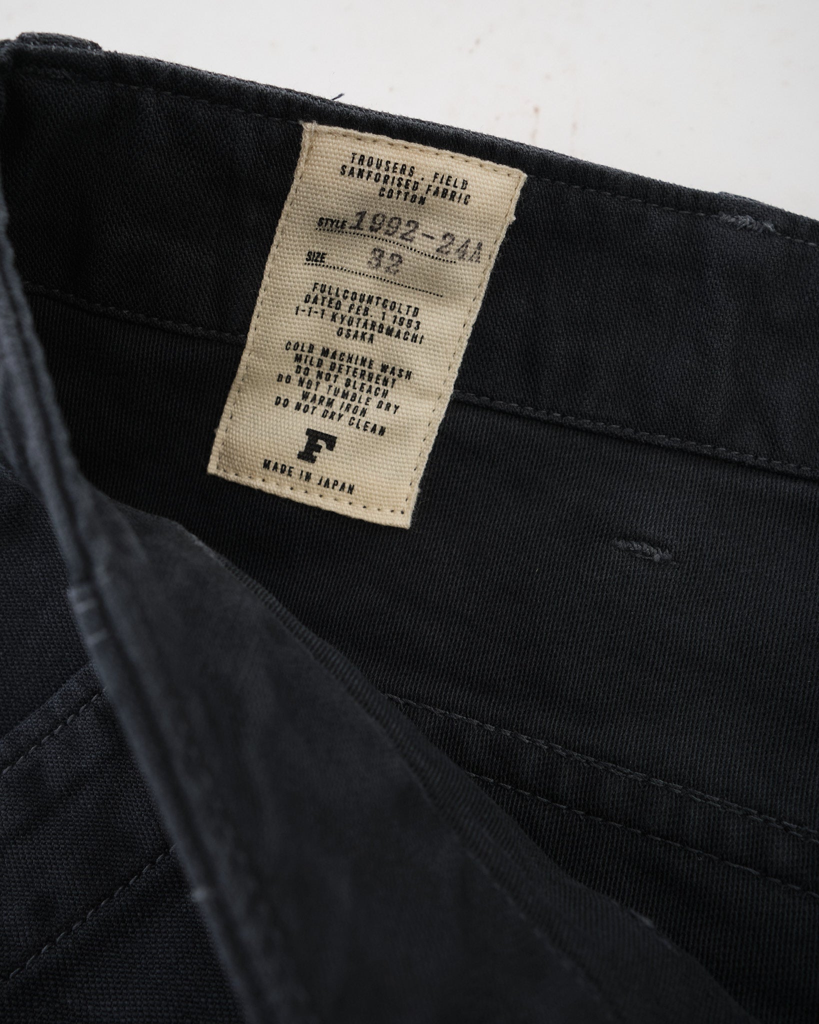 The FULL COUNT 1992-24A UTILITY TROUSERS in BLACK (1992-24A) are a modern interpretation of the classic Baker pants, known for their military heritage and functional design. After years of research and refinement, these trousers have been perfected to capture the authentic softness and durability of vintage workwear. Crafted from 100% cotton military back-satin, the fabric has been meticulously analyzed down to the fibers to replicate the supple feel of original Baker pants. The sulfur-dyed black fabric ensures a gradual aging process, developing a unique patina over time. Additionally, ozone treatment enhances the fabric’s worn-in comfort and texture from the first wear.