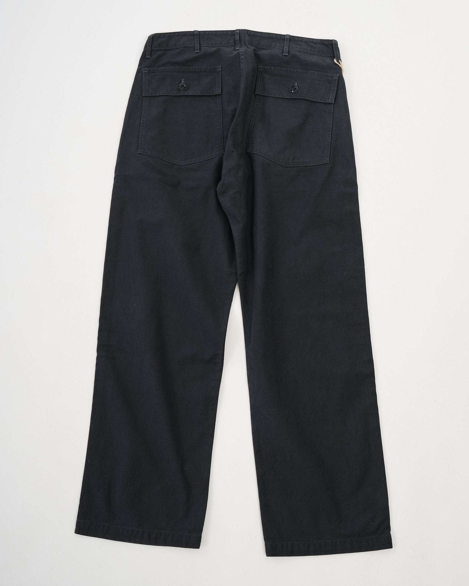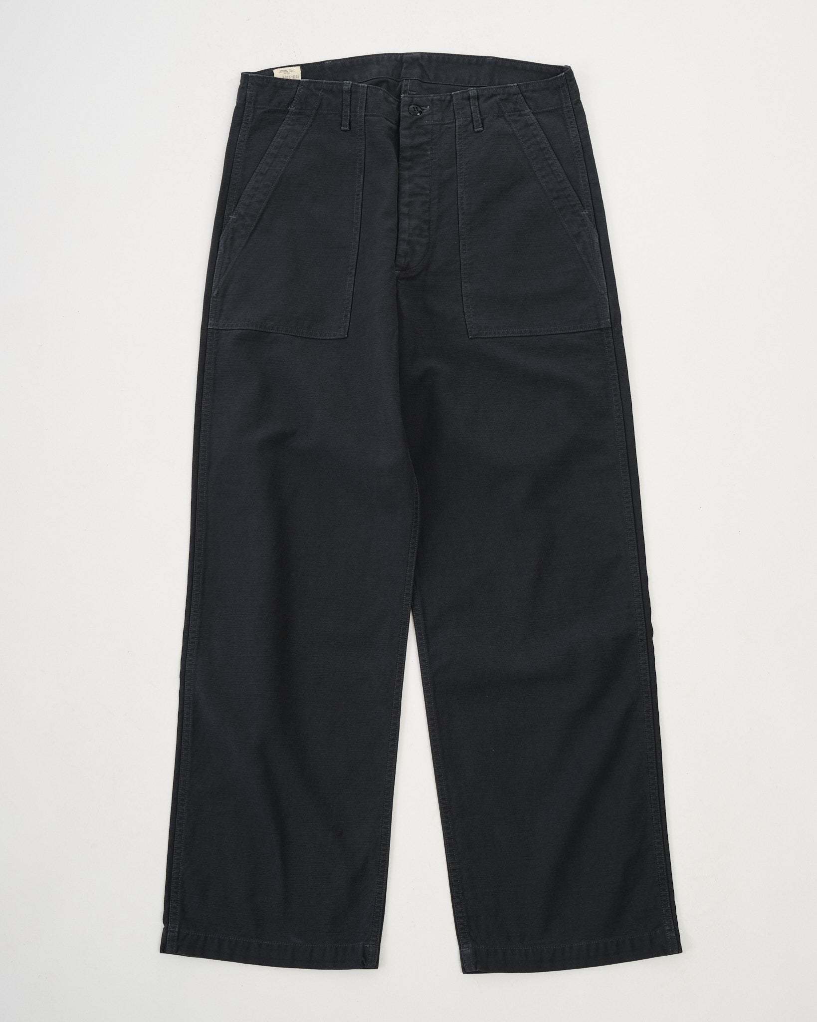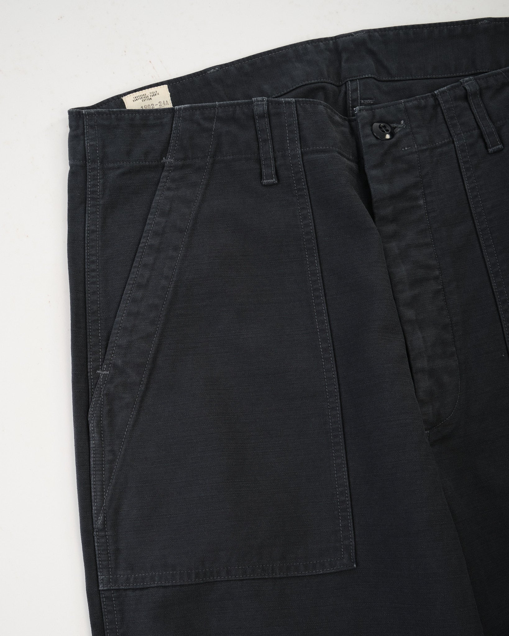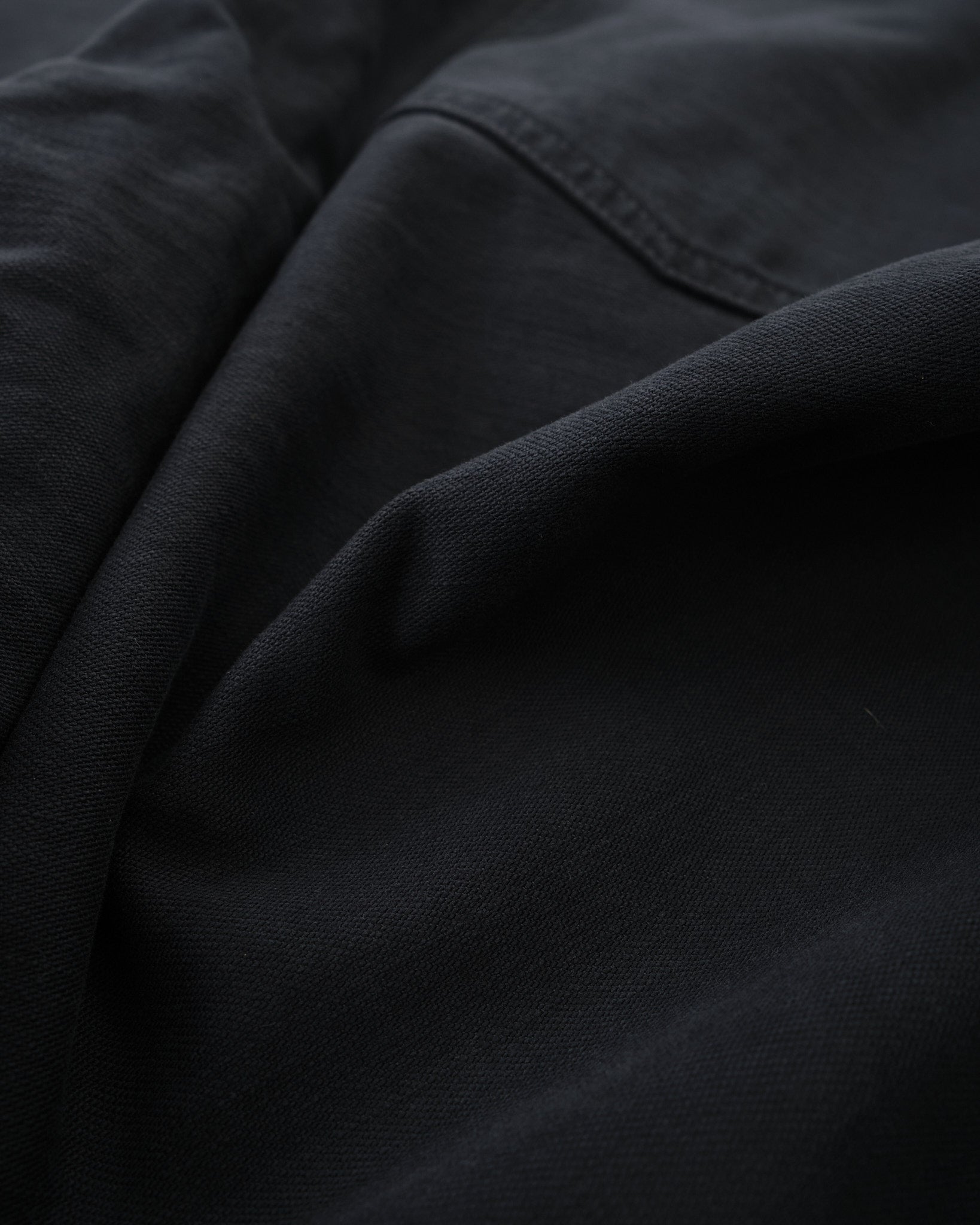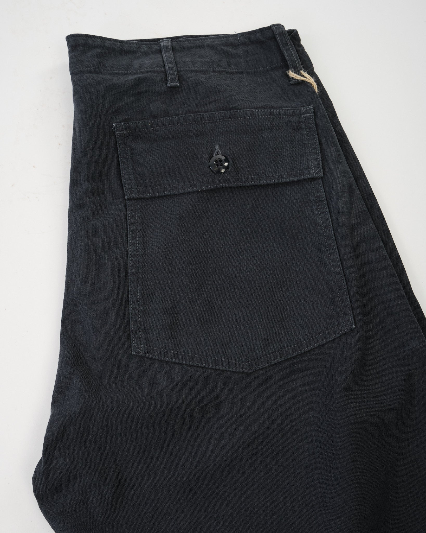 The FULL COUNT 1992-24A UTILITY TROUSERS in BLACK (1992-24A) are a modern interpretation of the classic Baker pants, known for their military heritage and functional design. After years of research and refinement, these trousers have been perfected to capture the authentic softness and durability of vintage workwear. Crafted from 100% cotton military back-satin, the fabric has been meticulously analyzed down to the fibers to replicate the supple feel of original Baker pants. The sulfur-dyed black fabric ensures a gradual aging process, developing a unique patina over time. Additionally, ozone treatment enhances the fabric’s worn-in comfort and texture from the first wear.