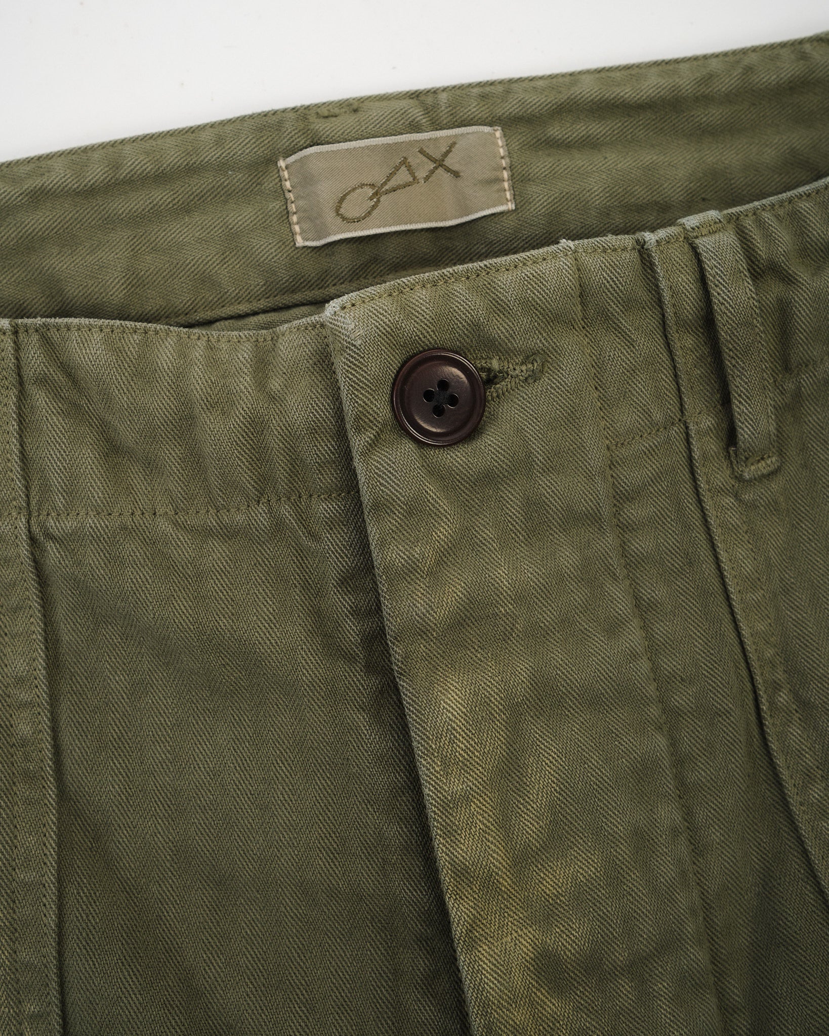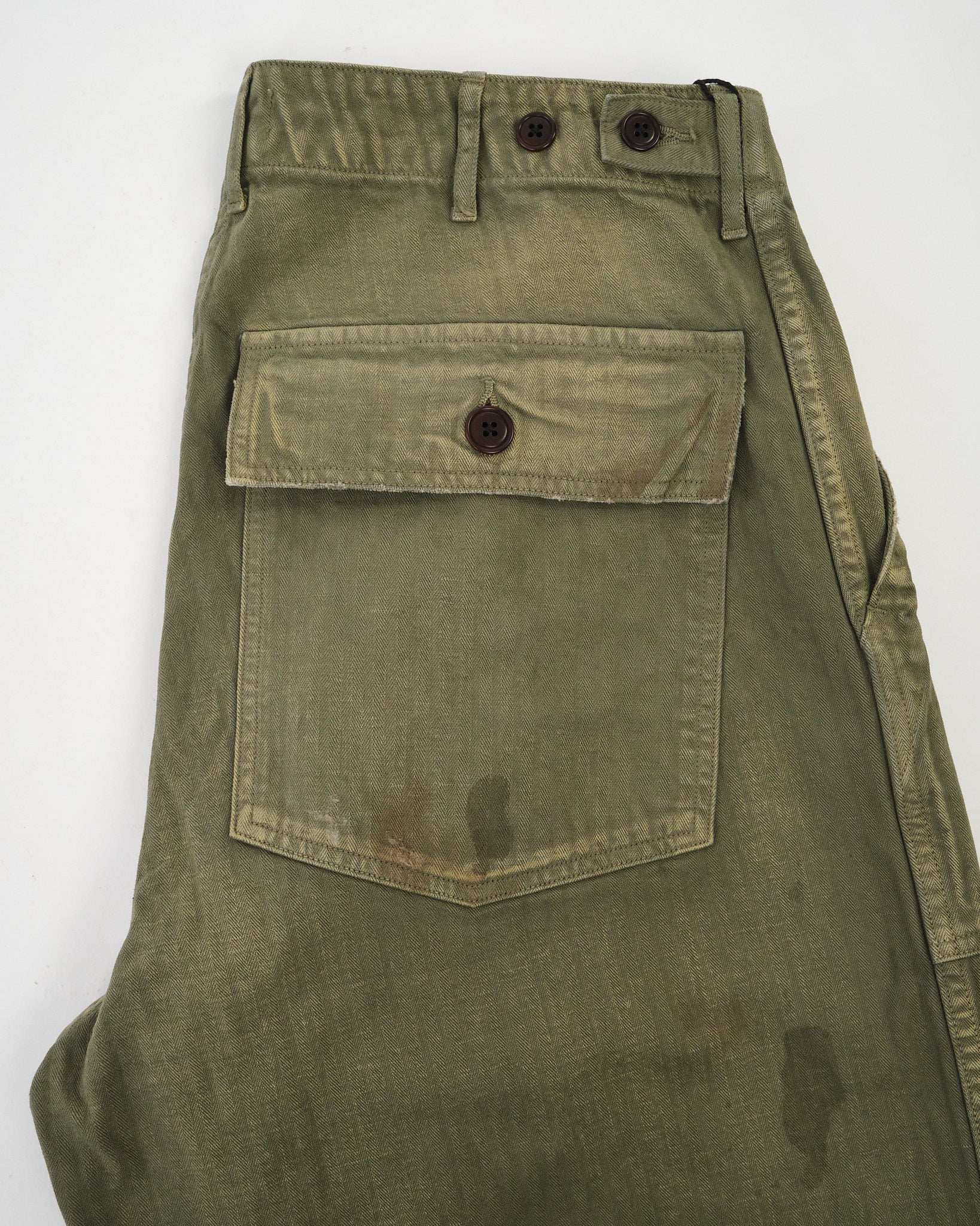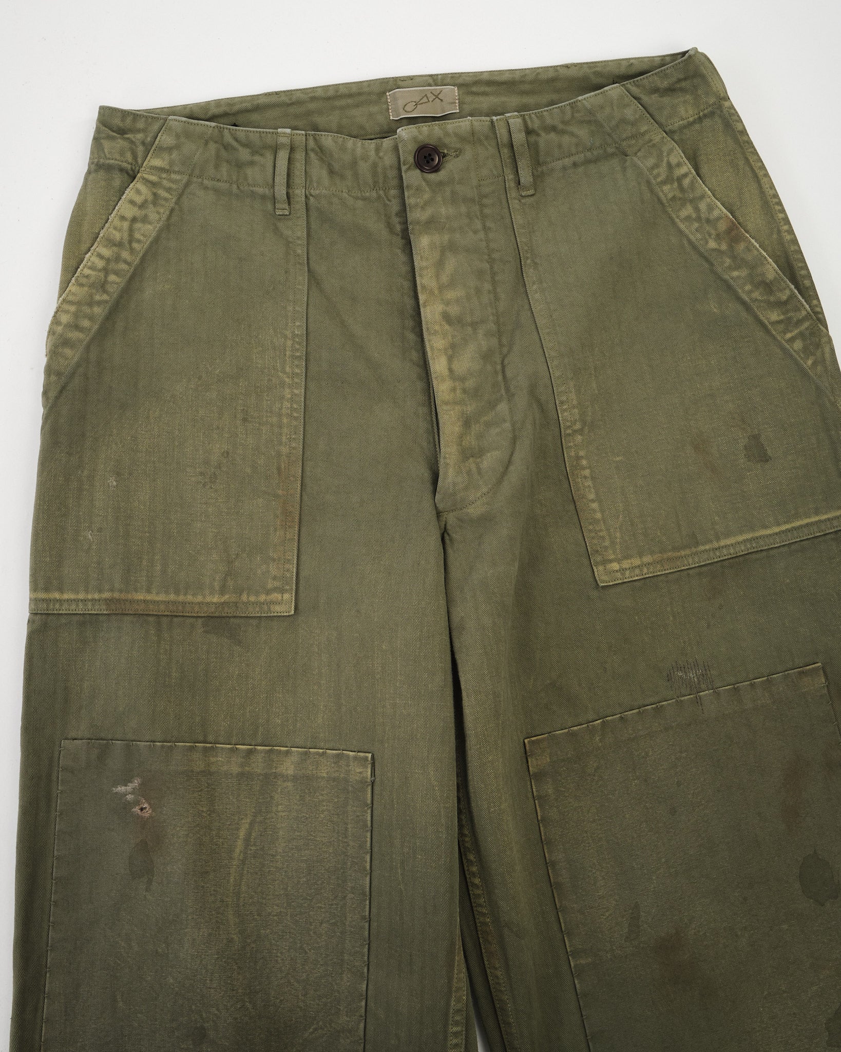 Featuring a relaxed fit, these pants incorporate boro-style patchwork detailing, creating a unique textured look that evolves beautifully over time. The olive colorway enhances the vintage military appeal, making them a versatile choice for everyday wear. Made in Japan, they are a testament to expert craftsmanship and timeless design.