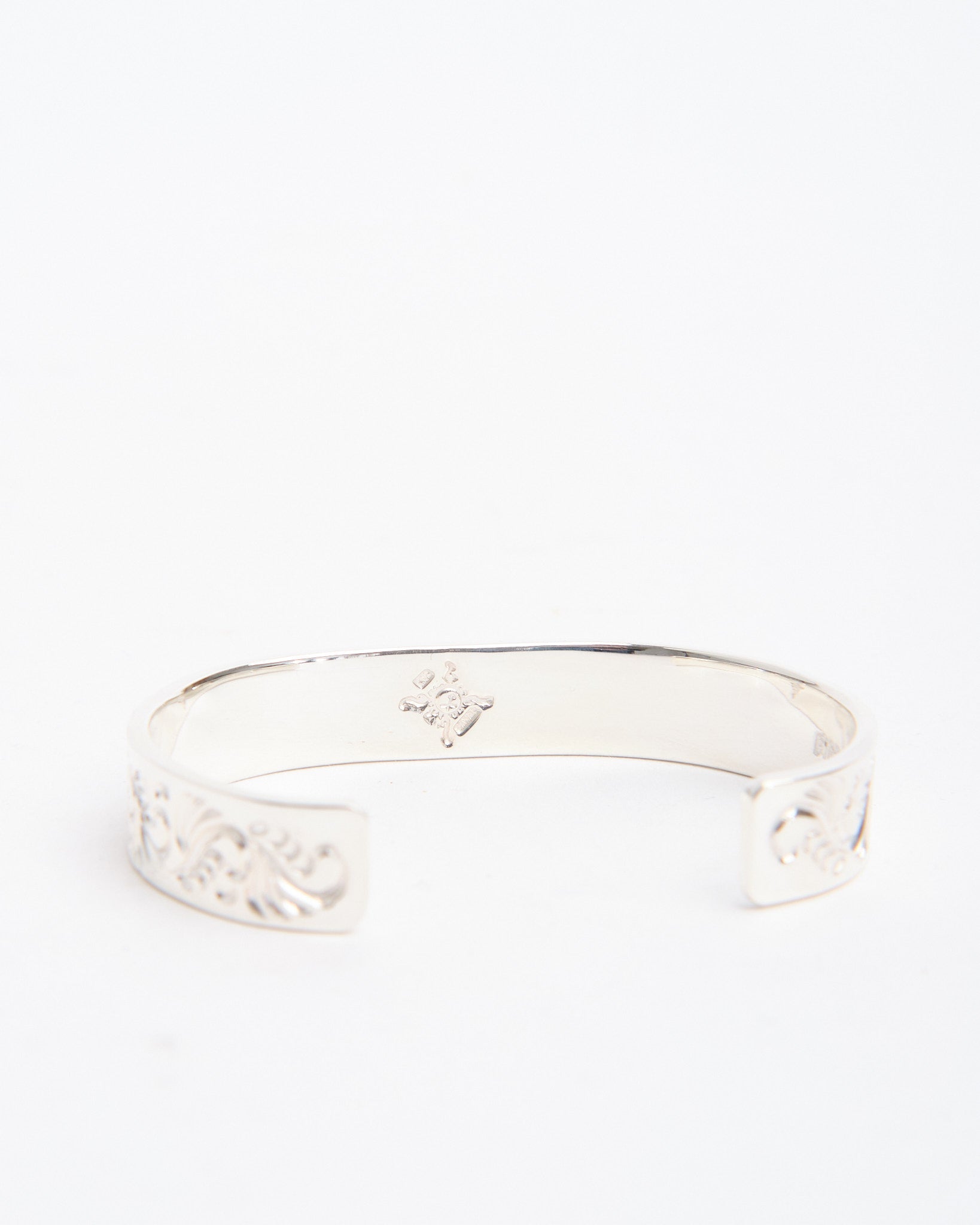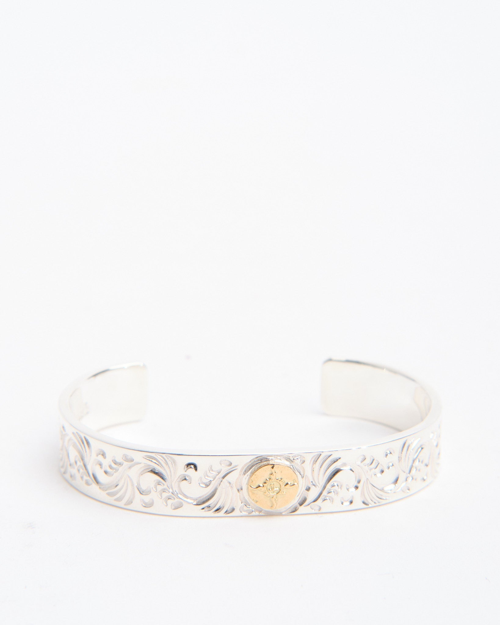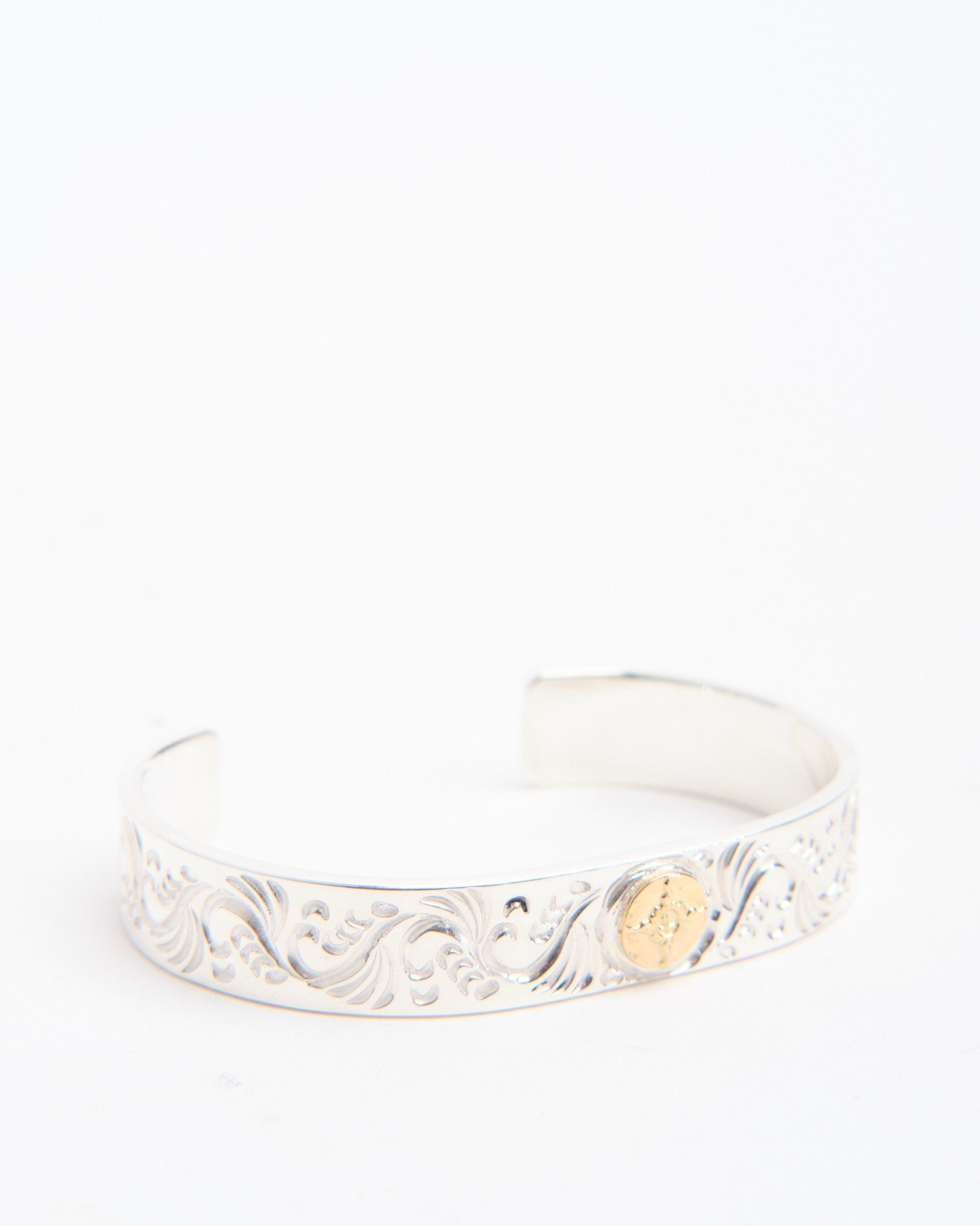 The Flat Hammered 12mm Arabesque Carving Bungle with K18 (M size) is a bold and intricate bracelet from First Arrows. Handcrafted in Japan from Britannia Silver 950, the bungle features a wide 12mm profile with a hammered surface that reflects light beautifully. Alongside the hammer work, detailed arabesque carvings add depth and artistry, showcasing traditional Japanese craftsmanship. A touch of 18k yellow gold brings warmth and contrast, highlighting the bungle’s refined character. Treated with First Arrows’ exclusive heat process, the silver is durable while retaining its brilliance. Over time, the silver darkens naturally, making the carvings and gold detail stand out even more. Symbolic, refined, and powerful, this bracelet balances cultural artistry with modern wearability.