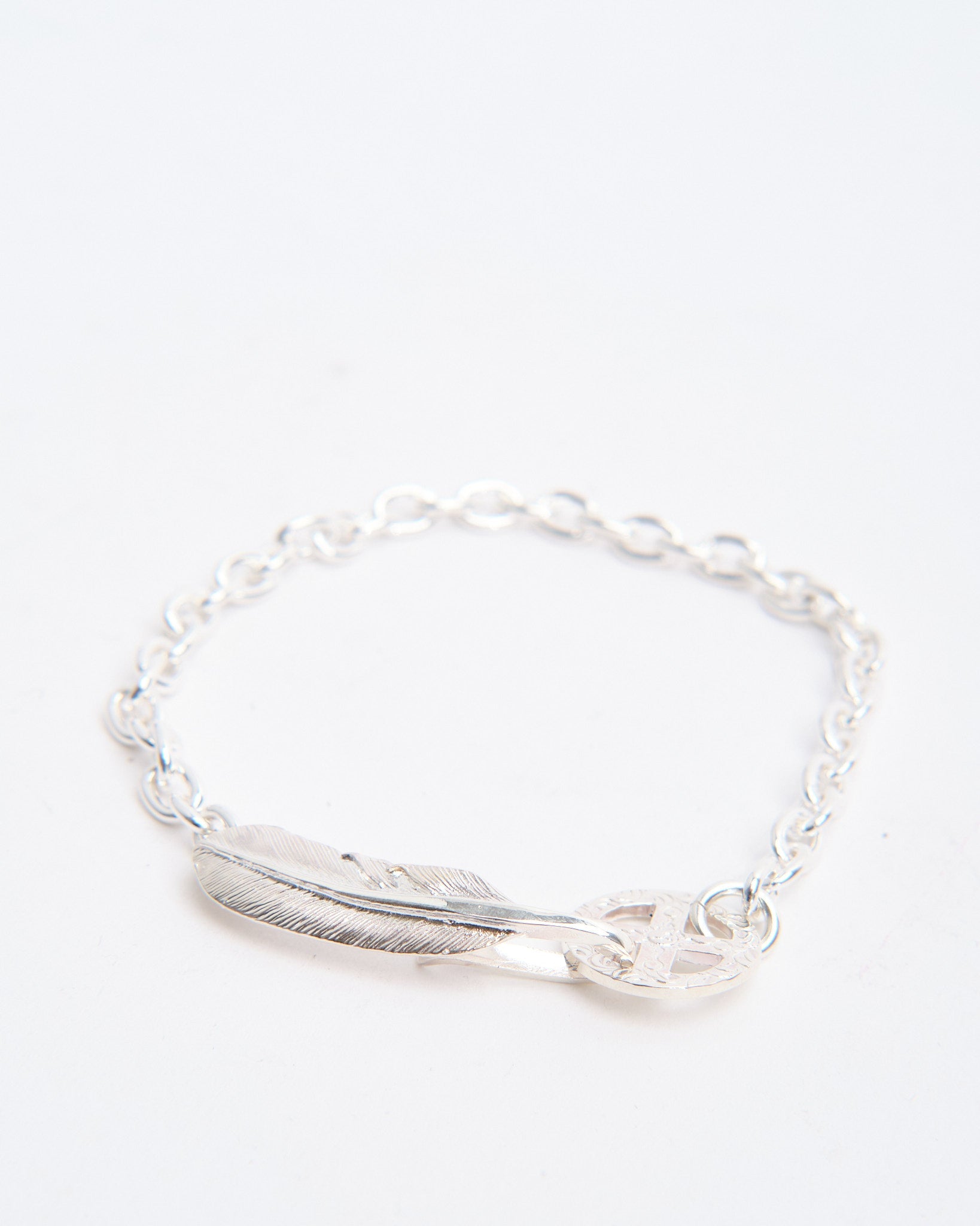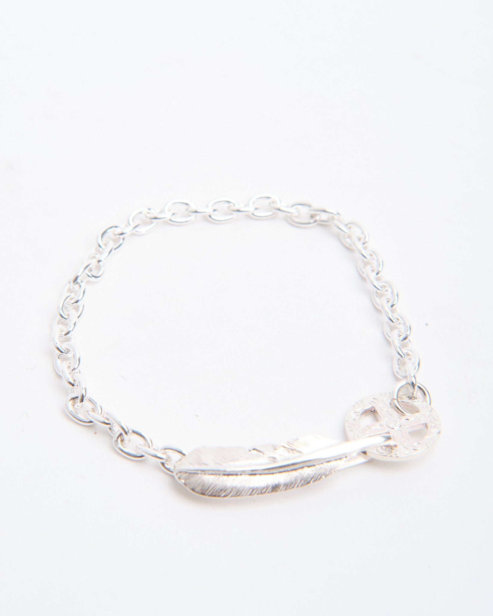 The S Feather Hook + Medicine Wheel Chain Bracelet (M size) is a meaningful design from First Arrows, handcrafted in Japan from Britannia Silver 950. The bracelet combines a feather hook closure with a Medicine Wheel charm, both powerful motifs rooted in Native American tradition. The feather symbolises freedom and positivity, while the Medicine Wheel represents harmony, balance, and protection. Strengthened with First Arrows’ special heat-treatment process, the silver is both radiant and durable. With wear, the silver naturally darkens, creating a deeper character unique to each bracelet. Comfortable in medium size, this piece is a versatile accessory that blends symbolism with refined craftsmanship.