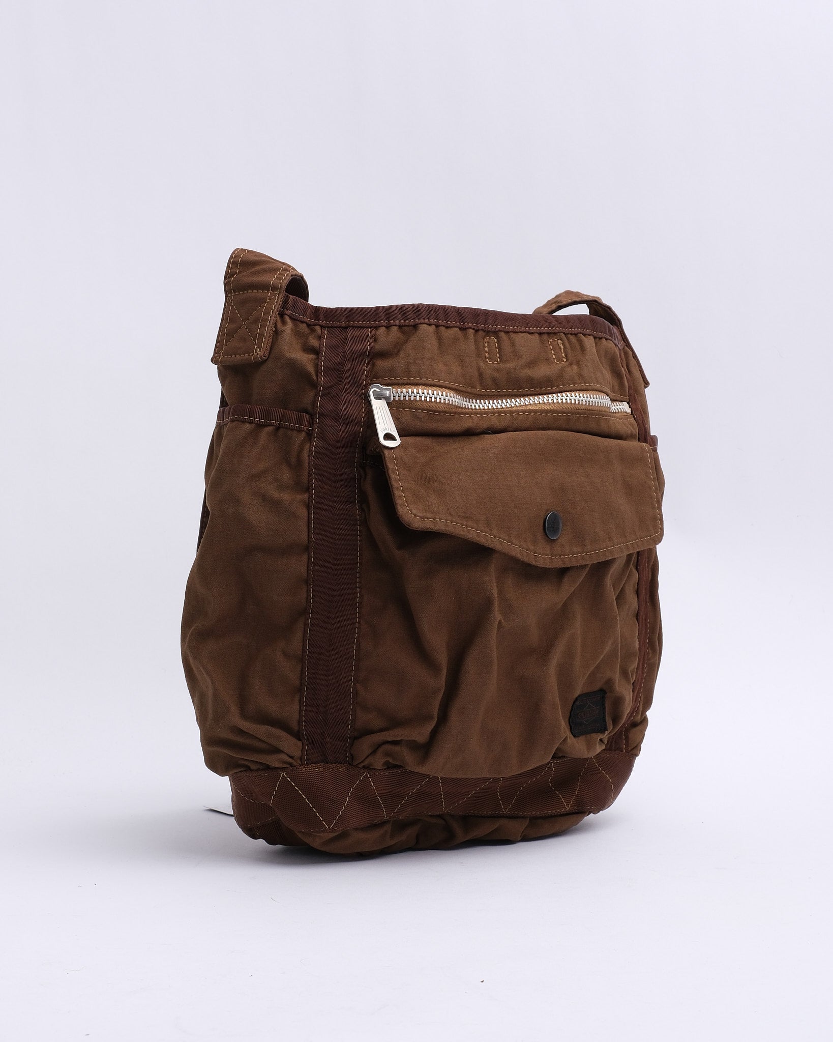 The PORTER BY YOSHIDA Crag Shoulder Bag (S) is part of the PORTER CRAG series, known for its distinctive product-dyeing process that creates deep, rich colors and unique textures. Made from back satin fabric, a high-density blend of nylon and cotton, the bag is both durable and lightweight. The two-bath dyeing technique enhances the depth of color and creates subtle variations, ensuring that each piece is one-of-a-kind.