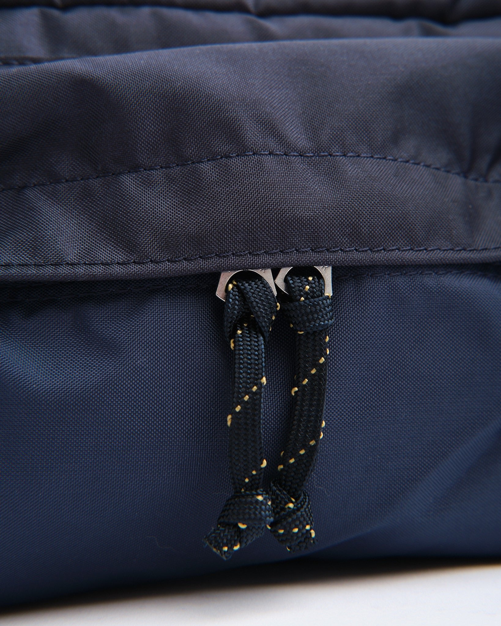 Crafted from industrial-grade fabric woven with 210 denier 6 nylon strong thread, which was originally used for rubber boats, the bag ensures high durability. The interior is lined with emergency color orange, inspired by military jackets, and is quilted with ripstop nylon for added strength.