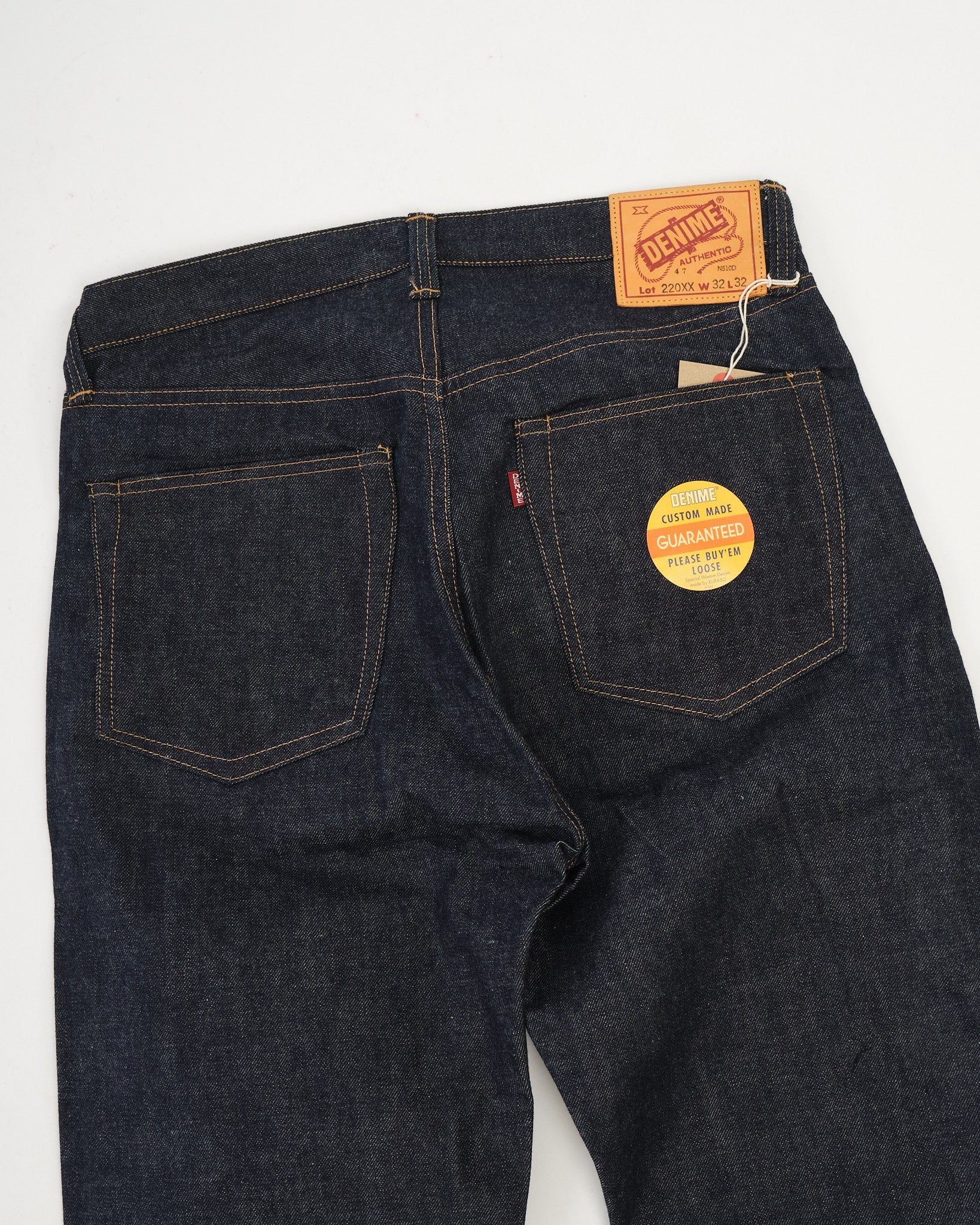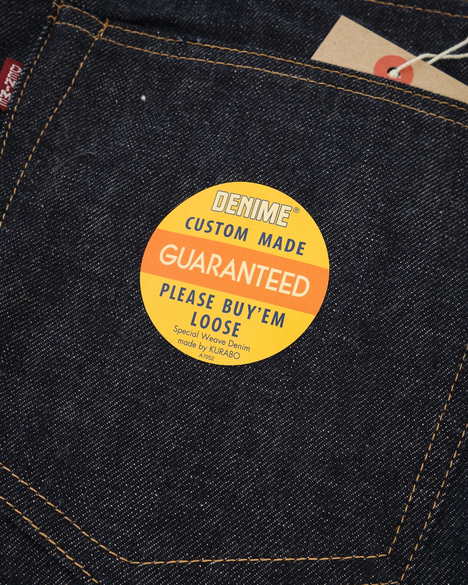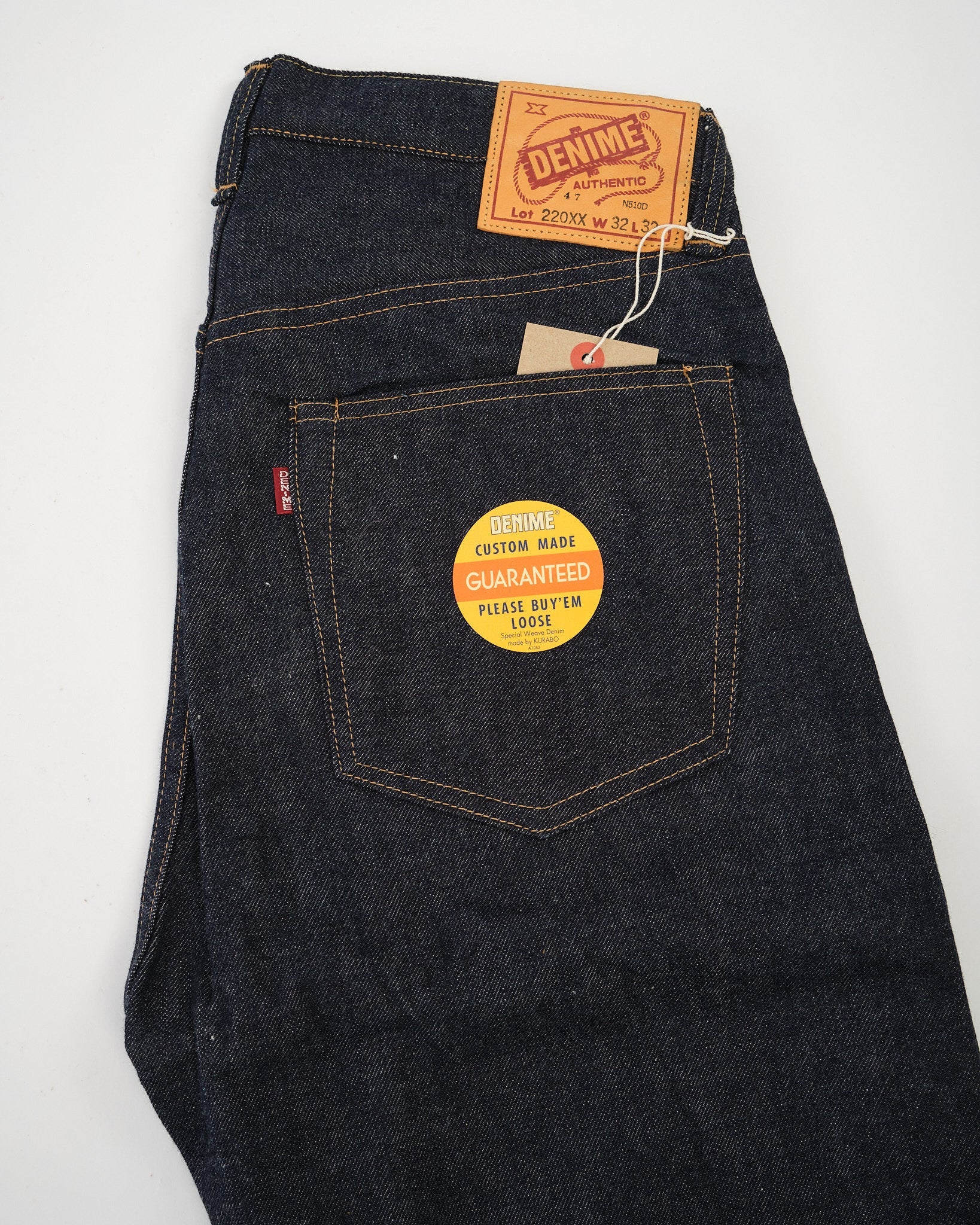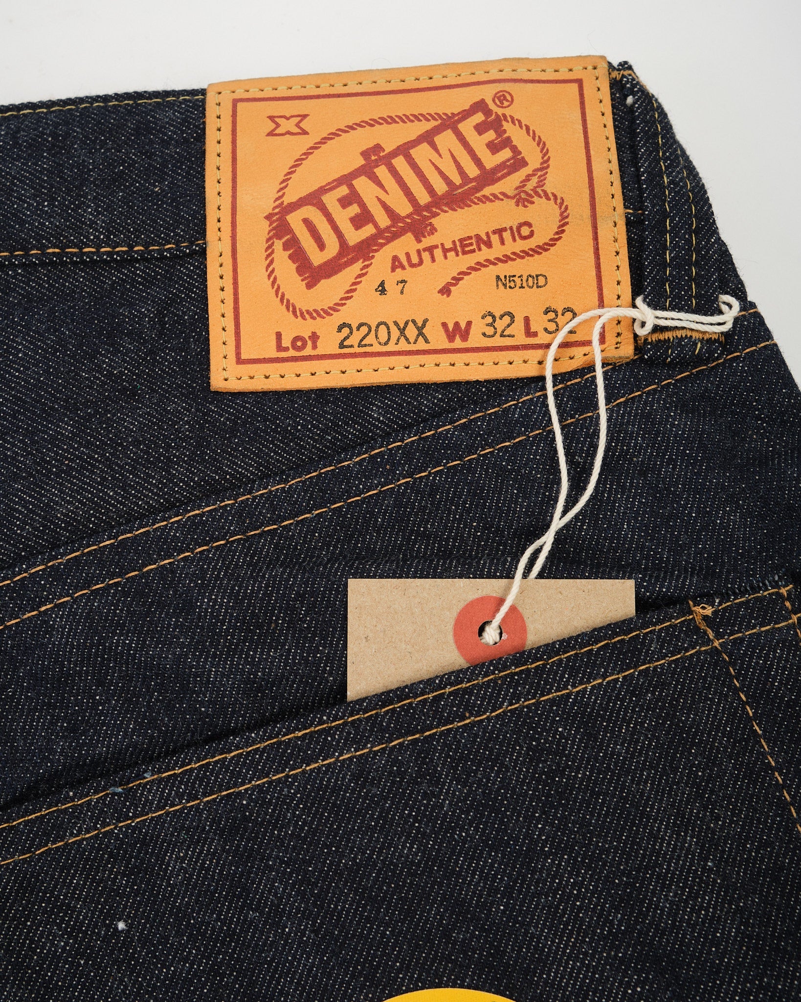 Step into denim history with the DENIME LOT 220XX-47 1947 MODEL, a faithful reproduction of the legendary post-war jeans that defined an era. Crafted in Japan from premium 7.3×7.3 brown cotton-blend selvedge denim, this pair is woven on traditional GL3 power looms to replicate the texture and durability of vintage workwear. The straight-leg cut, button-fly closure, and hidden back pocket rivets stay true to the original 1947 design, while the indigo rope-dyed fabric develops a rich, unique fade over time. Made in Japan, this denim masterpiece delivers superior craftsmanship, authenticity, and timeless style.