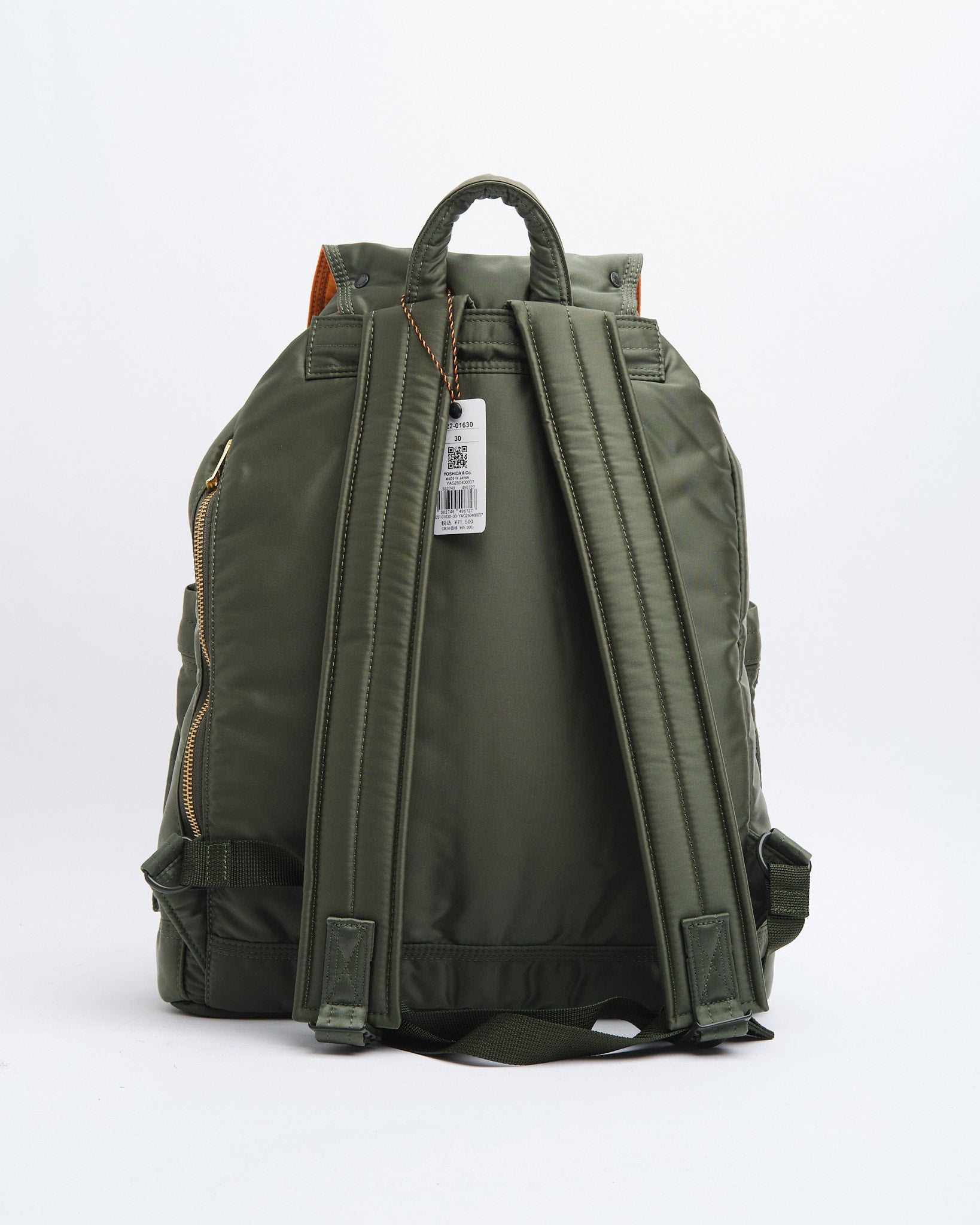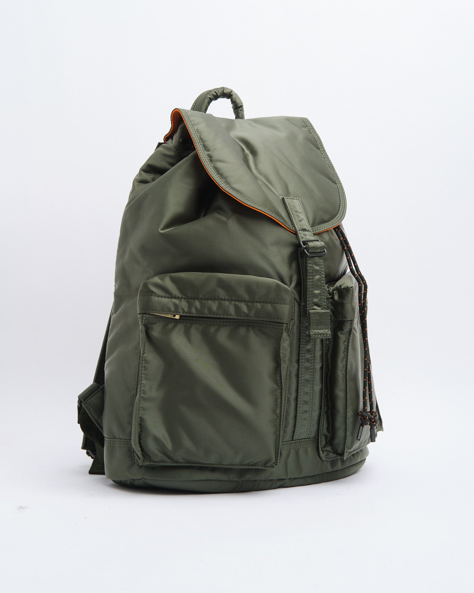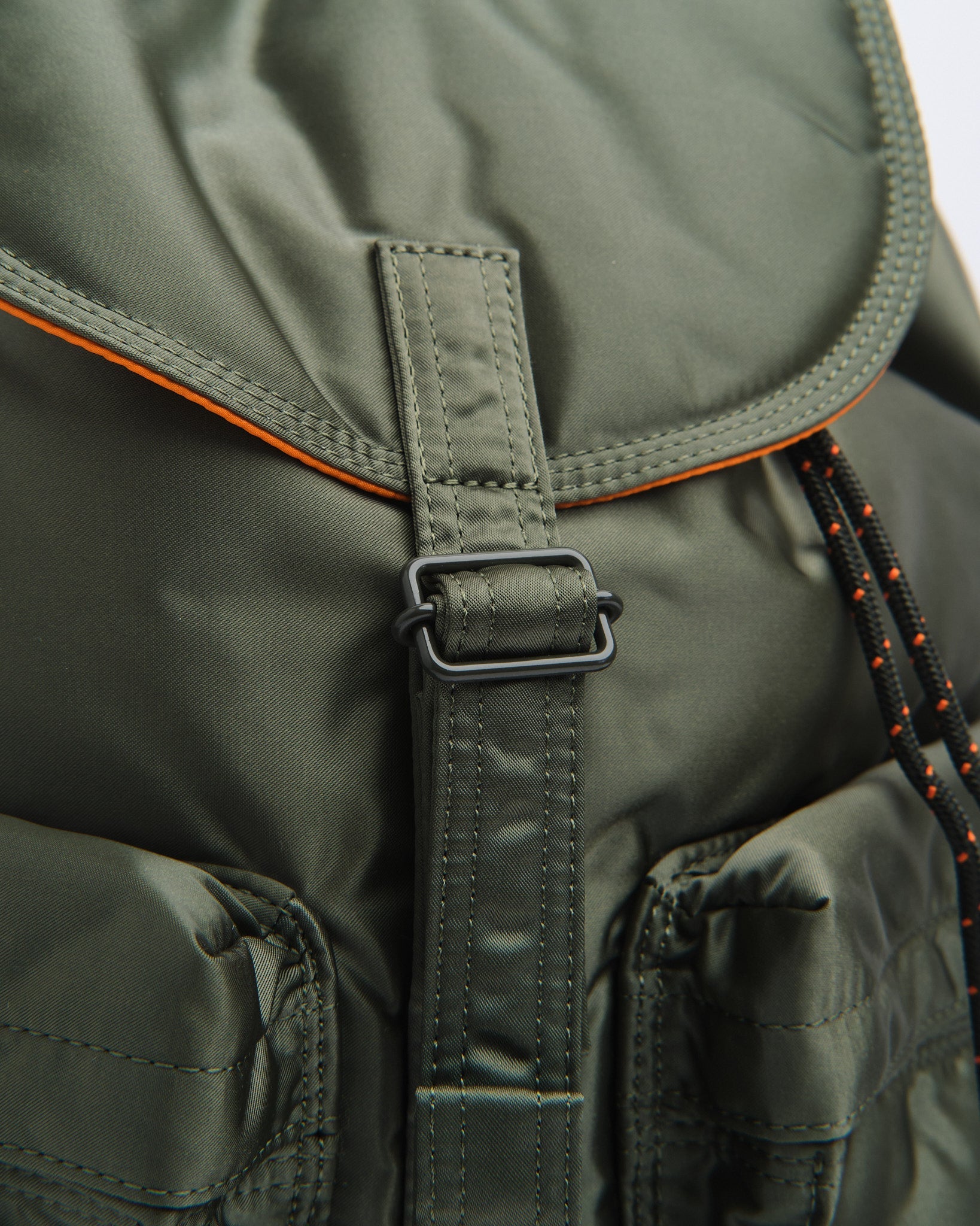 The PORTER BY YOSHIDA Tanker Rucksack (622-01630-30) in Sage Green is a standout from the newly reborn New Tanker series. Crafted with 100% plant-derived nylon, made from corn and castor oil plants, the rucksack continues the legacy of the iconic Tanker collection, now enhanced with modern updates. The fabric, produced by Toray Industries, offers superior strength, suppleness, and a vibrant luster, while maintaining an environmentally friendly approach.