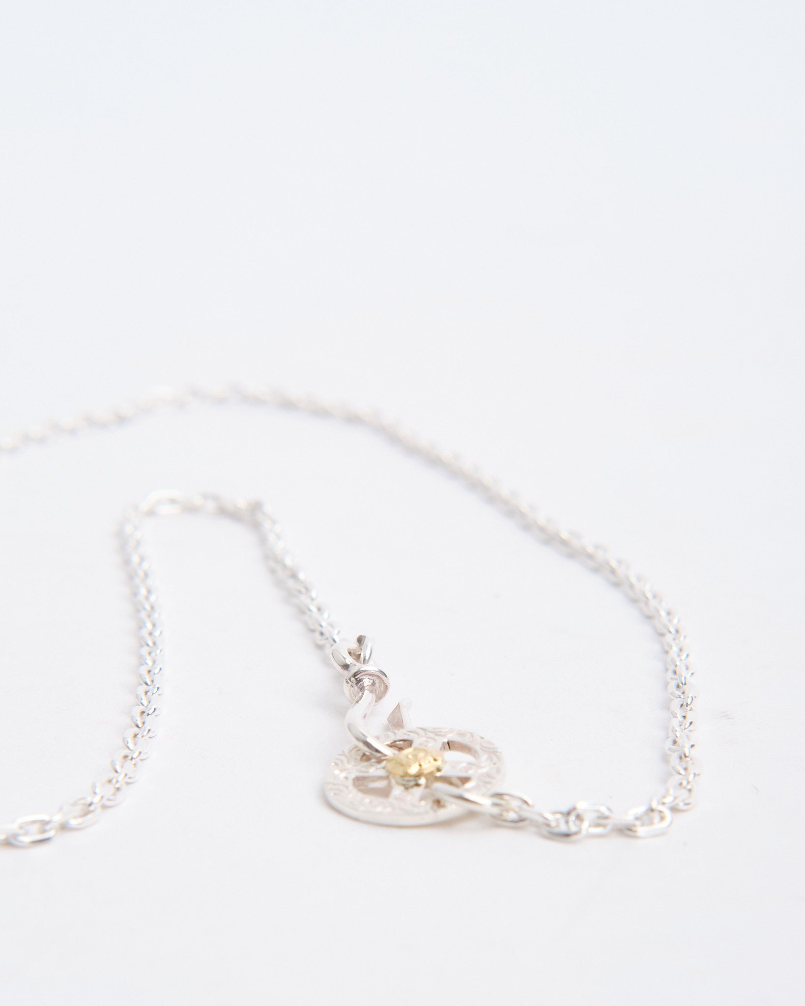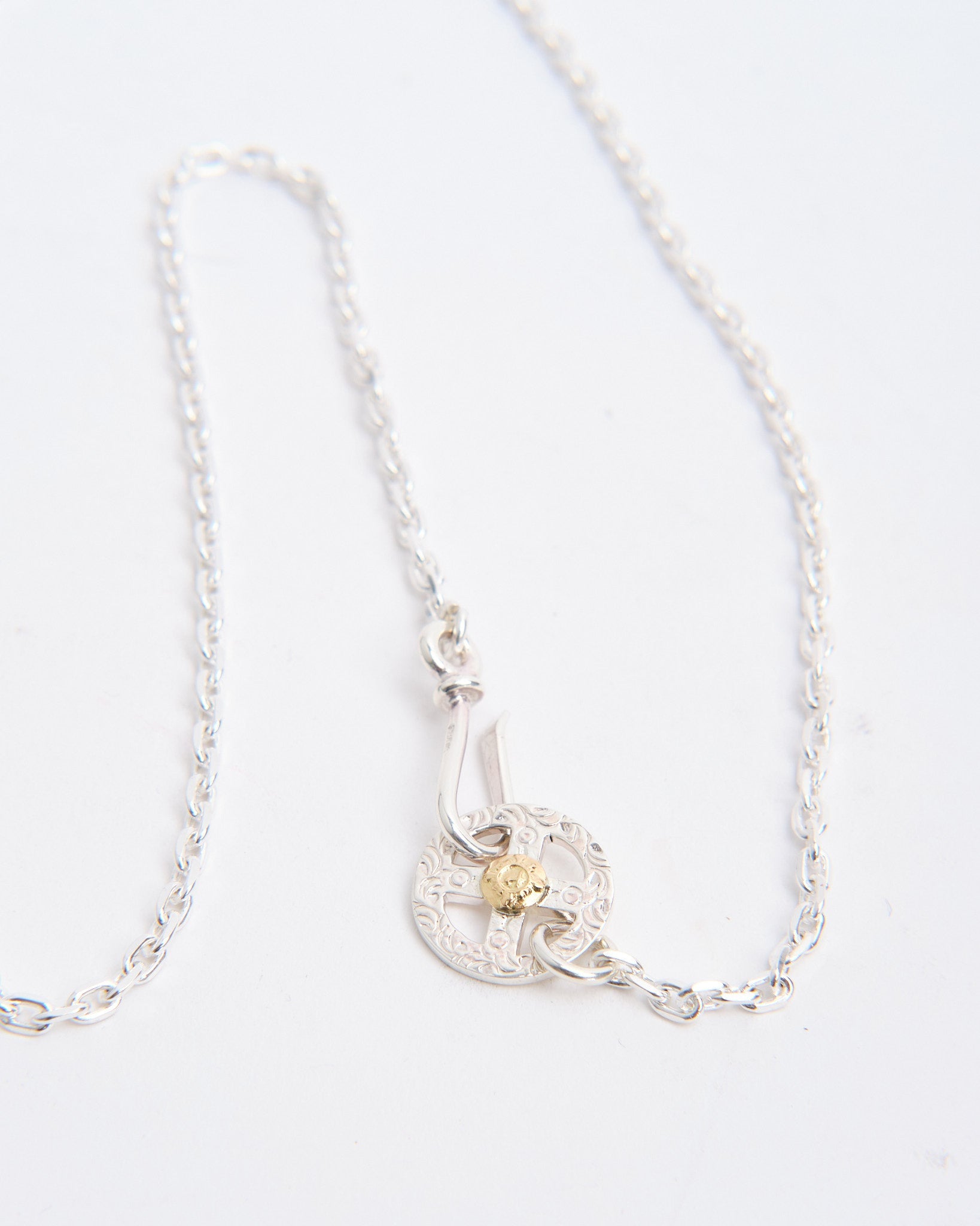 The Chain S + Medicine Wheel with K18 (60cm) is a complete necklace set that unites First Arrows’ symbolic pendant with a handcrafted silver chain. The Medicine Wheel is made from Britannia Silver 950 and detailed with 18k yellow gold, carrying meaning of harmony, balance, and protection inspired by Native American tradition. The longer 60cm chain gives the pendant a relaxed drape, ideal for layering with other necklaces or wearing as a statement piece on its own. First Arrows use a unique heat-treatment process to strengthen the silver, giving it both durability and brilliance. Over time, the silver will age gracefully, developing a darkened patina that highlights the warmth of the gold accent.