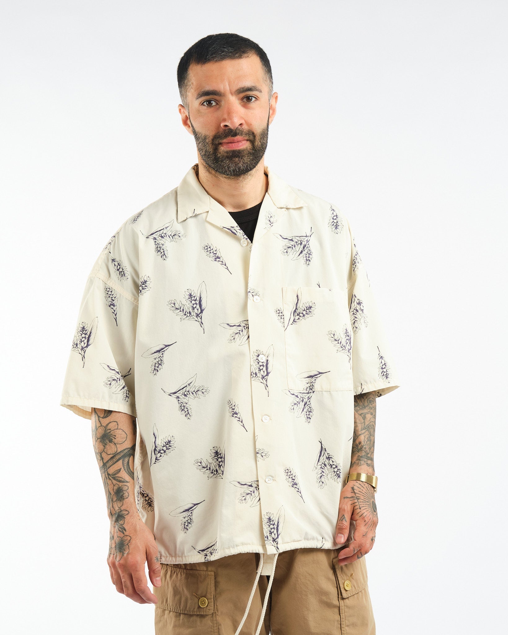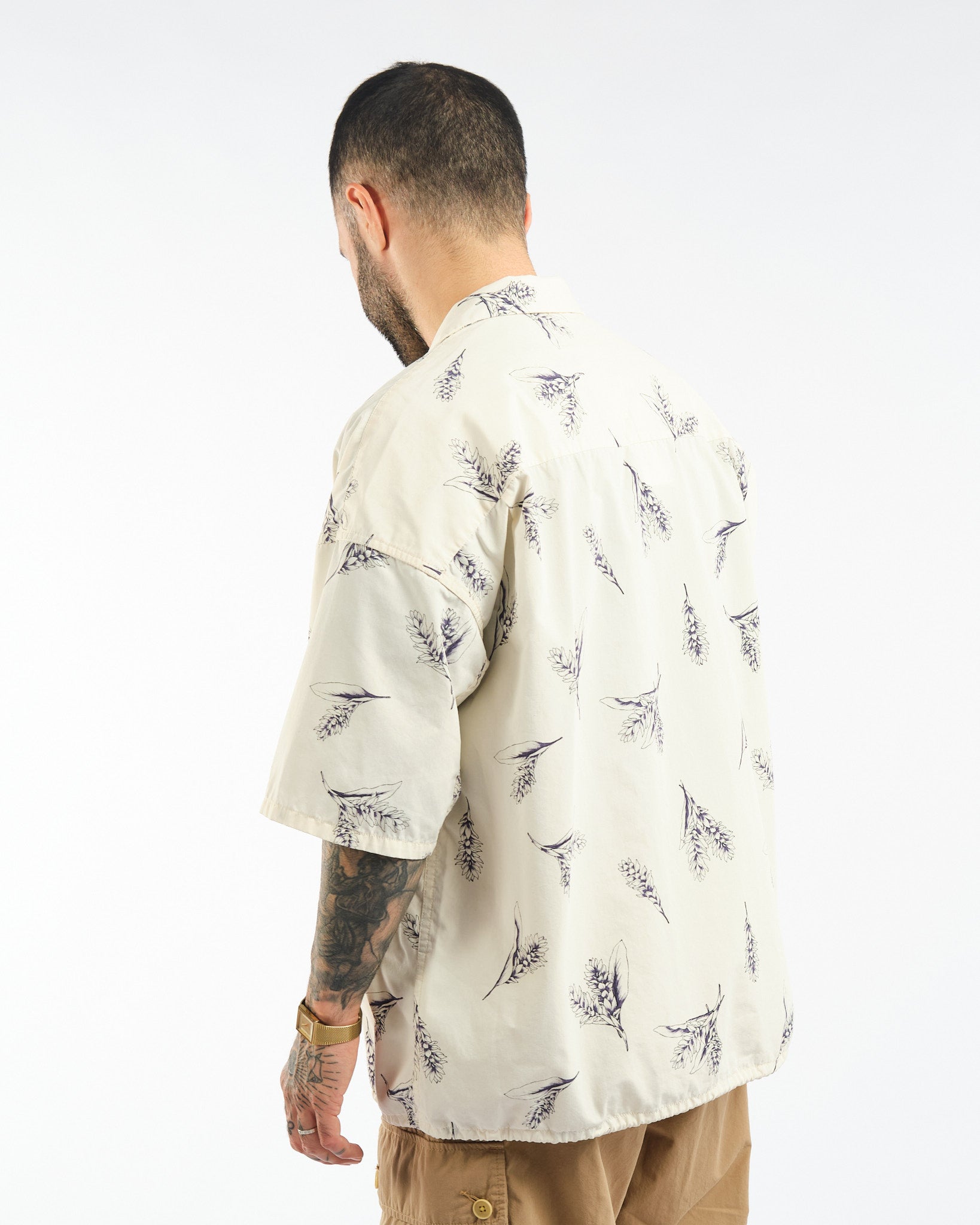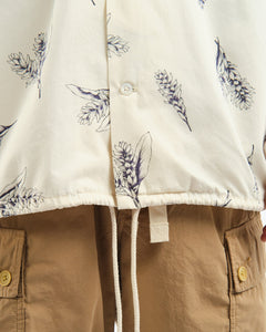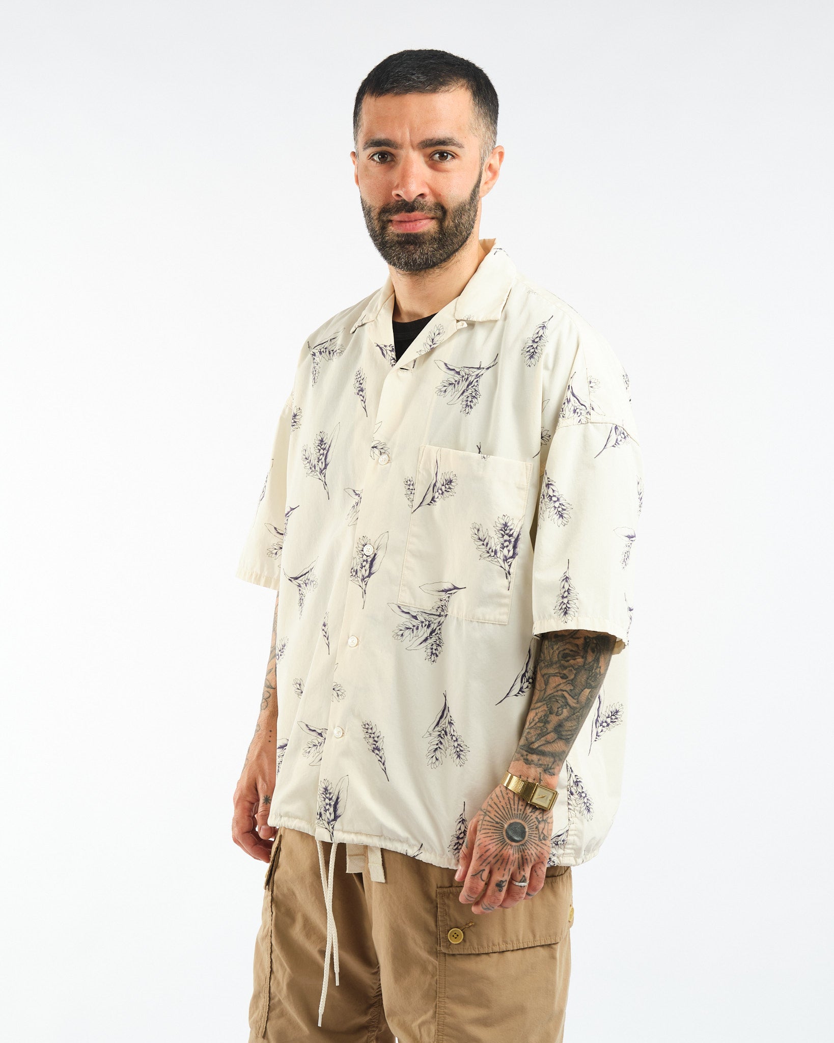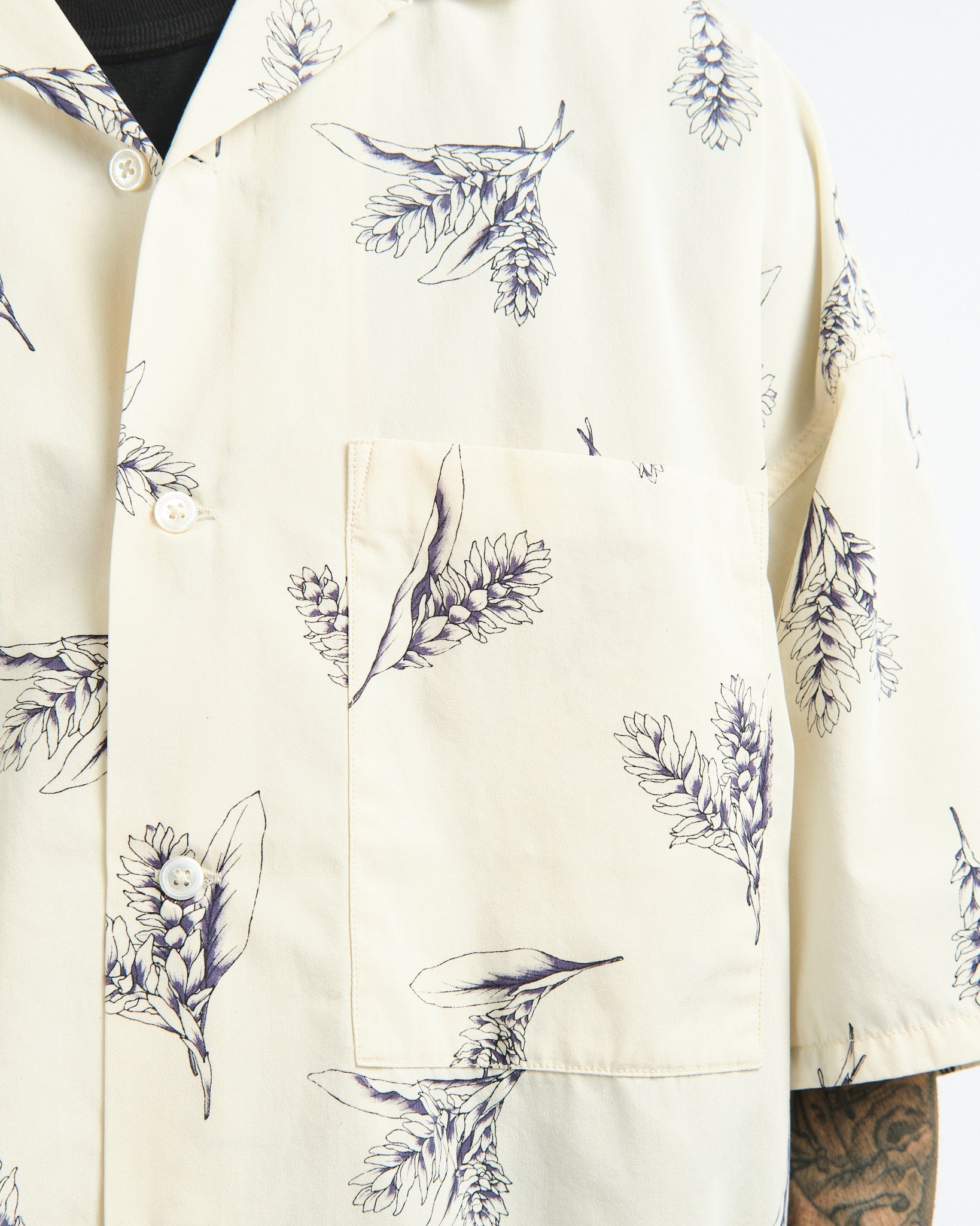 Experience the perfect blend of vintage and contemporary styles with Nanamica's Open Collar Wind H/S Shirt Ecru. This half-sleeve T-shirt features an oversize fit, dropped shoulders, and a drawstring cord that allows for size adjustments of the hem. Based on vintage shirts from the 60s, it has been restructured with a pattern switch design on the collar and sleeves. The broadcloth, made of covering core yarn with a polyester core wrapped in cotton, is printed with a sketch of red ginger flowers found in Hawaii and the South Sea Islands. The shirt also has a convenient patch pocket on the left chest.