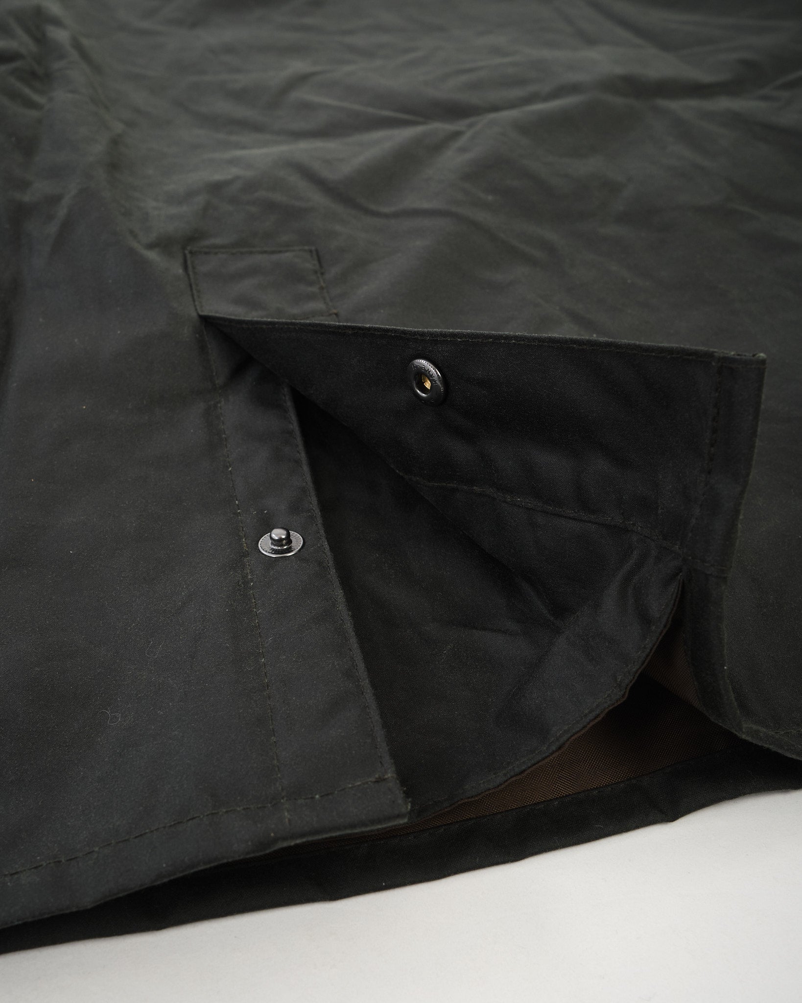Two-way brass zip with snap-close storm flap