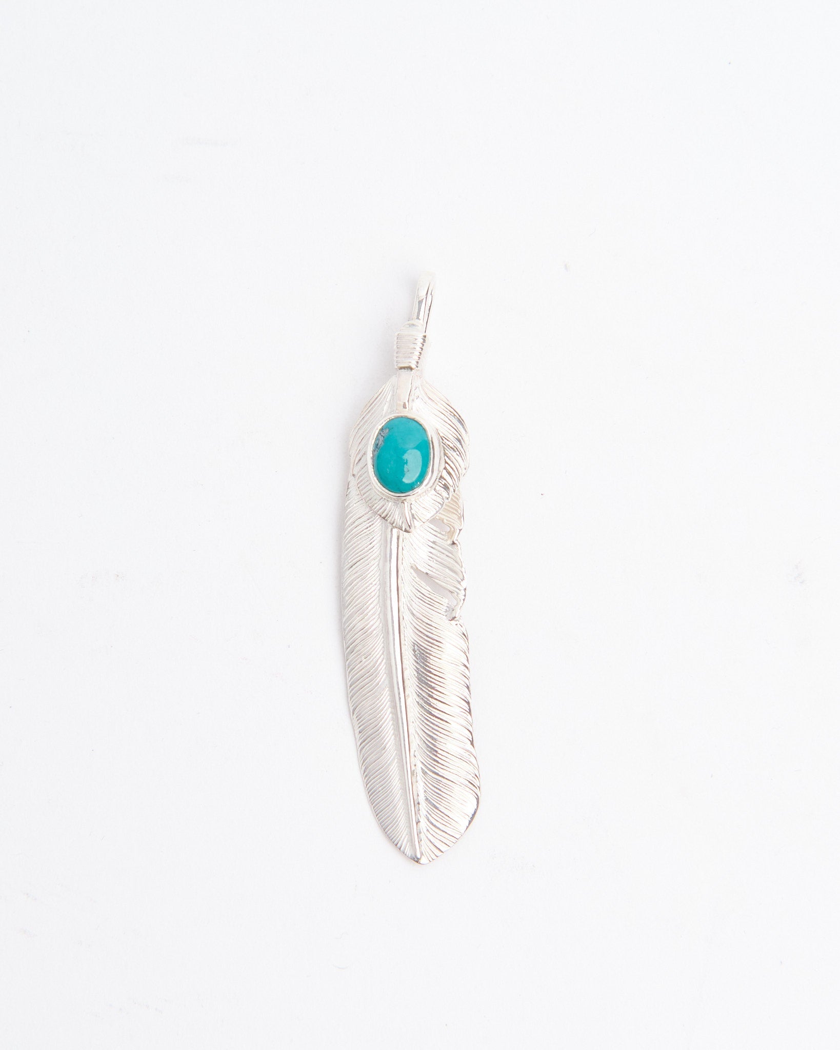 The Feather with Heartfeather with Turquoise (L) brings together two of First Arrows’ most iconic motifs in one powerful piece. Handcrafted in Japan from Britannia Silver 950, the large feather carries the meaning of freedom and positive spirit, while the heartfeather adds warmth and protection. At the center sits a genuine turquoise stone, each one unique in colour and pattern, long believed to offer strength and protection from misfortune. The silver is treated with First Arrows’ special heat process, making it durable while keeping its natural brilliance. Designed with Native American inspiration yet finished with modern refinement, this pendant is both meaningful and versatile, ready to be worn daily or layered with other treasures.