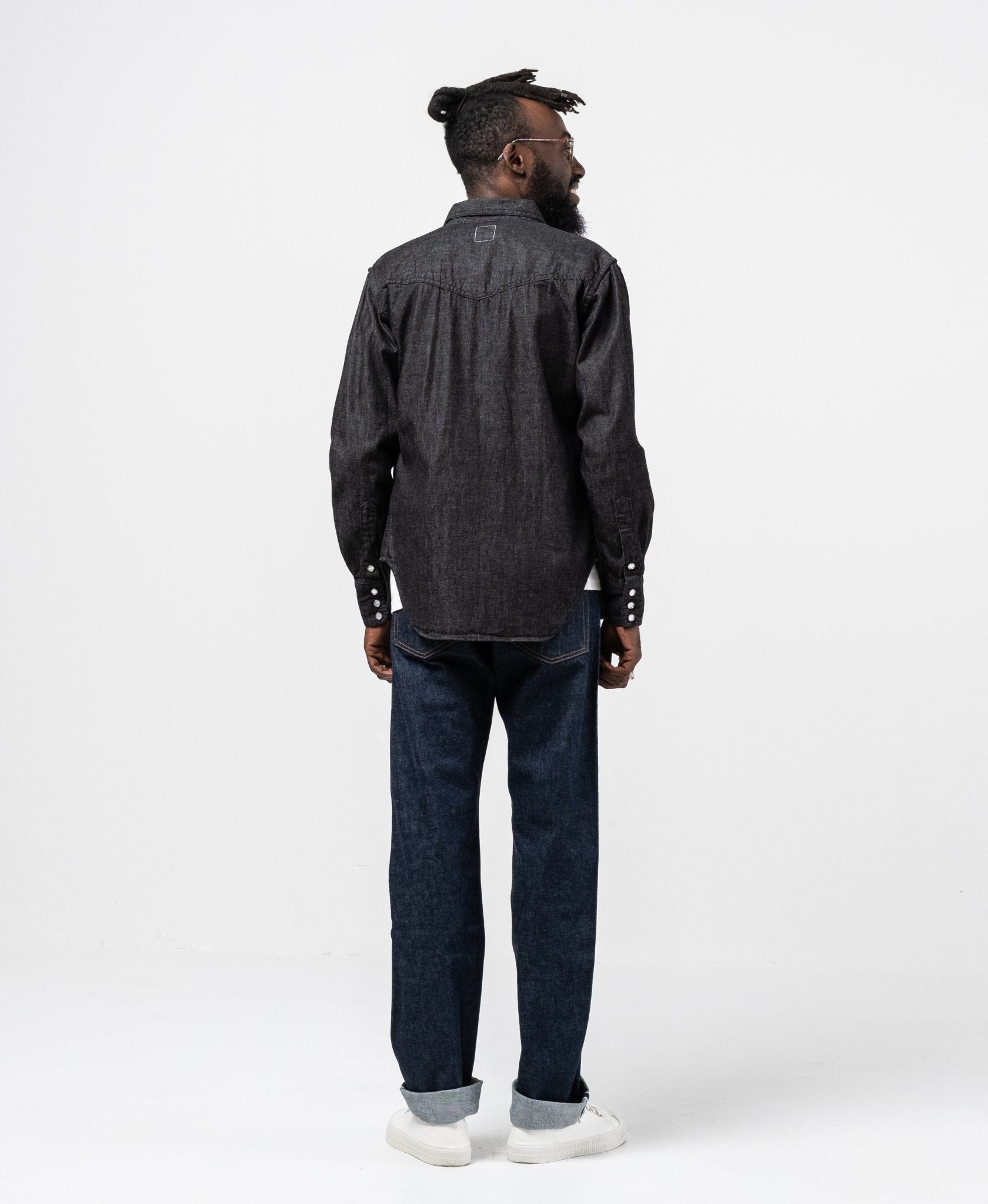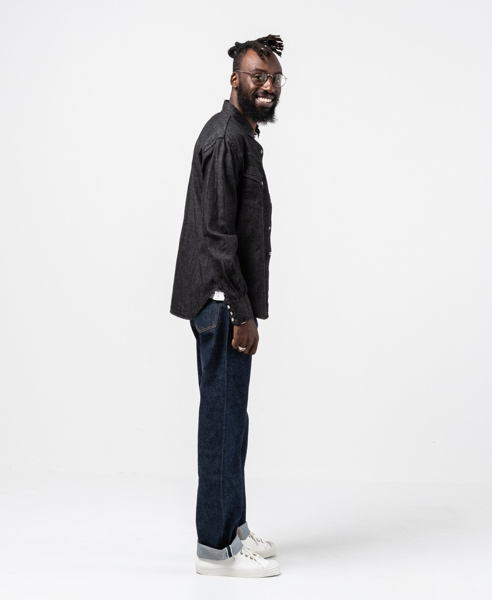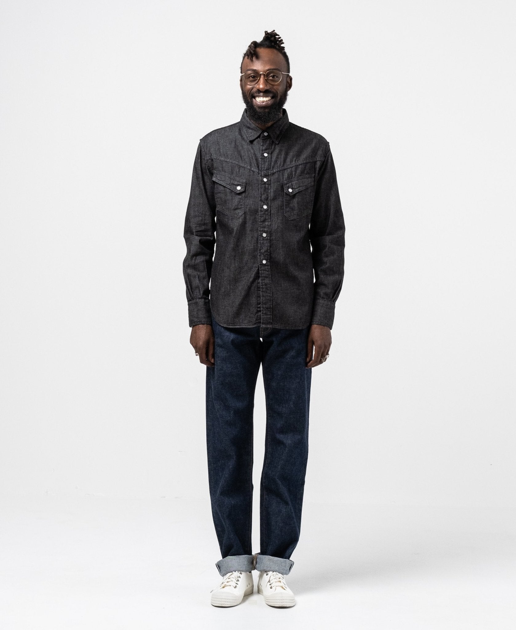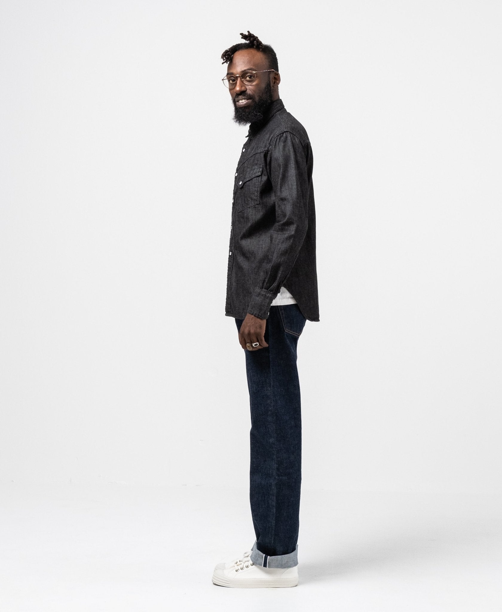 Ranchman Shirt Black Denim from TCB. This shirt has taken its inspiration from the 1940's western shirts. The details are very close to the original, which makes the silhouette slightly cleaner than the vintage version, hence easy to match with any style. The denim is made from 8.5 oz Californian cotton that is slowly woven on an old loom. It is a slightly lighter denim that has some unevenness to the the fabric. Made in Japan.