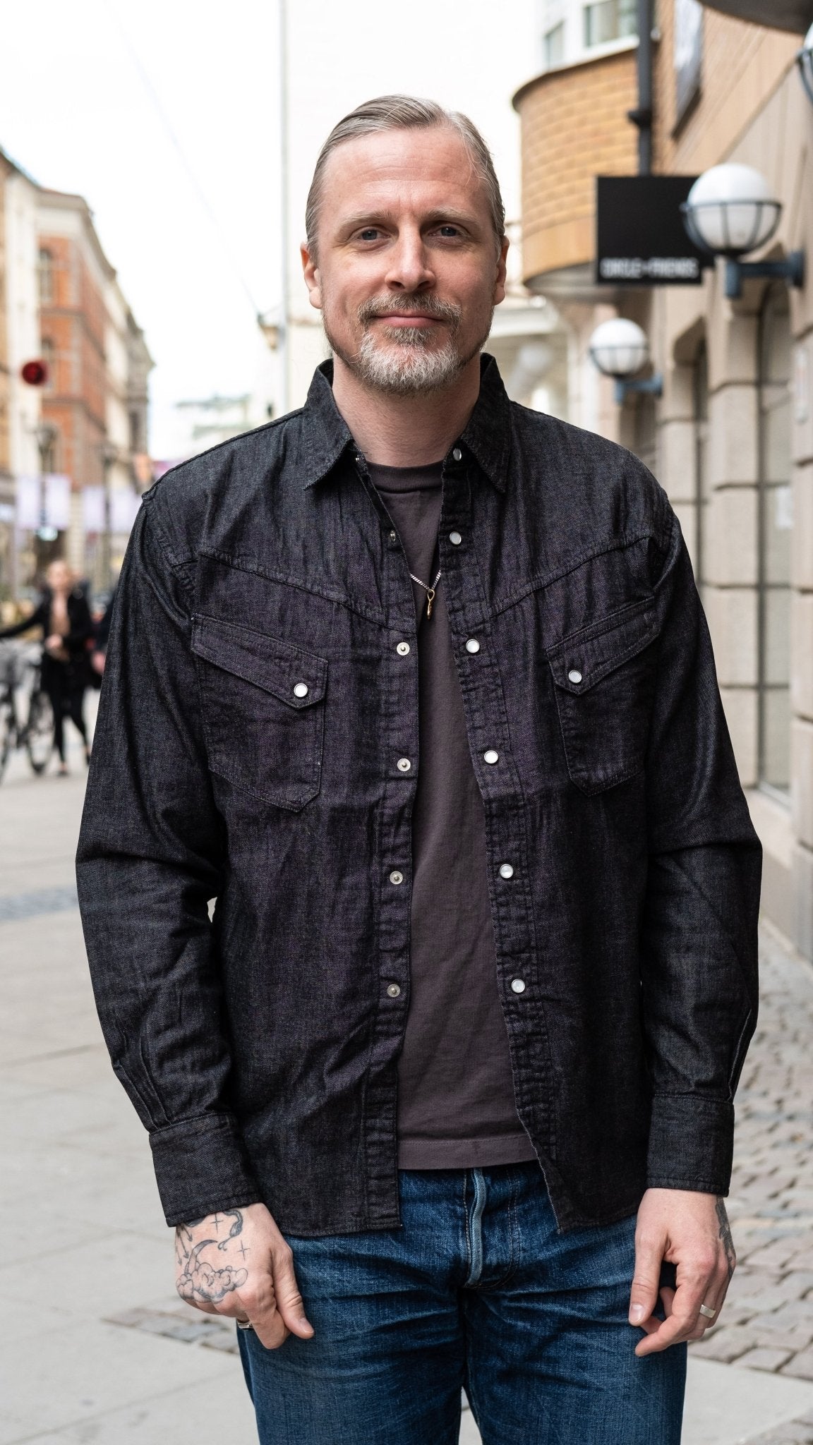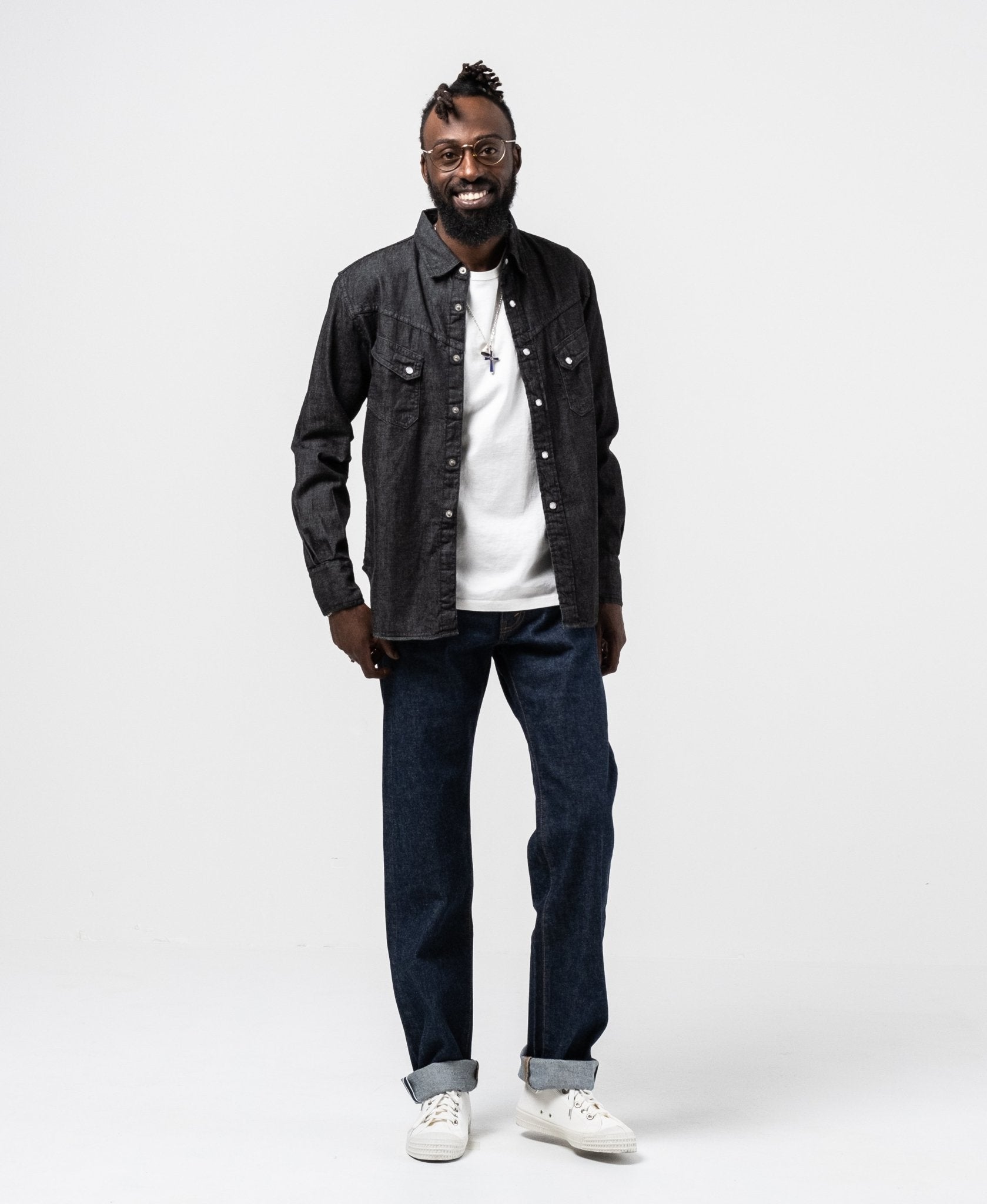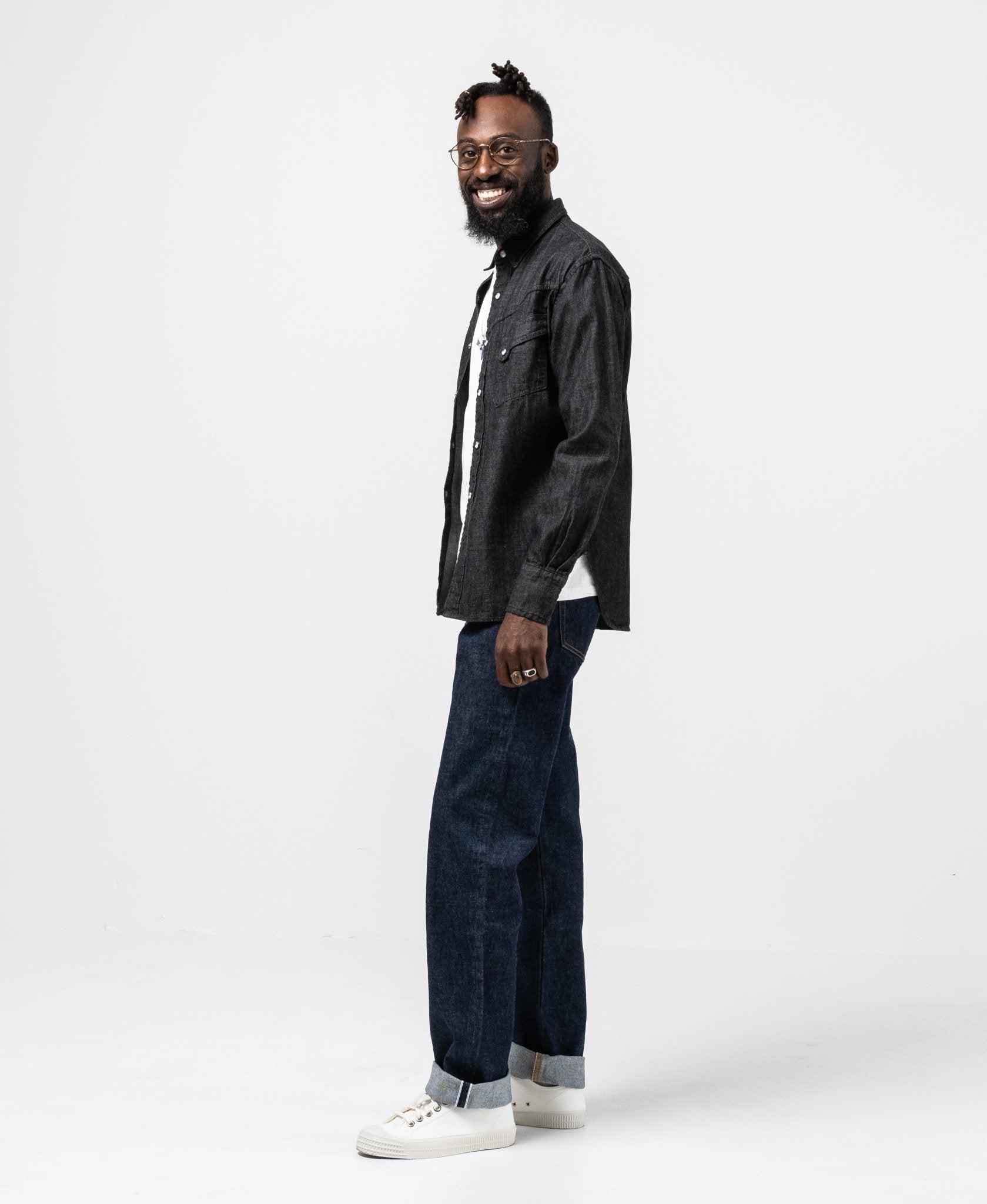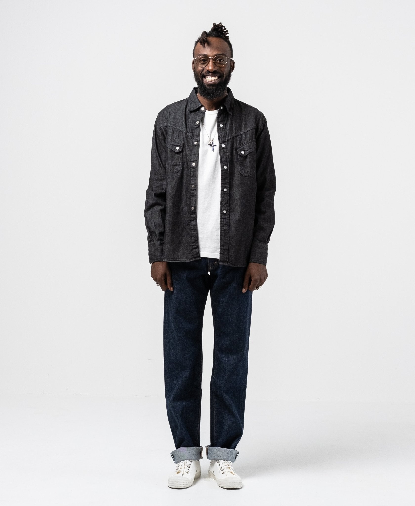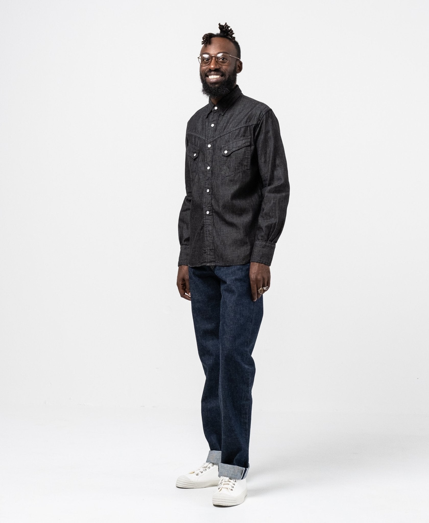 Ranchman Shirt Black Denim from TCB. This shirt has taken its inspiration from the 1940's western shirts. The details are very close to the original, which makes the silhouette slightly cleaner than the vintage version, hence easy to match with any style. The denim is made from 8.5 oz Californian cotton that is slowly woven on an old loom. It is a slightly lighter denim that has some unevenness to the the fabric. Made in Japan.