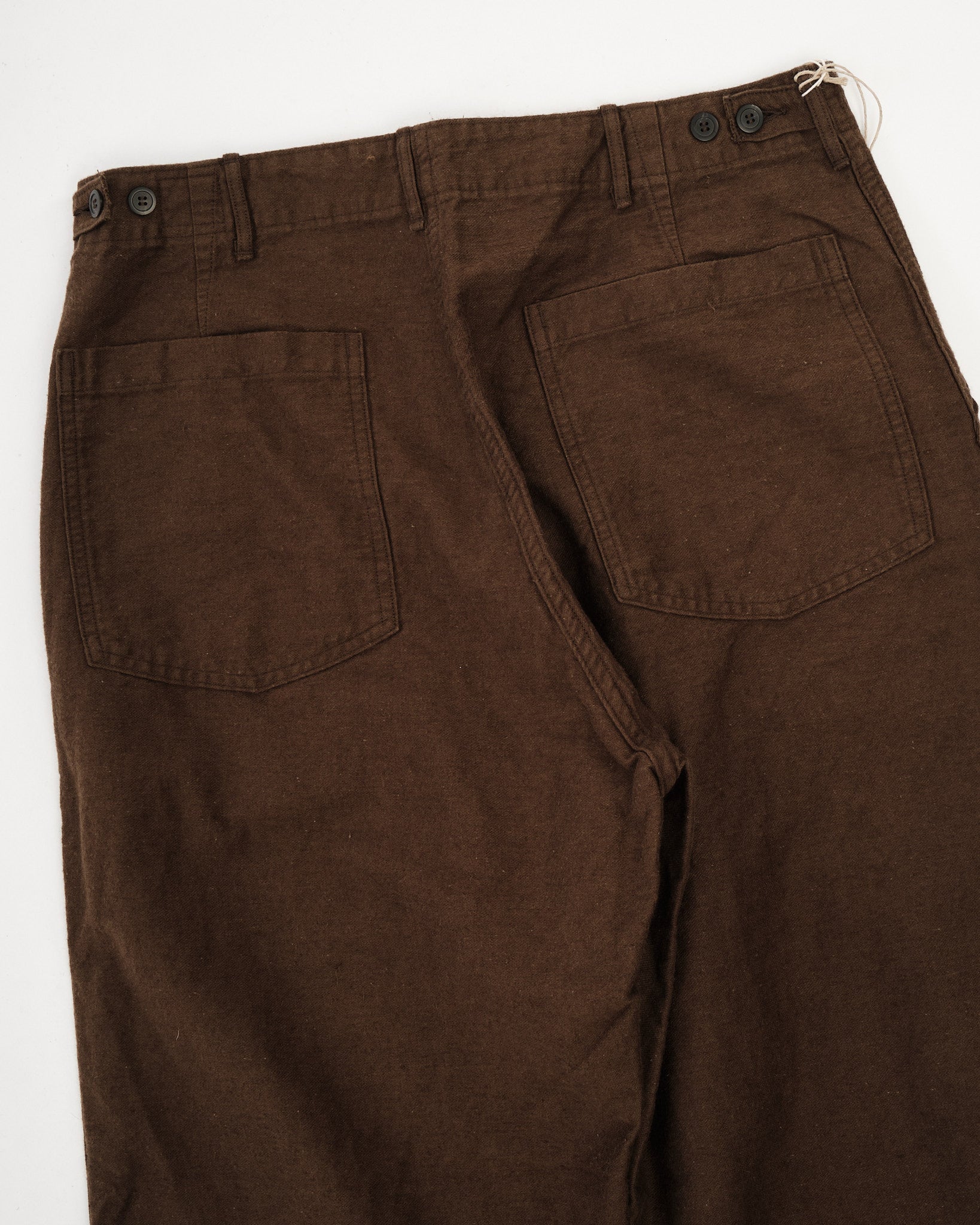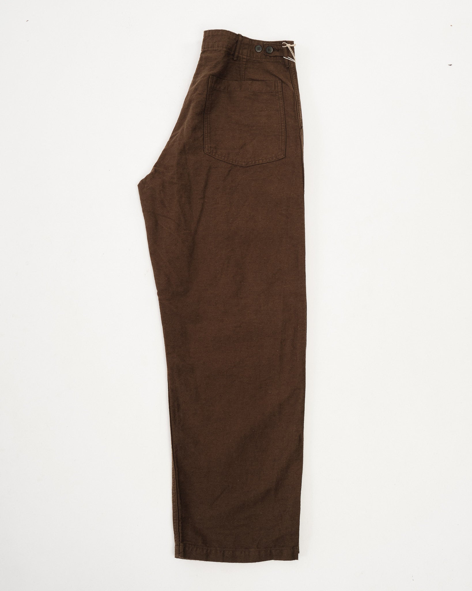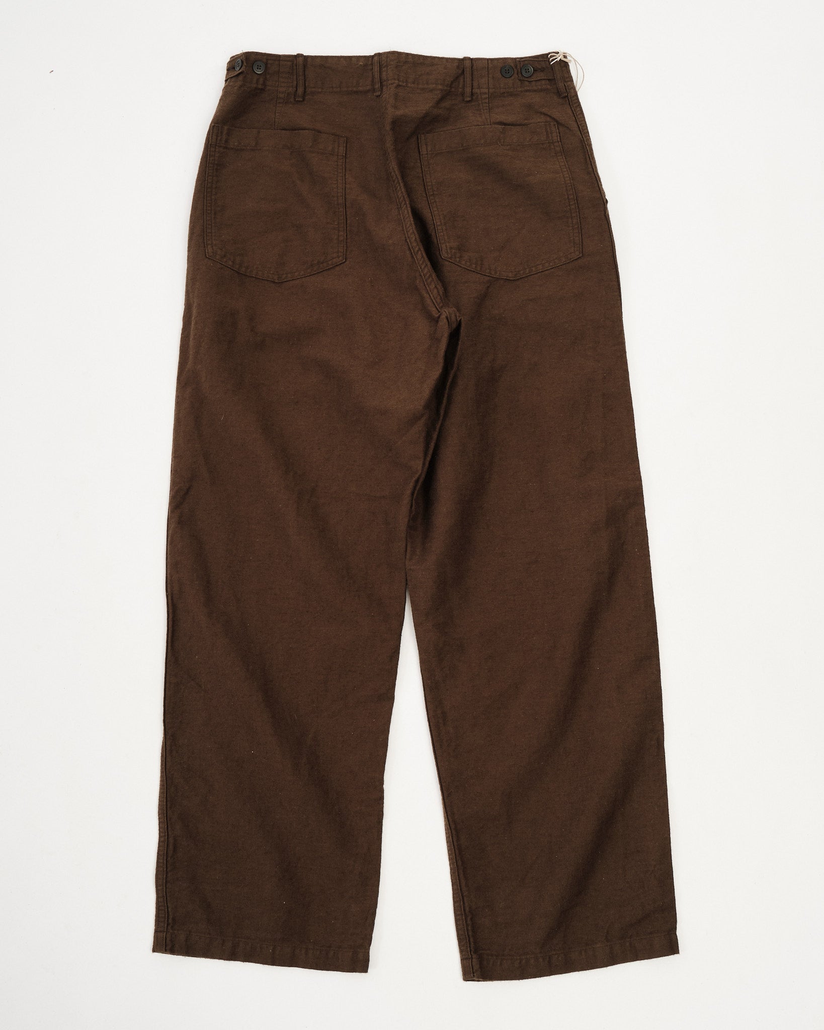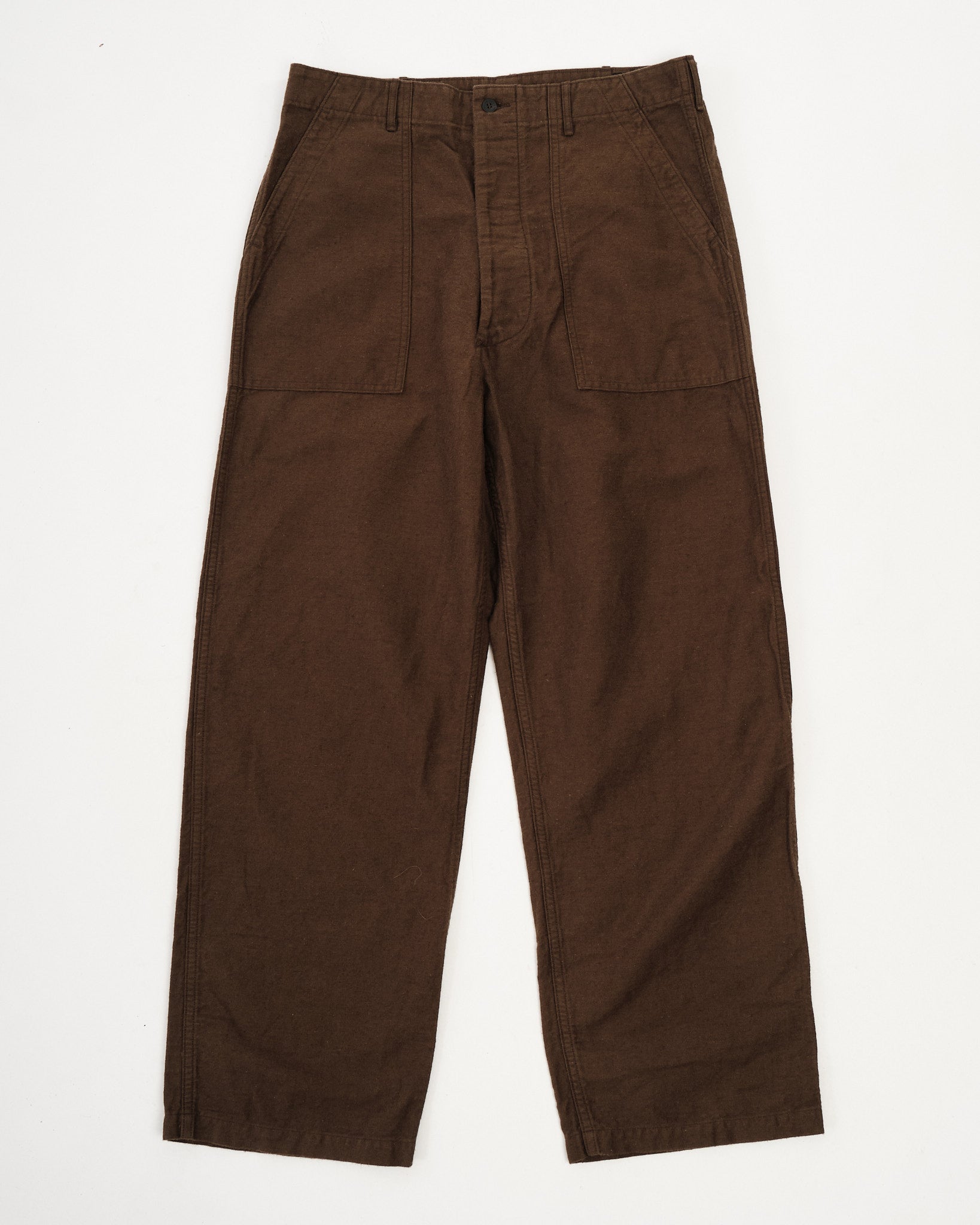 orSlow’s Relax Fit Cotton Linen Moleskin Fatigue Pants in Coffee Brown combine classic military design with refined Japanese craftsmanship. The cotton-linen moleskin fabric is soft, durable, and slightly brushed, giving it a rich texture that feels lived-in from day one. Cut in a relaxed silhouette with straight legs, these pants feature large fatigue pockets, adjustable waist tabs, and reinforced seams. The warm Coffee Brown tone adds depth and versatility — equally suited for workwear layering or casual everyday wear.