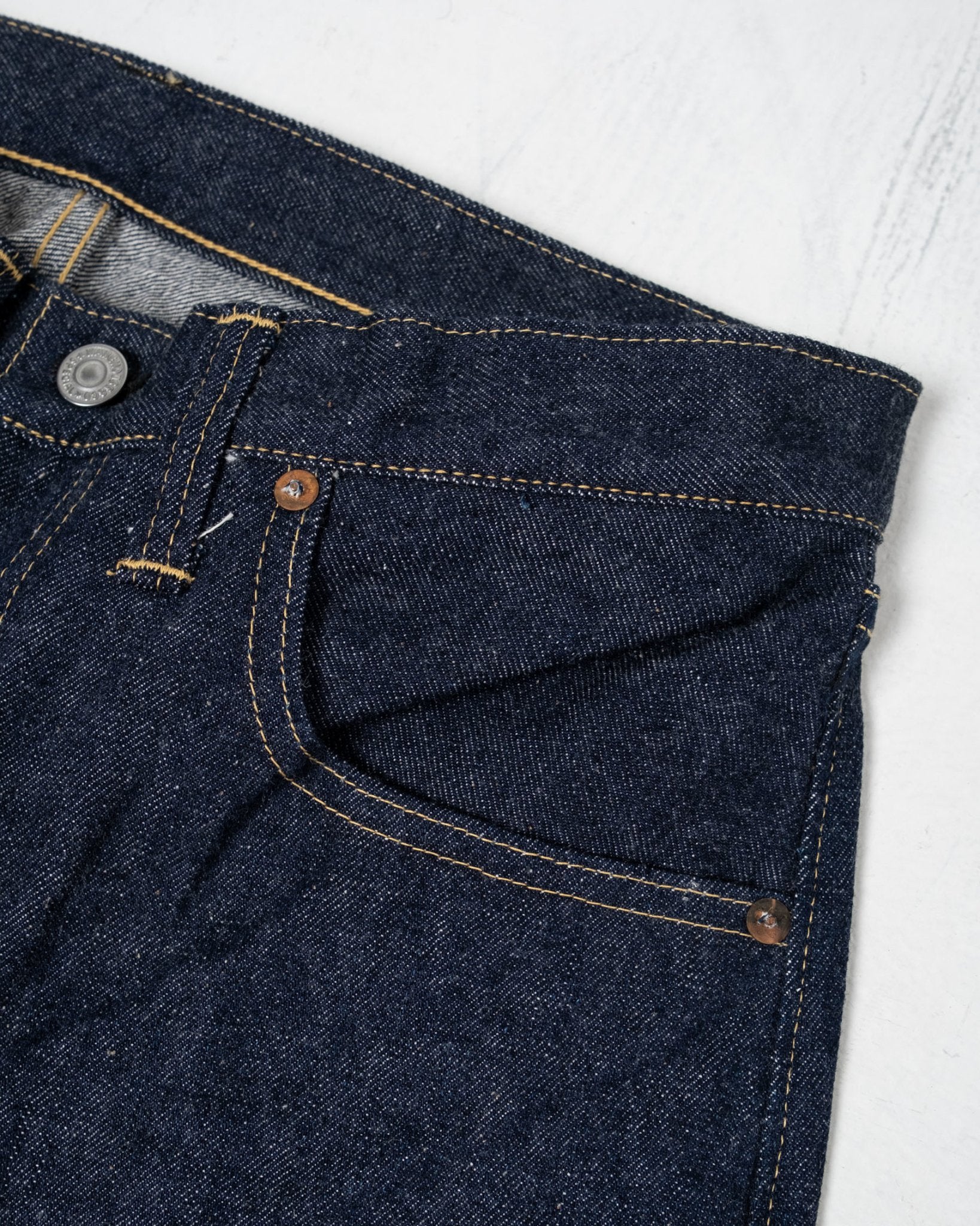 S1000XX Dead Stock Blue Shrink To Fit from Warehouse & CO. Here celebrating their 25th anniversary with a limit edition release of their iconic straight fit 1000XX jeans. Using original and custom technologies accumulated for over 25 years they have produced the Lot S1000XX shrink to fit model. Everything from leather labels, buttons, rivets, sewing threads and even the sewing machine setup required for sewing. The dead stock denim of the "WW2" era is reproduced from the thread count as it originally was. They have succeeded in reproducing not only the thread-count but also the rope dyeing of the indigo. A truly unique pair of denim pants. Made in Japan.