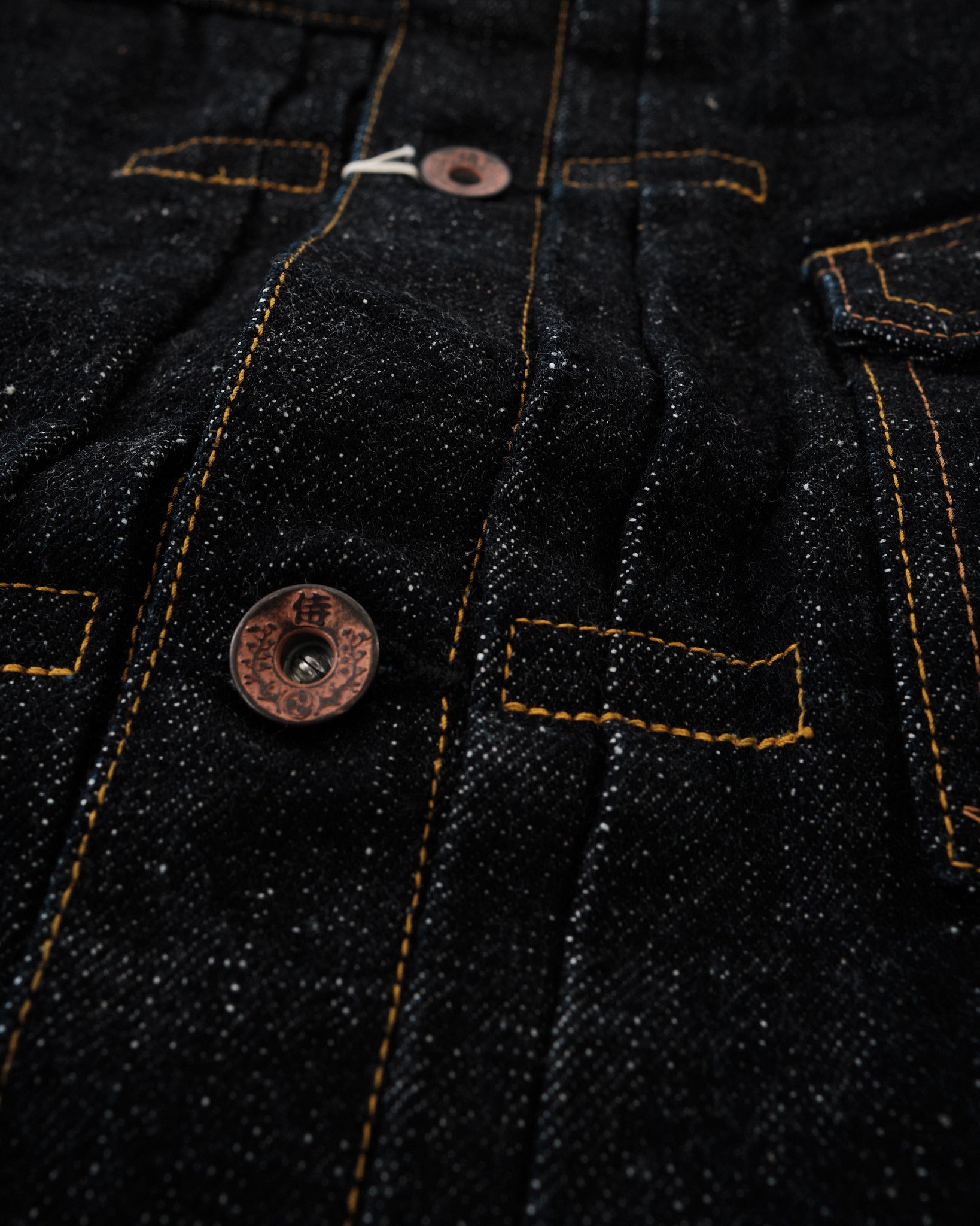 A standout feature is the T-back construction, a rare vintage detail historically reserved for larger sizes. Samurai revives this iconic design across the board, splitting the back into two joined panels for an authentic mid-century workwear feel. Finished with reddish-brown iron pine buttons, copper Samurai Co rivets, an exclusive leather patch, and serial numbering, the S556VX blends heavyweight denim strength with heritage accuracy.