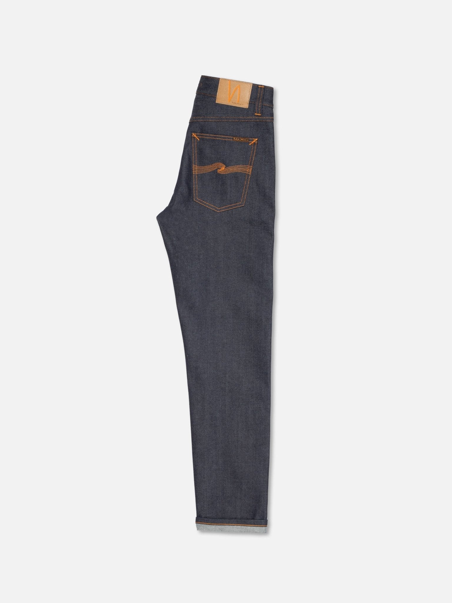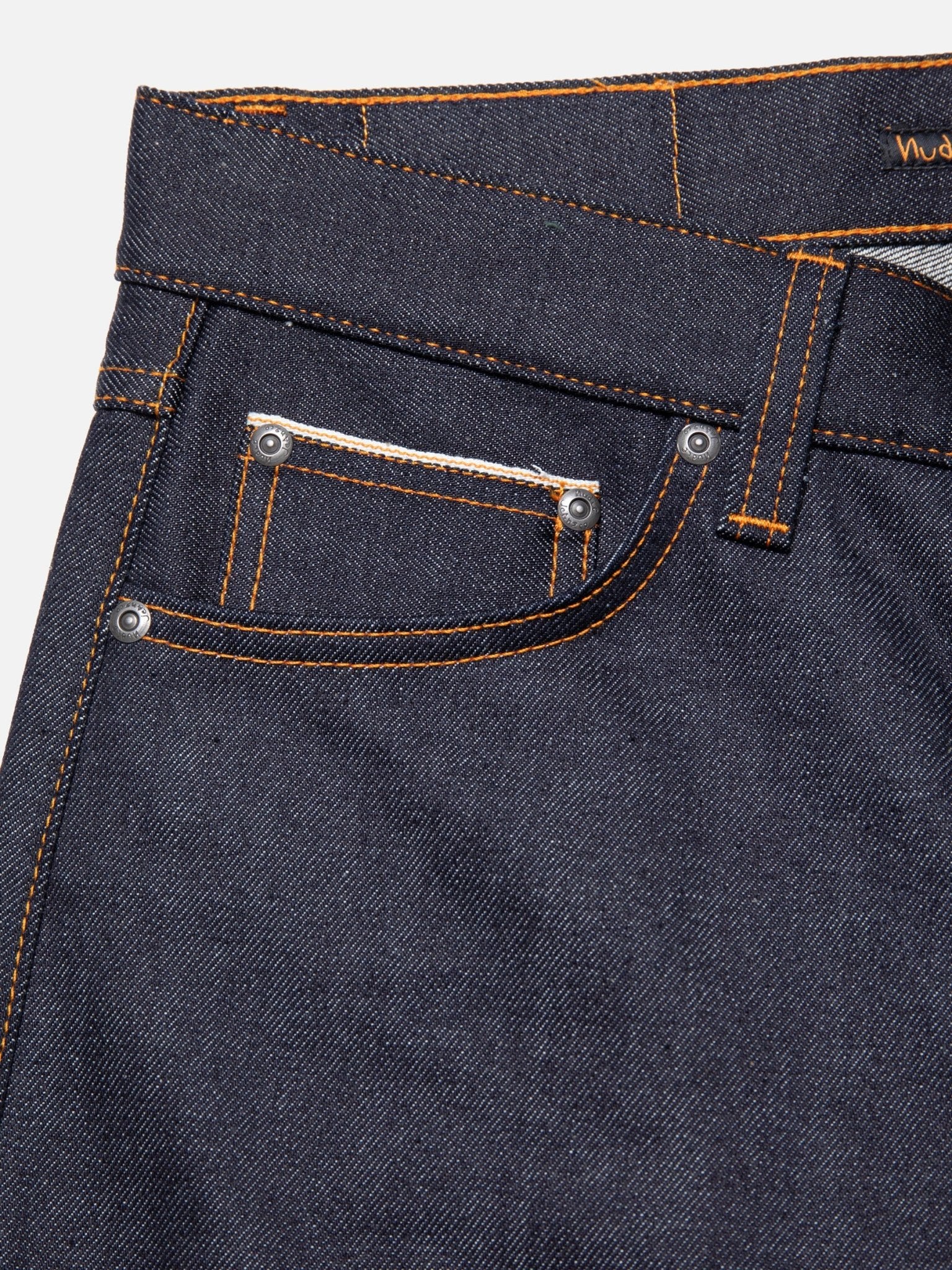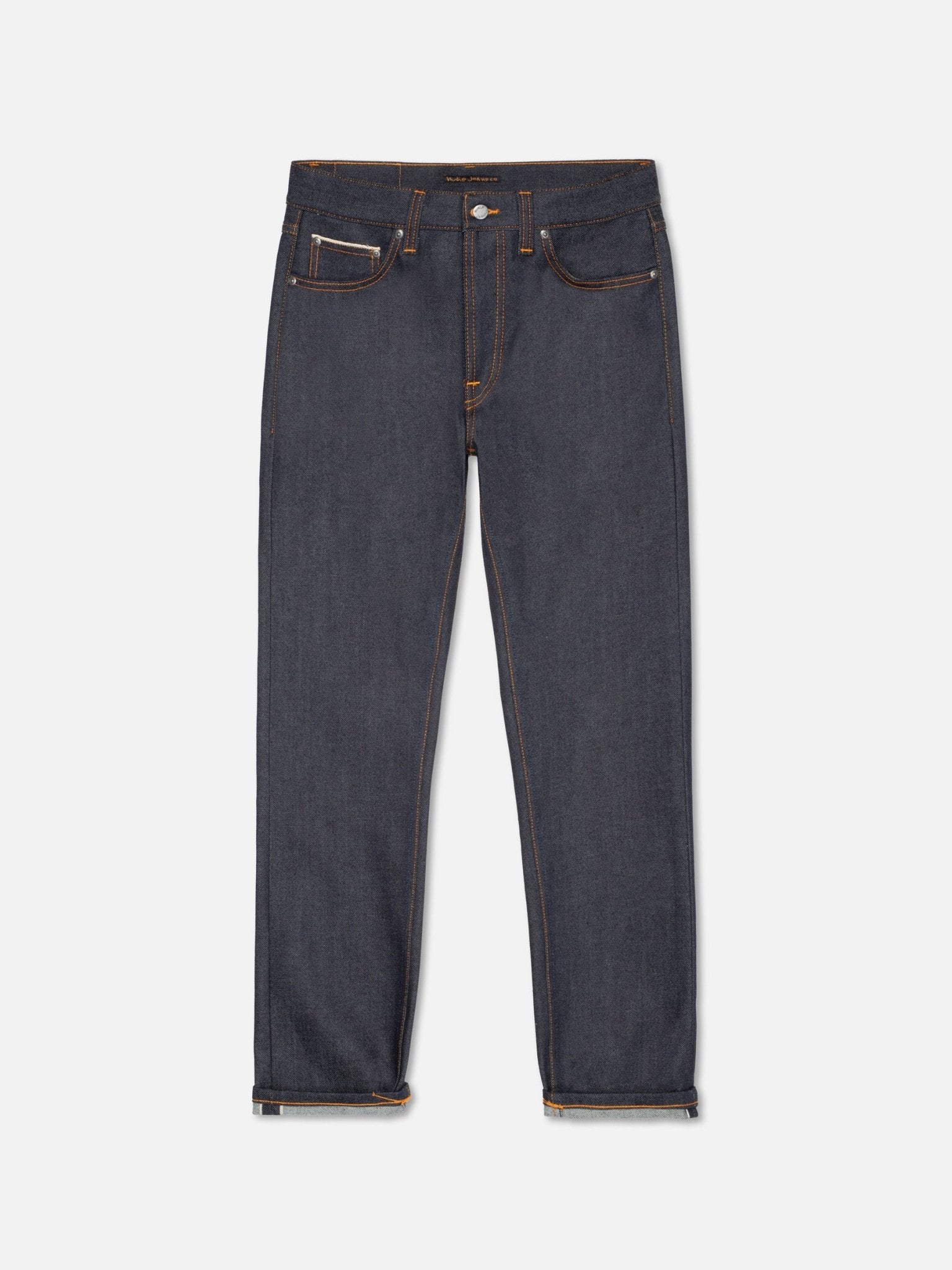 Premium Japanese Selvage Denim – Made from 13.5 oz. comfort stretch selvage denim sourced from Japan’s renowned Kaihara Mills. Organic Cotton Construction – Crafted with 98% organic cotton, offering durability with an eco-friendly touch. Comfort Stretch Technology – Features 2% elastane, giving you that raw denim look with a bit more flexibility. Authentic Indigo Dyeing – Dyed using a 20-dip pure indigo process, creating a rich, deep color that fades uniquely over time. Timeless Regular Fit – A regular fit with a mid waist and slim leg, perfect for an effortless, everyday style. Classic 5-Pocket Design – A traditional five-pocket setup keeps it functional and timeless. Signature Nudie Details – Contrasting orange thread stitching adds a subtle pop of character. Vintage-Inspired Hardware – Antique silver trims for a refined, old-school finish. Durable Button Fly Closure – Traditional button fly adds to the authenticity and longevity of the jeans. Jacron Brand Patch – A sustainable, paper-based leather alternative patch displaying the Nudie logo. Product code - 114742