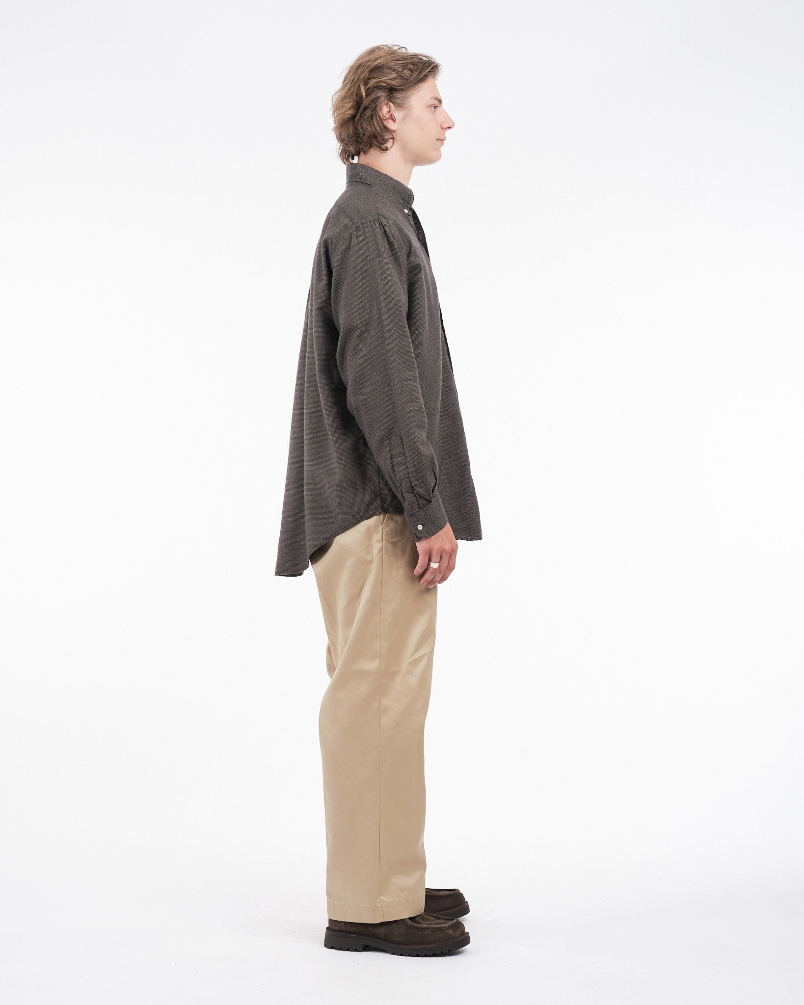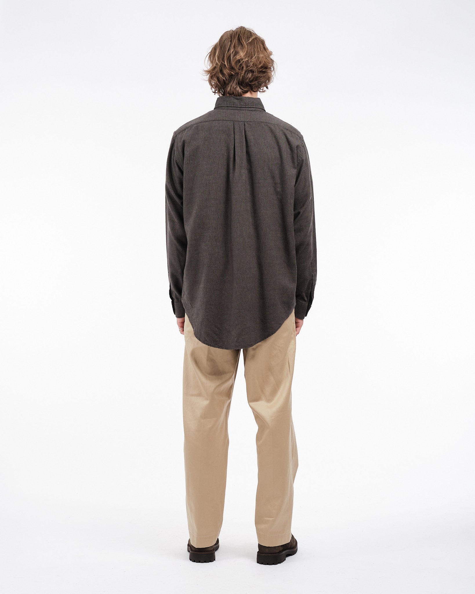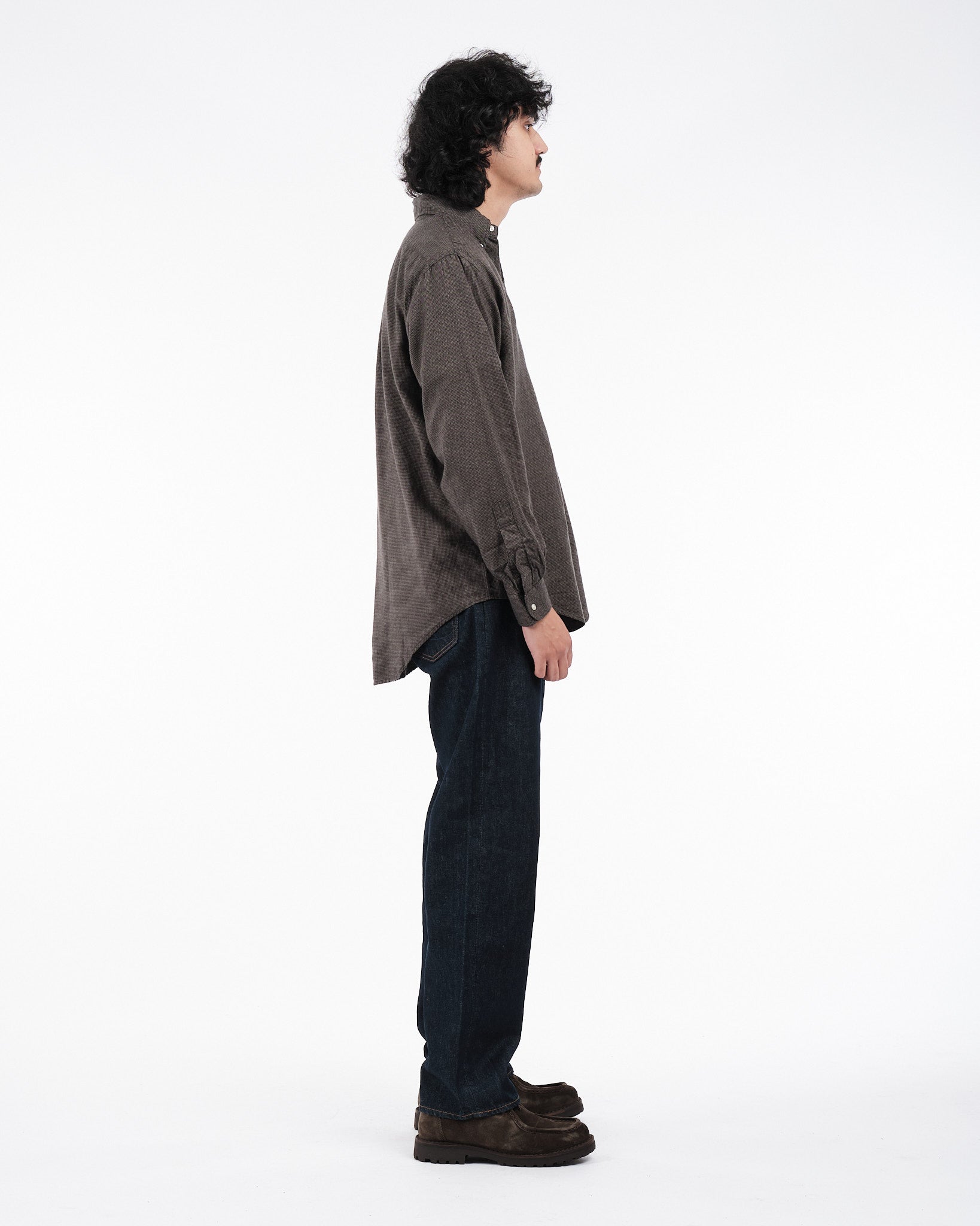 Presenting the Charcoal Gray Orslow Standard Button Down Shirt, made in Japan. This shirt is created from a cotton and lyocell fabric blend with a micro check pattern providing a lightweight yet sturdy feel. The classic button down collar, adorned with Mother Of Pearl buttons brings an everlasting elegance to this essential piece of clothing. Perfect, for changing seasons this shirt guarantees both comfort and style without compromise.