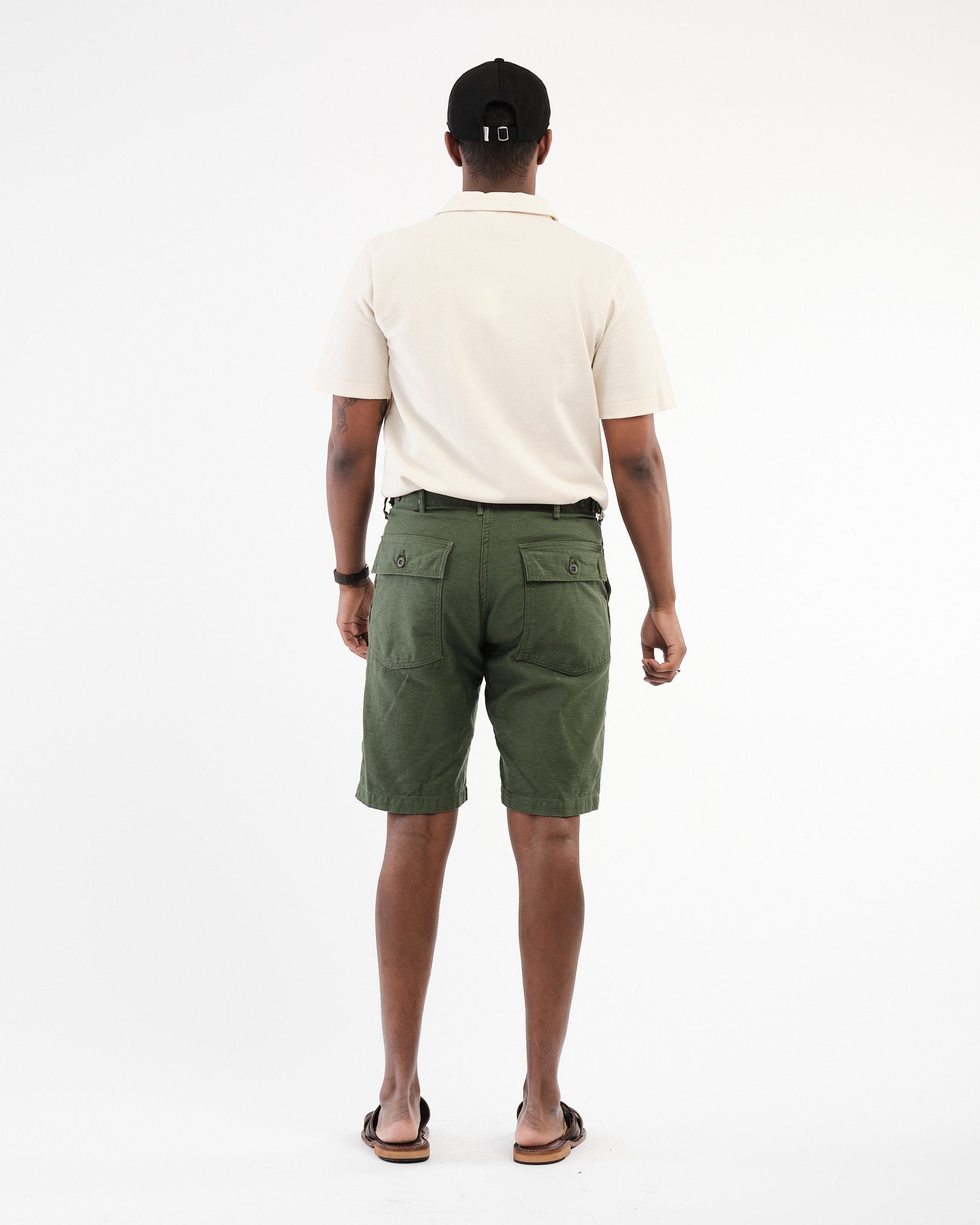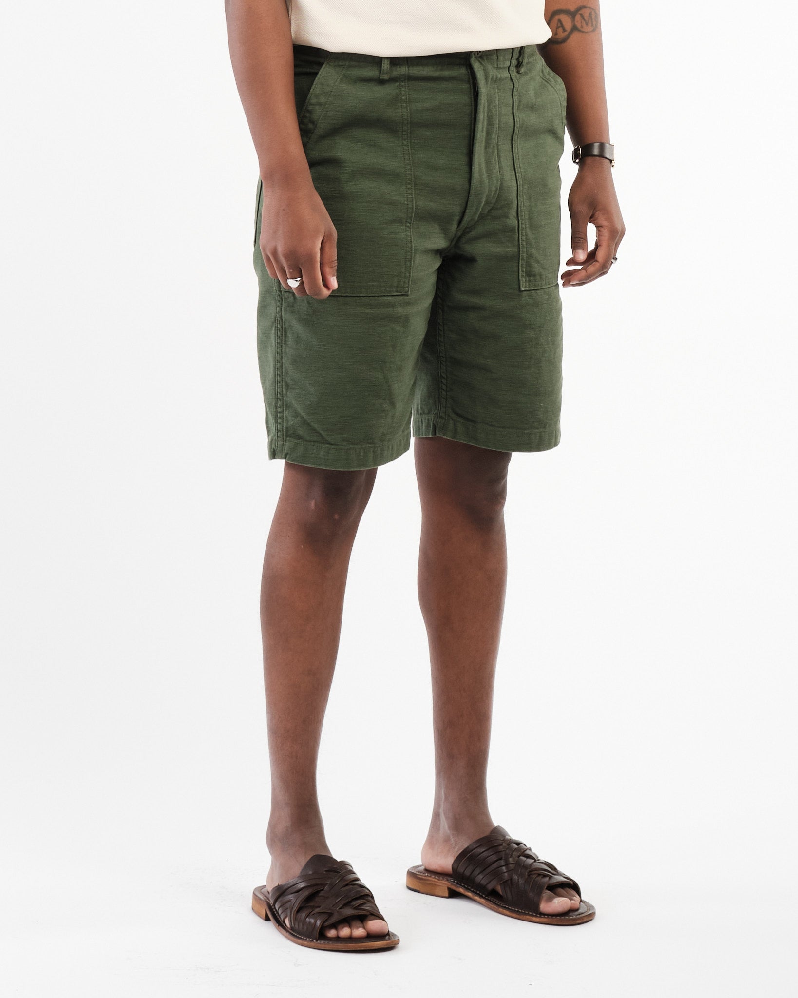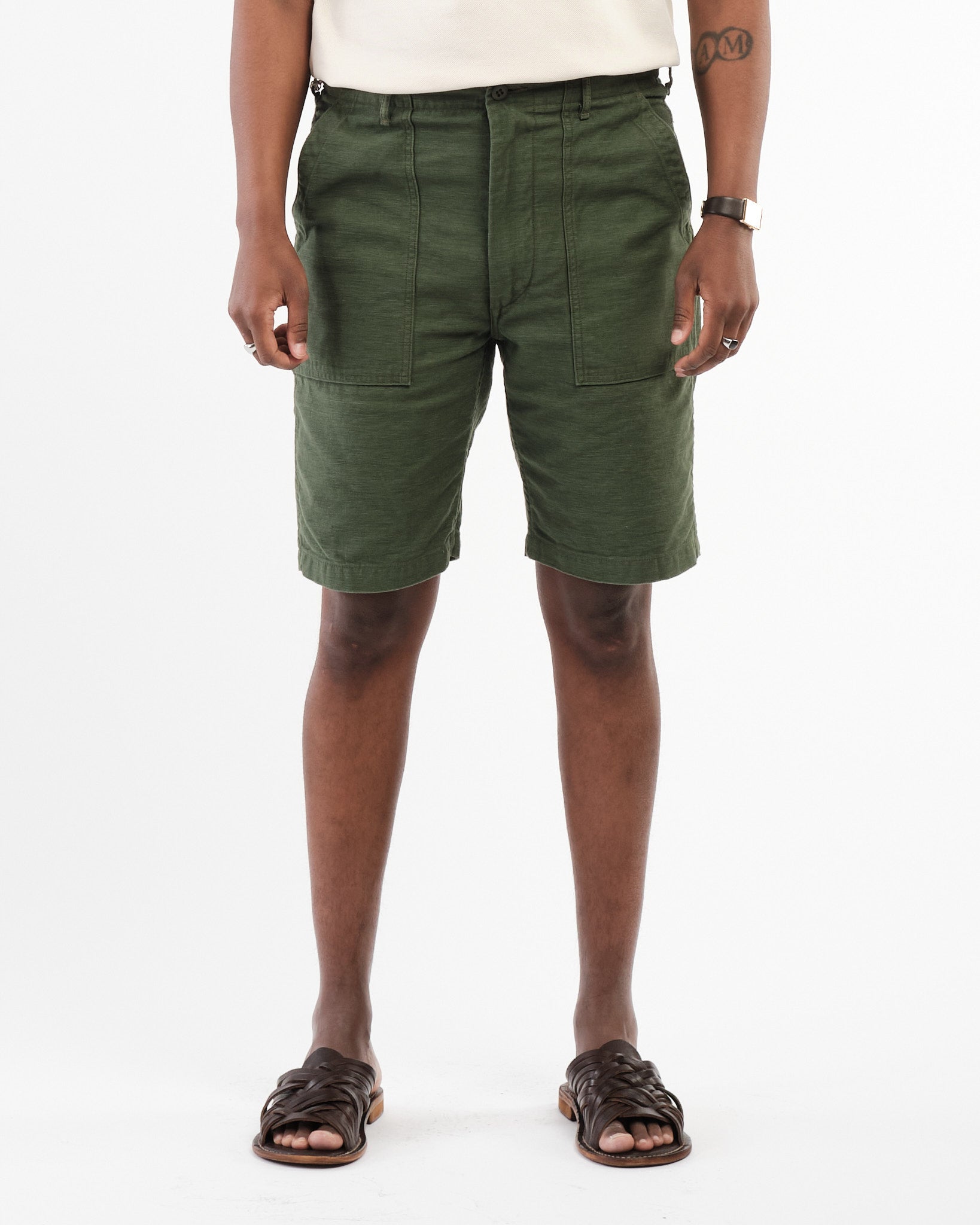 Get the classic workwear vibe with a touch in orSlows US ARMY FATIGUE SHORTS in GREEN. Since 2005 orSlow has been creating clothing in Japan focusing on reinterpreting pieces from a contemporary perspective rather than just replicating them. Their take on the classic fatigue shorts retains the cut of fatigue pants but adapts it into a shorter version suitable for warmer weather. These shorts are crafted from cotton sateen fabric that is made today using the techniques as in the mid 20th century. They come with patch pockets at the square shaped pocket flaps that cover the back pockets. Functional details like belt loops and side adjusters on the hips ensure a fit while the pre washed fabric guarantees that the shorts will maintain their shape and size without shrinking.. Made in Japan orSlows US ARMY FATIGUE SHORTS showcase the brands commitment, to high quality construction, comfort and timeless style.