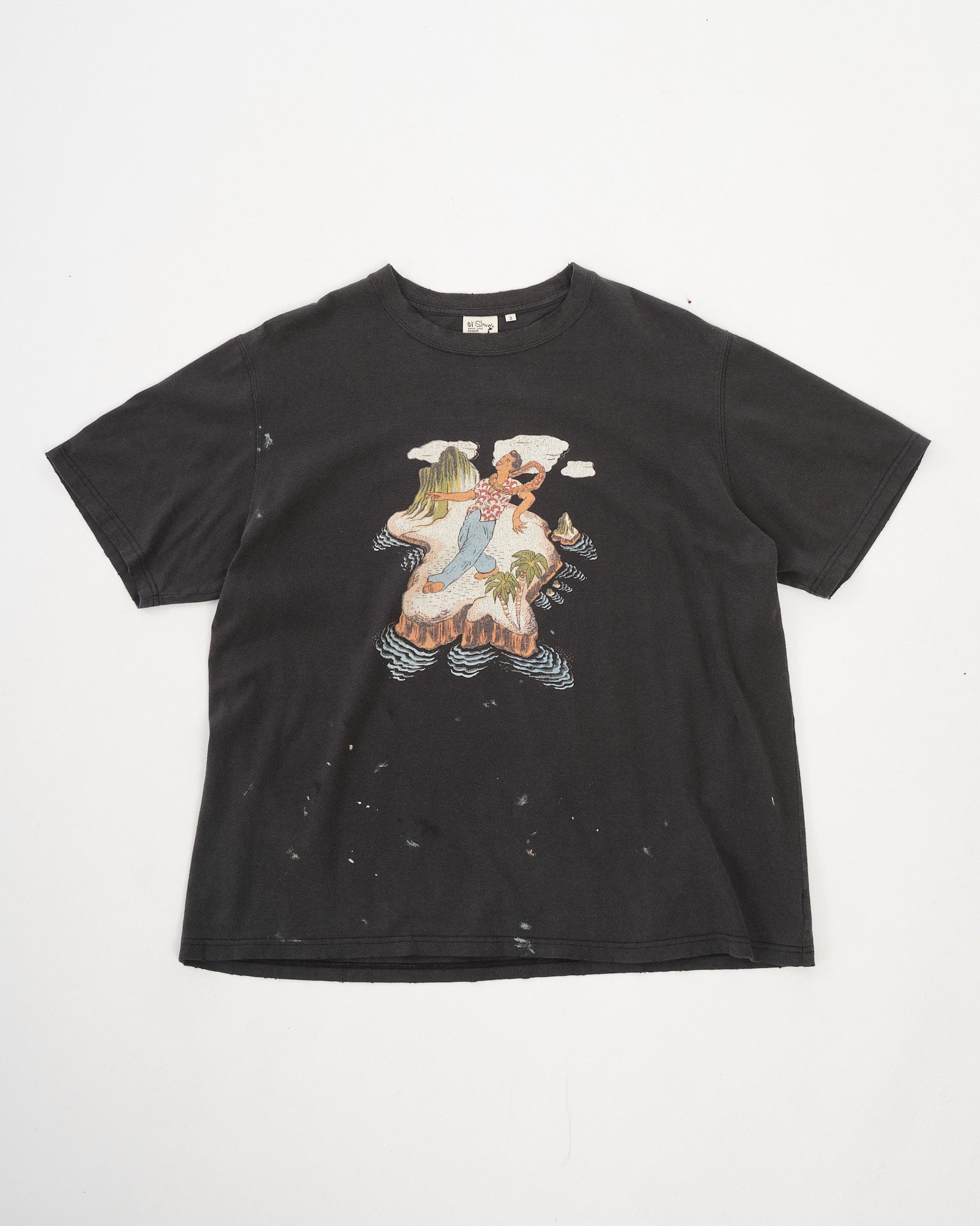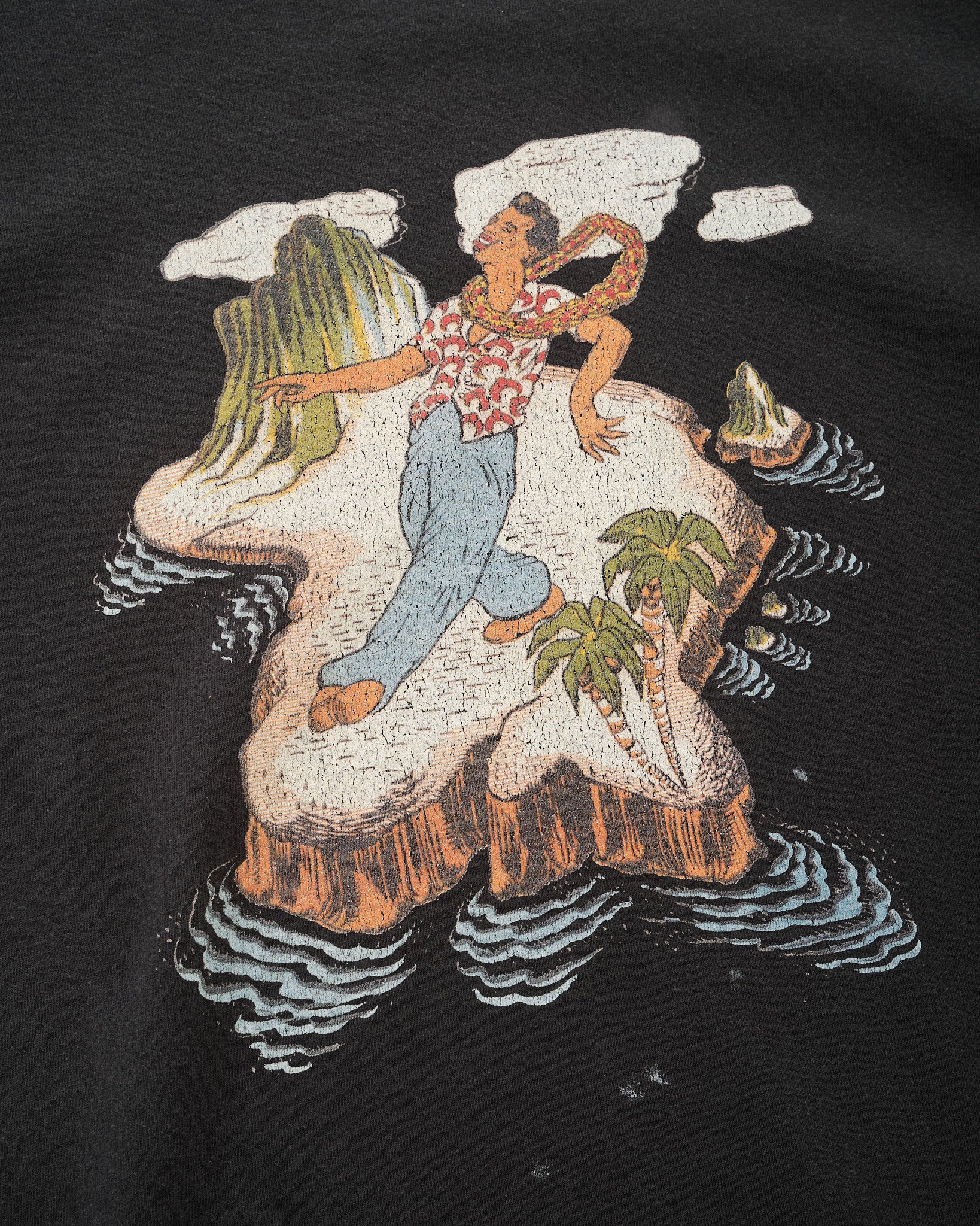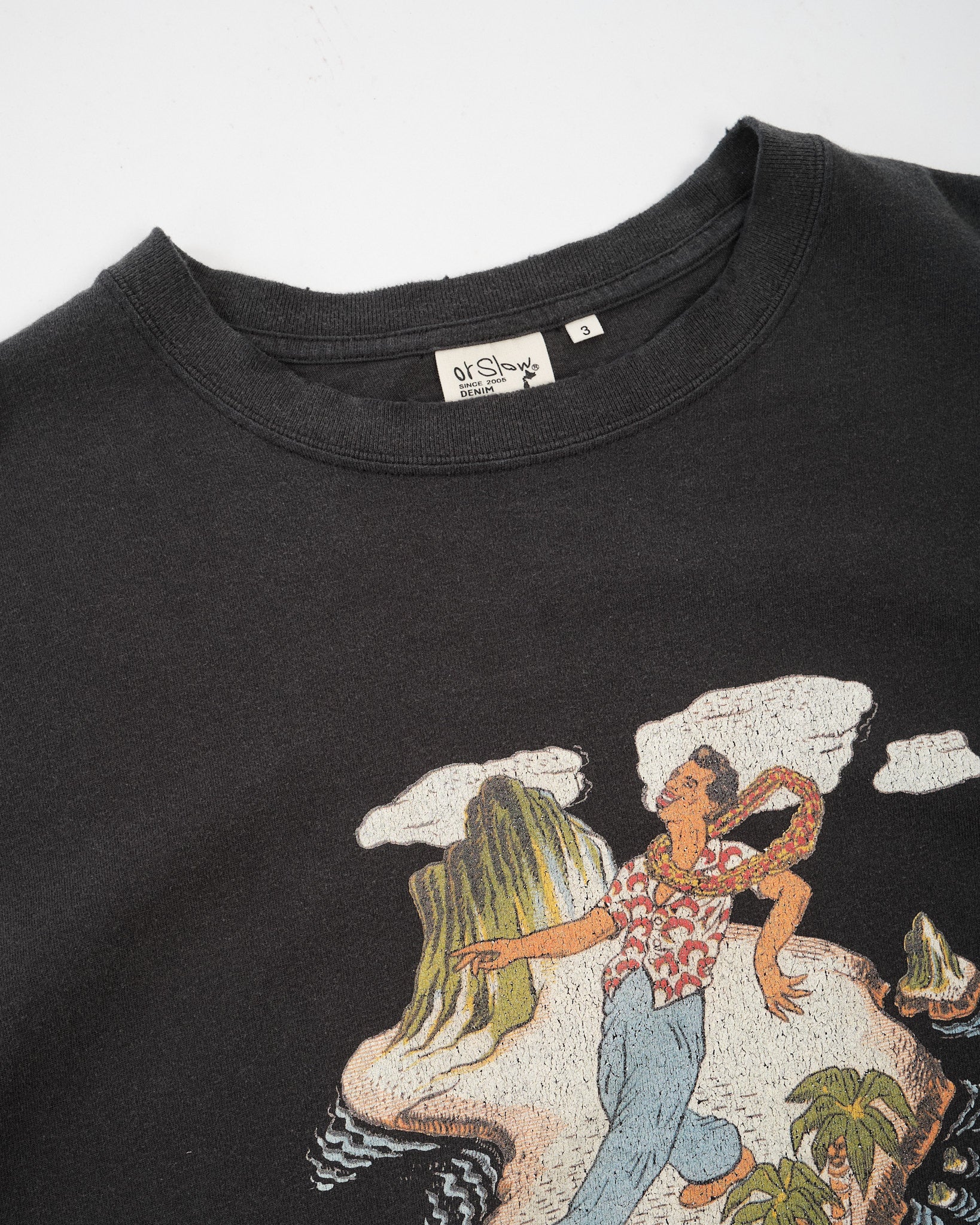Made from soft cotton jersey, the fabric has a naturally broken-in character that complements the faded graphic print. The Hawaiian-inspired artwork is intentionally distressed, creating an authentic, timeworn expression rather than a sharp, newly printed look.