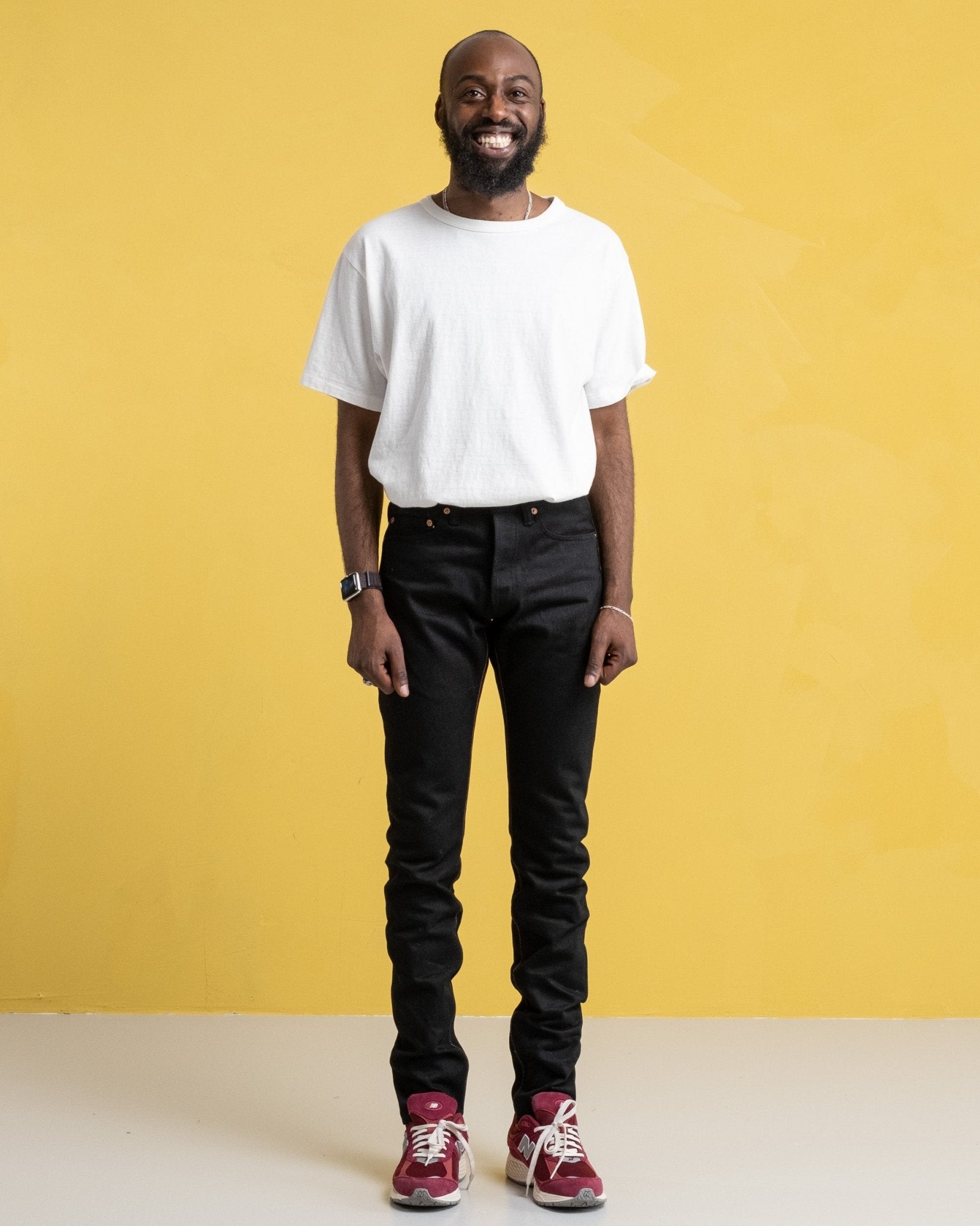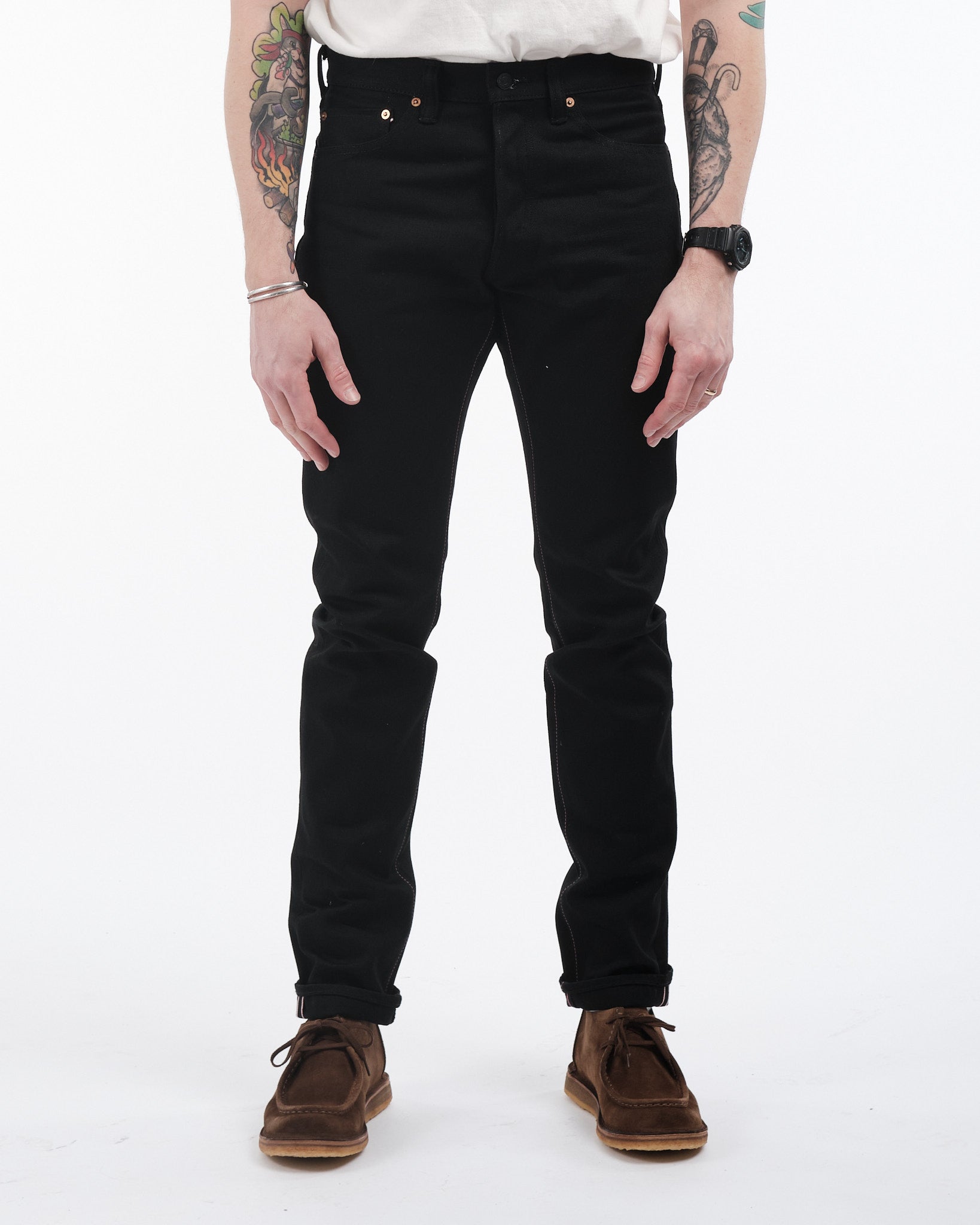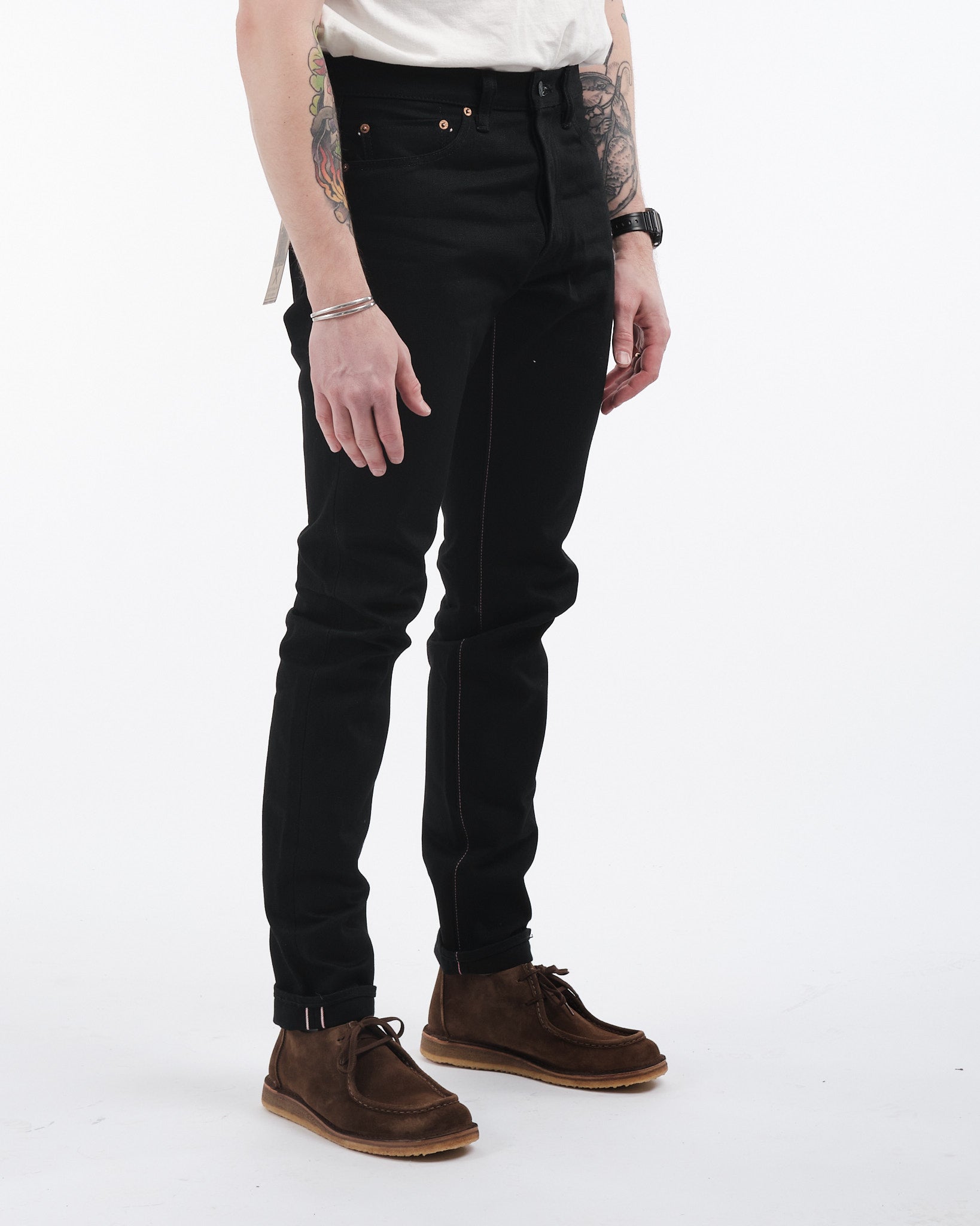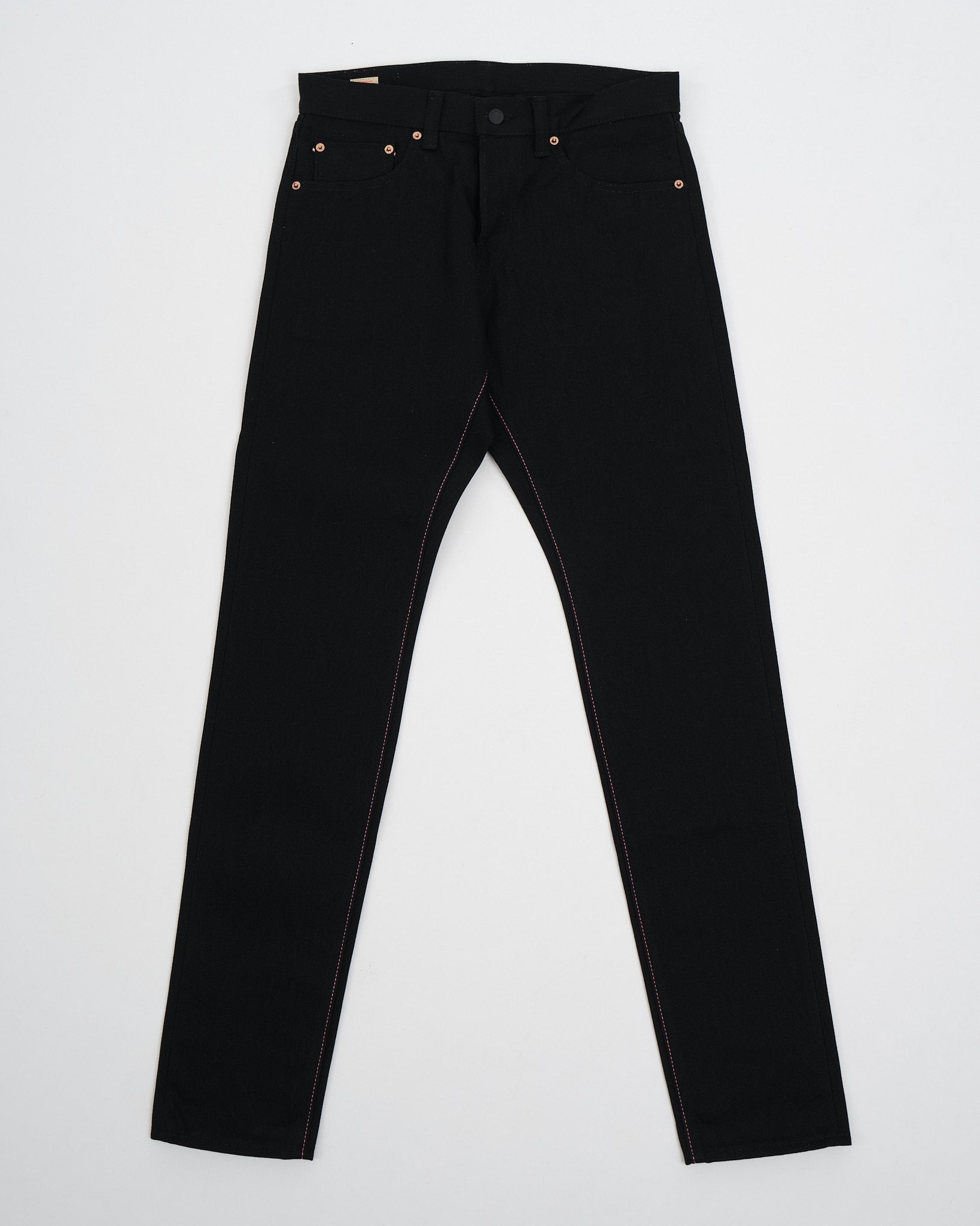 Jeansen erbjuder en hög taperad passform som är idealisk för dem som föredrar en smal silhuett men önskar rymlighet runt lårområdet. Tillverkade med noggrann uppmärksamhet på detaljer har de svarta belagda järnknappar, dolda nitar, signatur persika-rosa selvedge och anpassad jacquardfoder i fickan. Upplev lyxen av fin hantverk och avantgarde-tyger, designade och utvecklade internt på Collect Mills, under varumärket Momotaro.