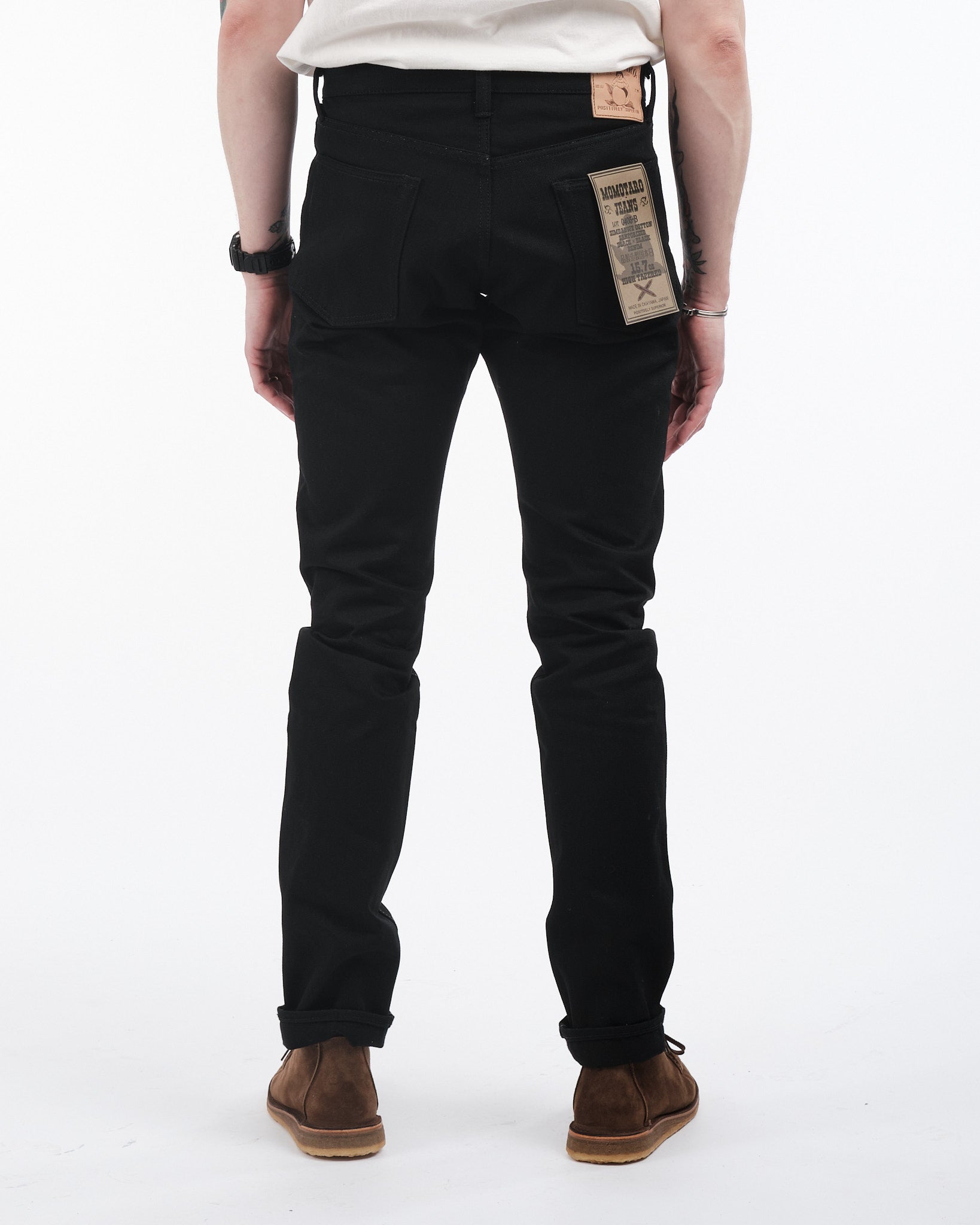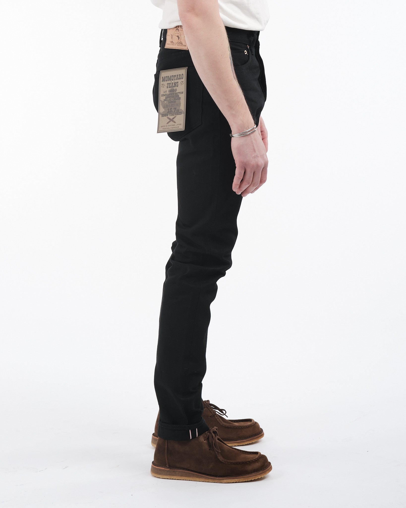 Introducerar 0405-B High Tapered Jeans av Momotaro, en klass av denim som överträffar normer och förväntningar. Tillverkad exklusivt för den kräsna konsumenten är detta unika par jeans skuret från superfin, ultrastark 15,7 oz Zimbabwe-bomull selvedge denim. Vävt på vintage-vävstolar visar tyget en läcker dubbel-svart färgväg med både svart varp och inslag.