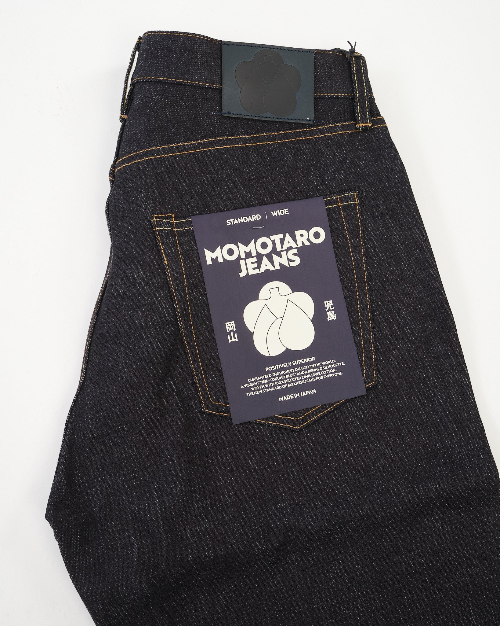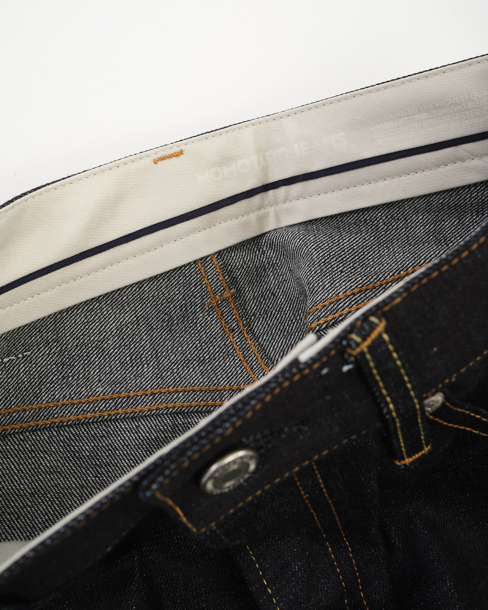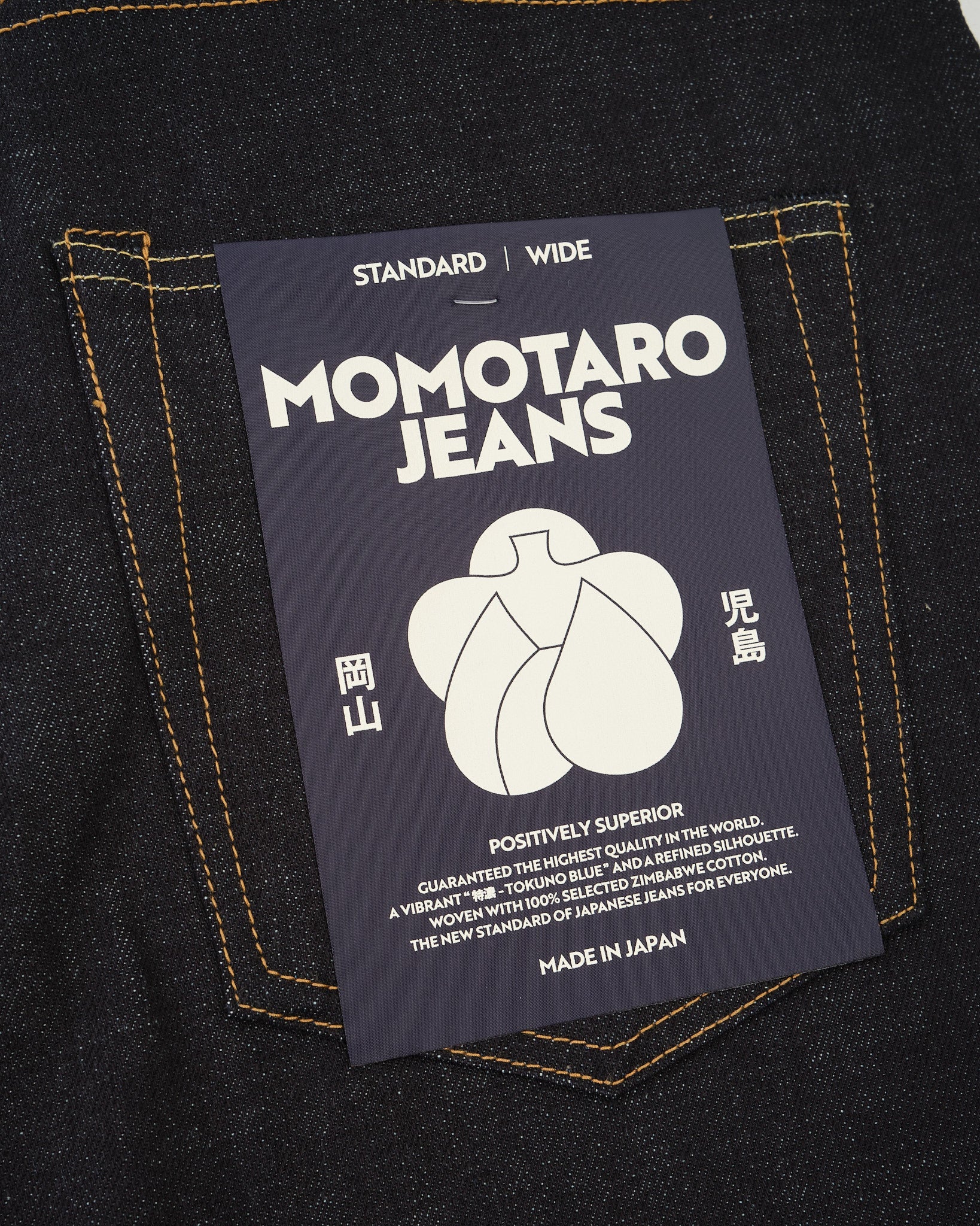 The #400 Wide Fit 14.7oz Rigid Denim by Momotaro is built for those who value freedom of movement without sacrificing precision. Crafted in Japan from 100% Zimbabwe cotton and dyed in the brand’s iconic 特濃 Tokuno Blue, this unwashed selvedge denim delivers a richly saturated indigo tone with a distinct twill texture. The fabric is engineered with finer weft yarns and processed to minimize post-wash shrinkage, easing sizing concerns common to rigid denim. The #400 cut is Momotaro’s most relaxed fit, featuring generous room through the thigh and a gentle taper to maintain shape. A slightly deeper rise provides a secure fit at the waist, while a clean silhouette allows for grace and ease in motion. Finished with a cowhide leather patch, waistband curtain, and button fly, this pair is as enduring as it is easygoing — complete with a permanent repair warranty.