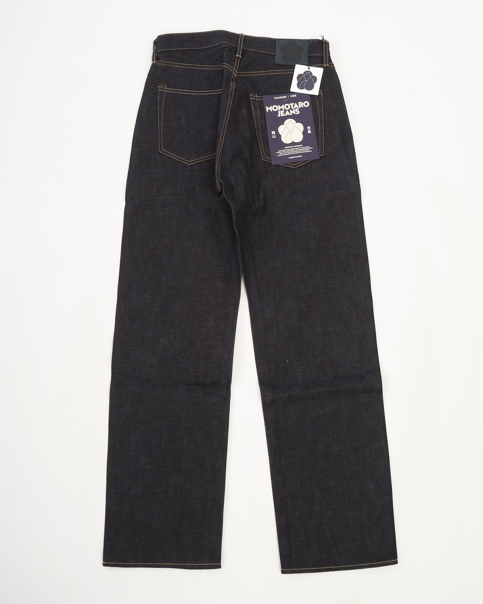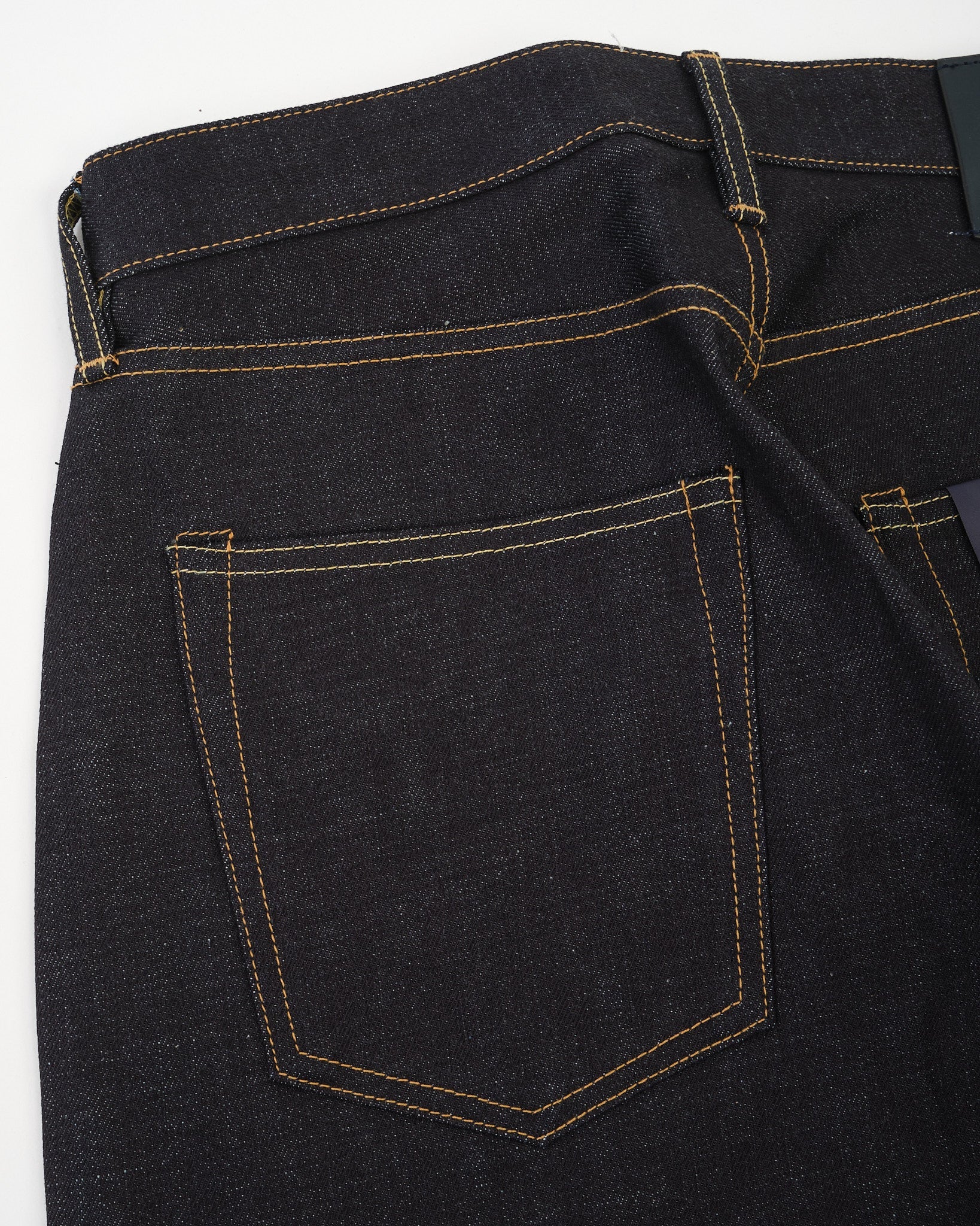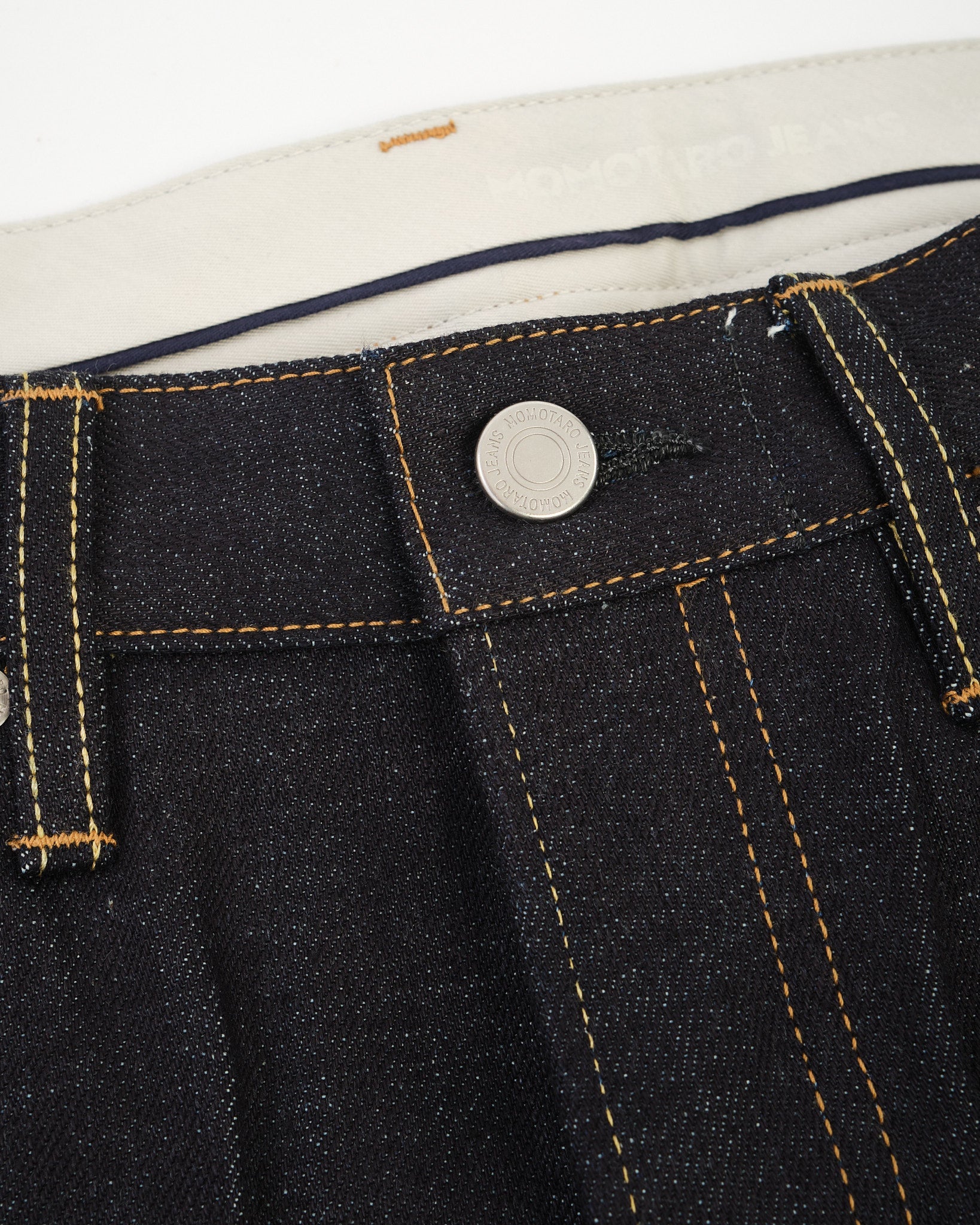 The #400 Wide Fit 14.7oz Rigid Denim by Momotaro is built for those who value freedom of movement without sacrificing precision. Crafted in Japan from 100% Zimbabwe cotton and dyed in the brand’s iconic 特濃 Tokuno Blue, this unwashed selvedge denim delivers a richly saturated indigo tone with a distinct twill texture. The fabric is engineered with finer weft yarns and processed to minimize post-wash shrinkage, easing sizing concerns common to rigid denim. The #400 cut is Momotaro’s most relaxed fit, featuring generous room through the thigh and a gentle taper to maintain shape. A slightly deeper rise provides a secure fit at the waist, while a clean silhouette allows for grace and ease in motion. Finished with a cowhide leather patch, waistband curtain, and button fly, this pair is as enduring as it is easygoing — complete with a permanent repair warranty.