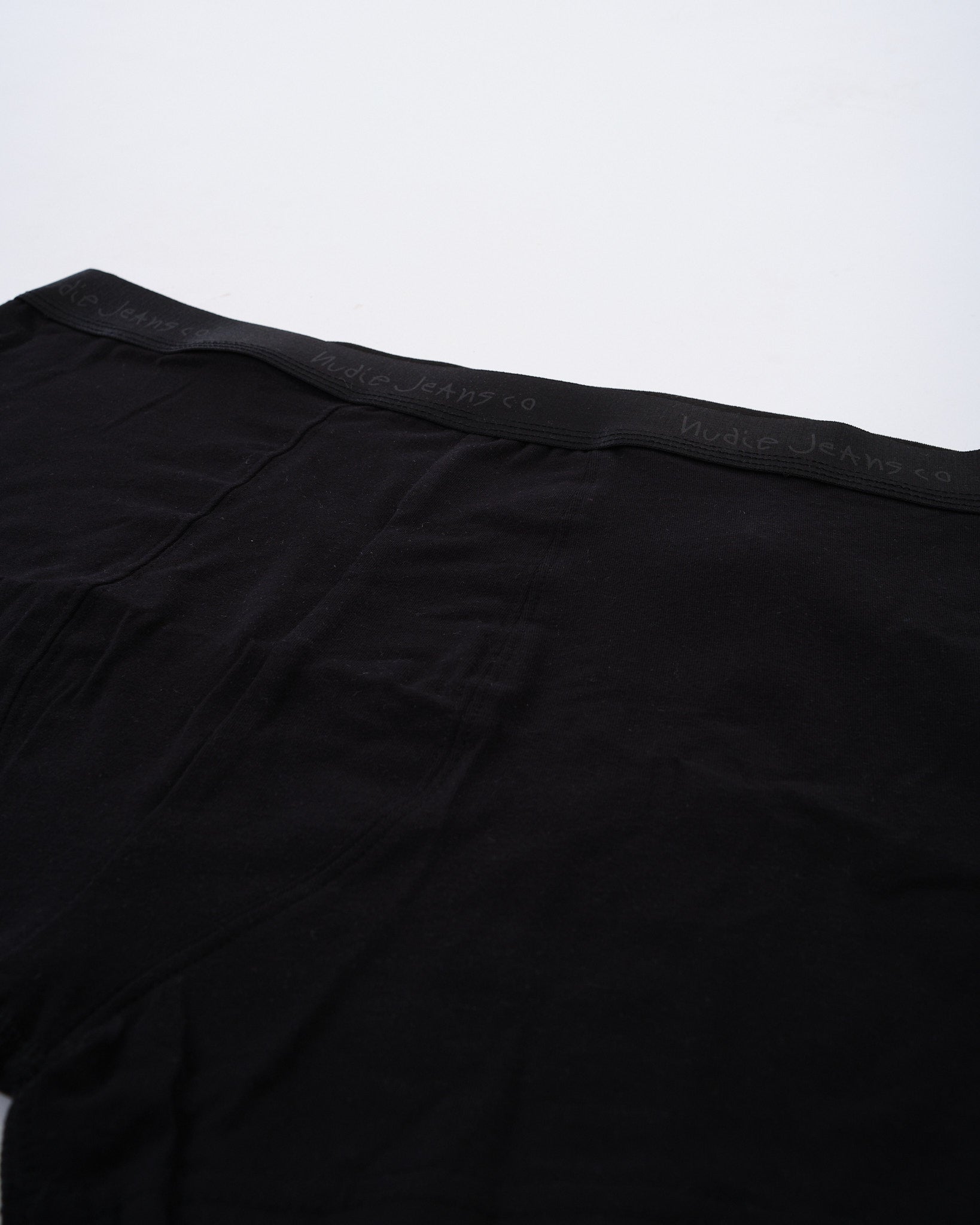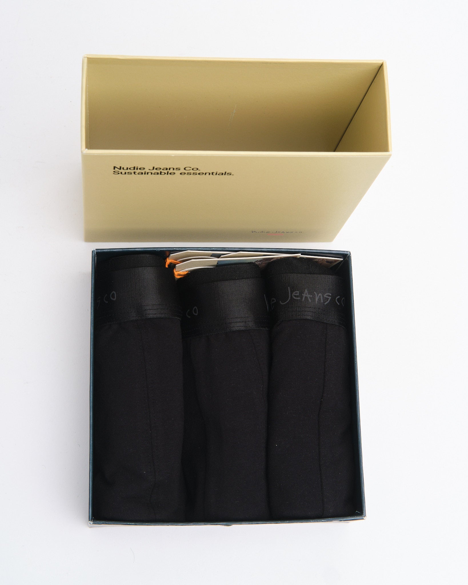 Wear Nudie from layer one with this essential 3-pack of Boxer Briefs in black. Made from organic and Fairtrade cotton jersey, they offer a regular fit with an updated cut: slightly longer legs, a more shaped center seam, and a roomier feel for comfort. Instead of an itchy label, you’ll find a printed detail on the inside. Each pack comes in a recycled cotton cardboard box, part of the Nudie Jeans Essentials line. A small everyday upgrade that feels good inside and out.