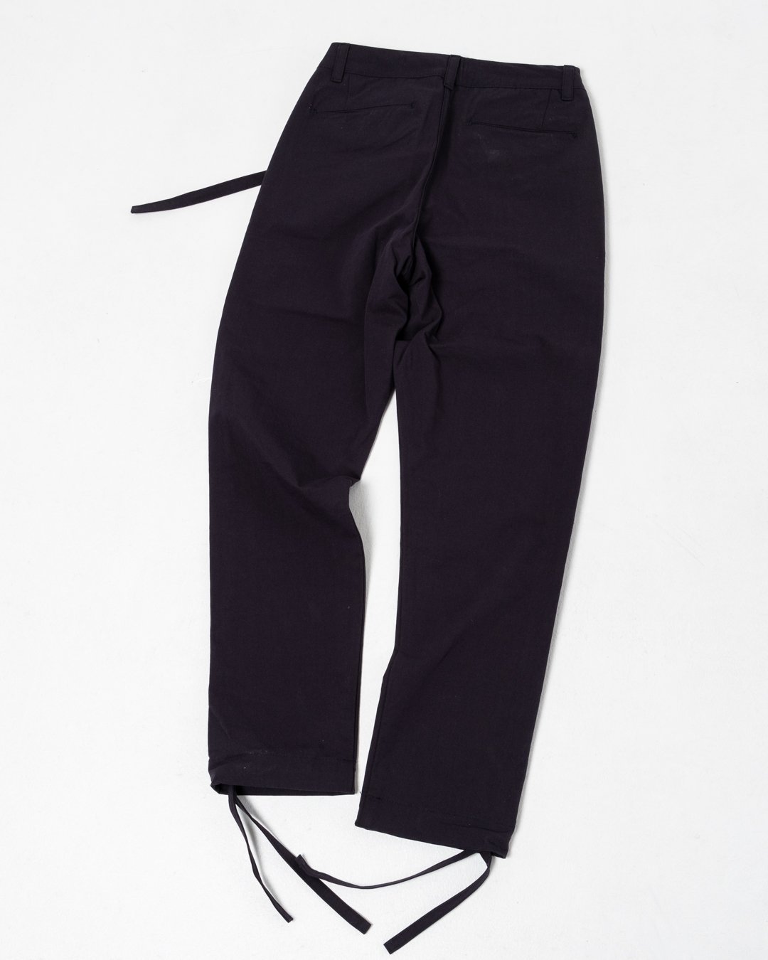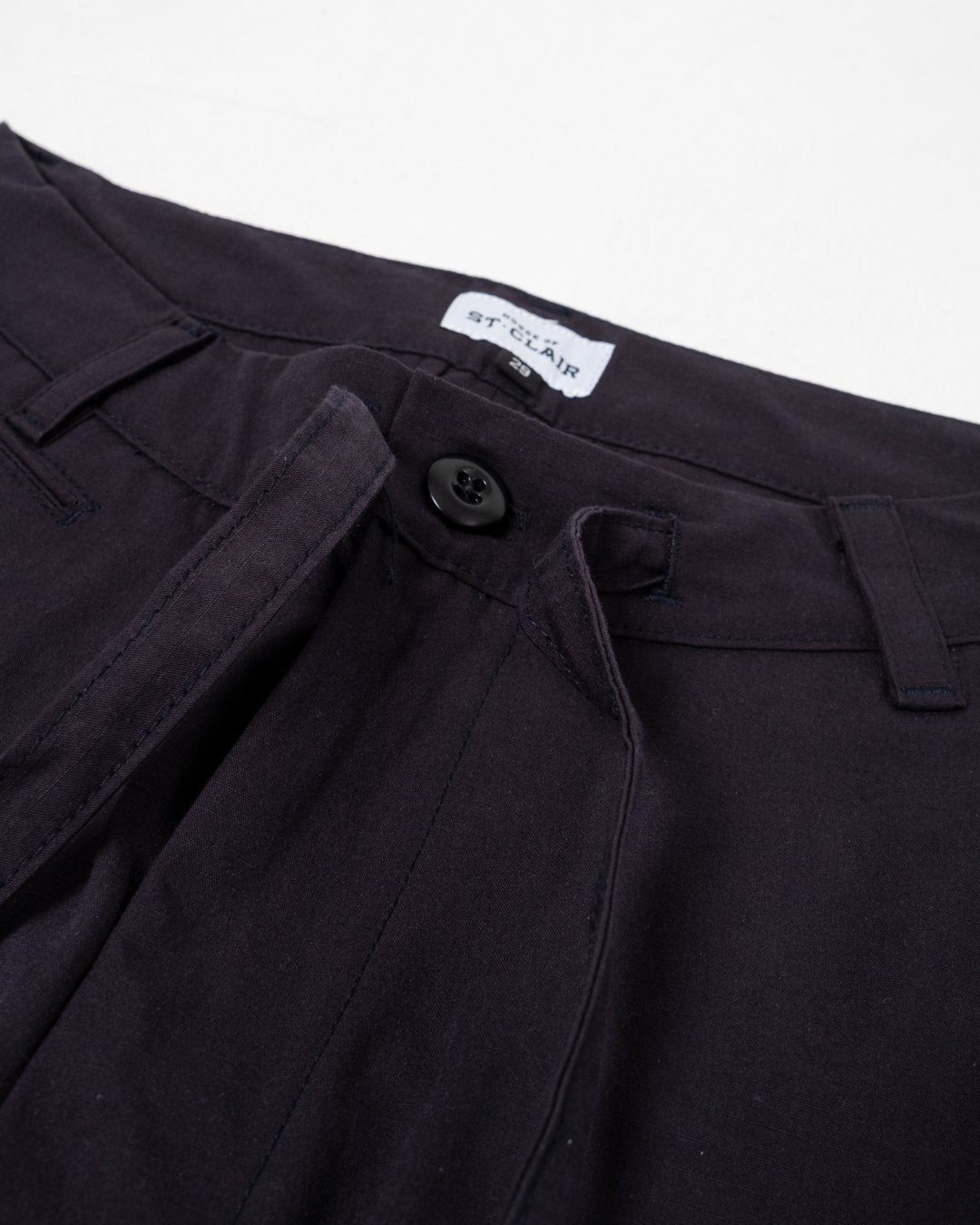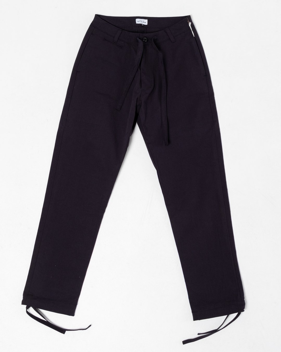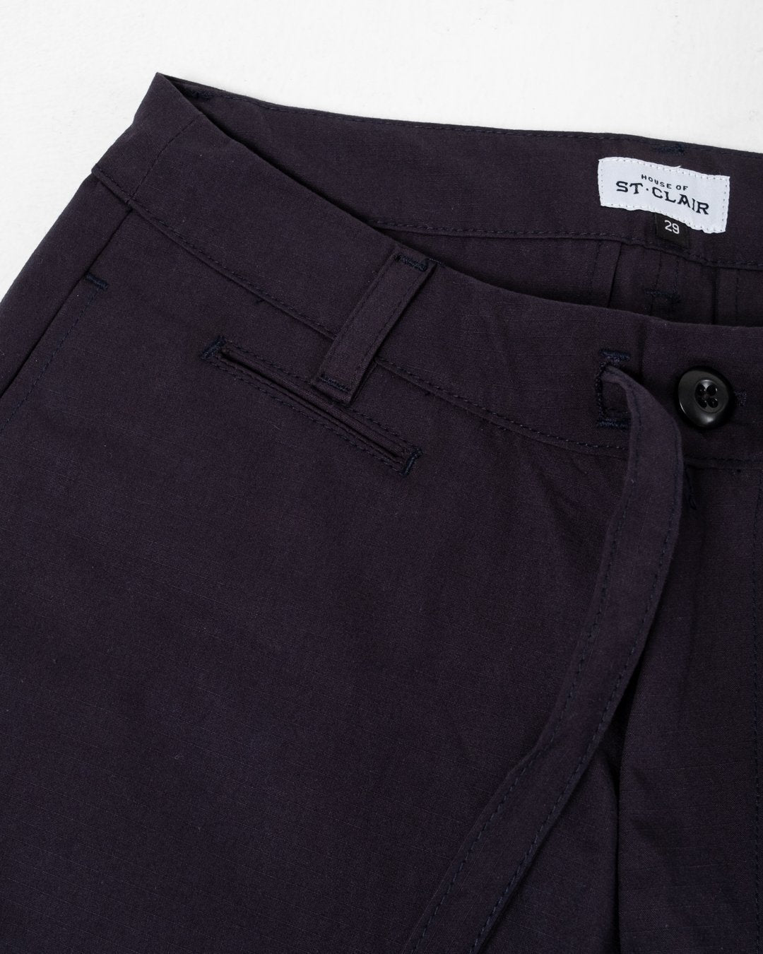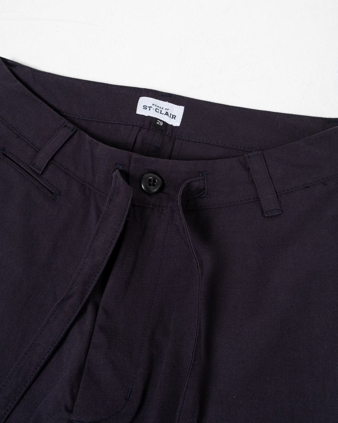 Drawstring Pant Navy Ripstop från House of St. Clair. Avslappnade byxor med dragsko i midjan och vid anklarna. Tillverkade av en mjuk men hållbar japansk bomull/nylon ripstop. Dubbla passpoalfickor bak och myntficka, framfickor i sidan och dragkedja. Tillverkade i USA.