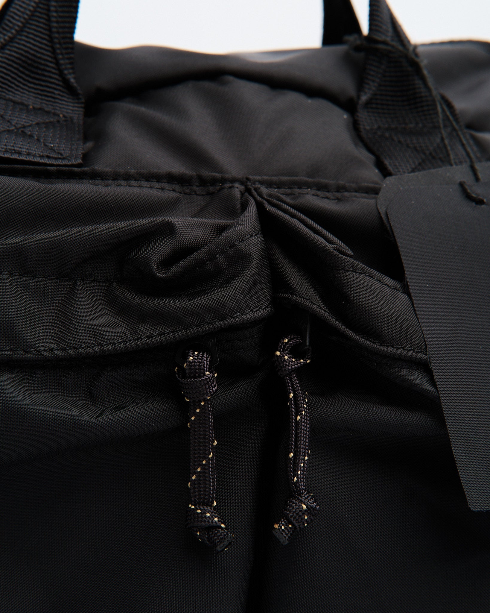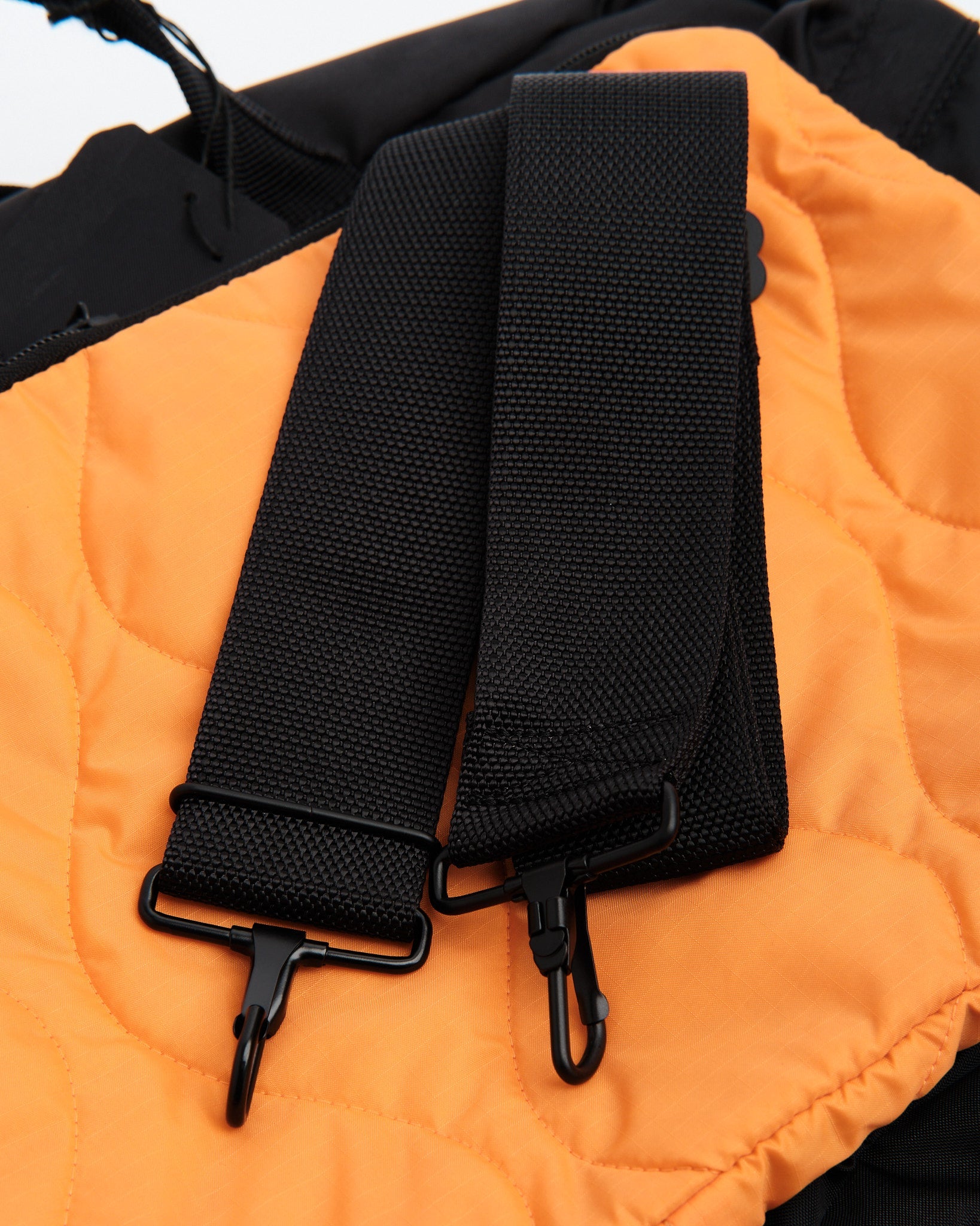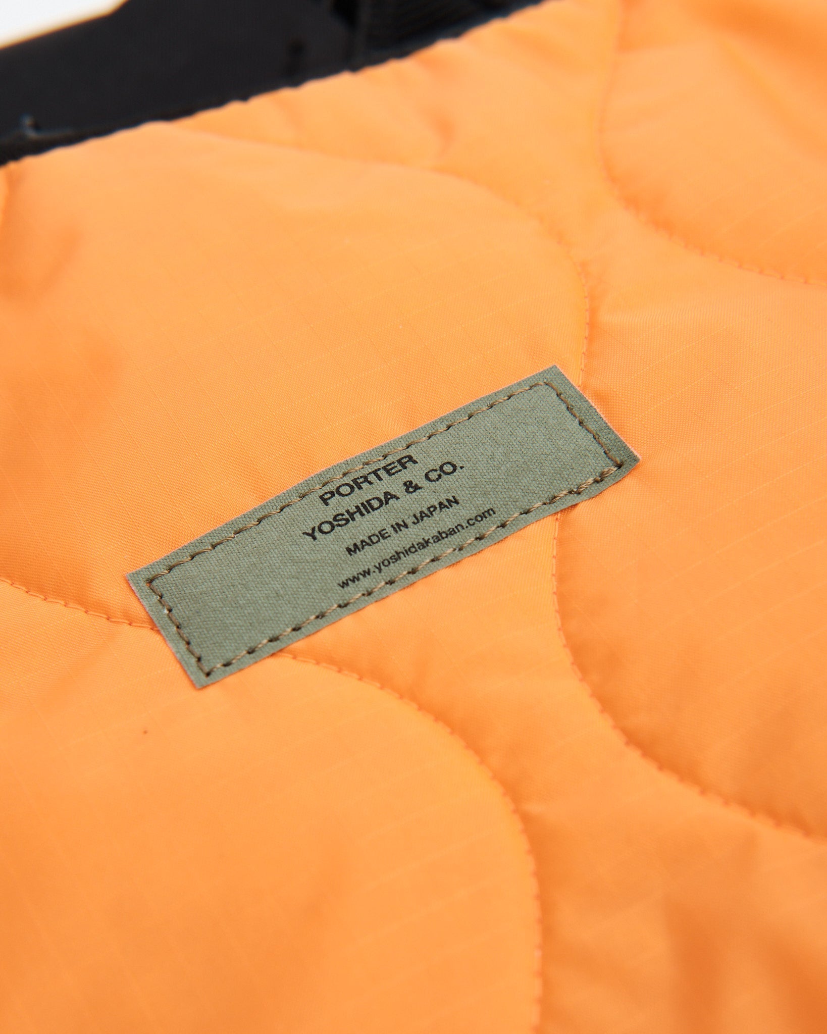 Tillverkad av industriell kvalitetsväv vävd med 210 denier 6 nylon stark tråd, ursprungligen använd för gummibåtar, är väskan exceptionellt hållbar. Interiören stoltserar med en nödfärgad orange foder, inspirerad av foder i militärjackor, och har ett quiltat ripstop-nylon för ökad motståndskraft.