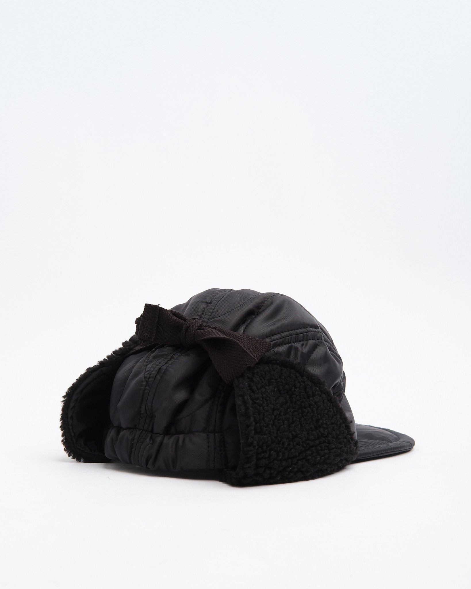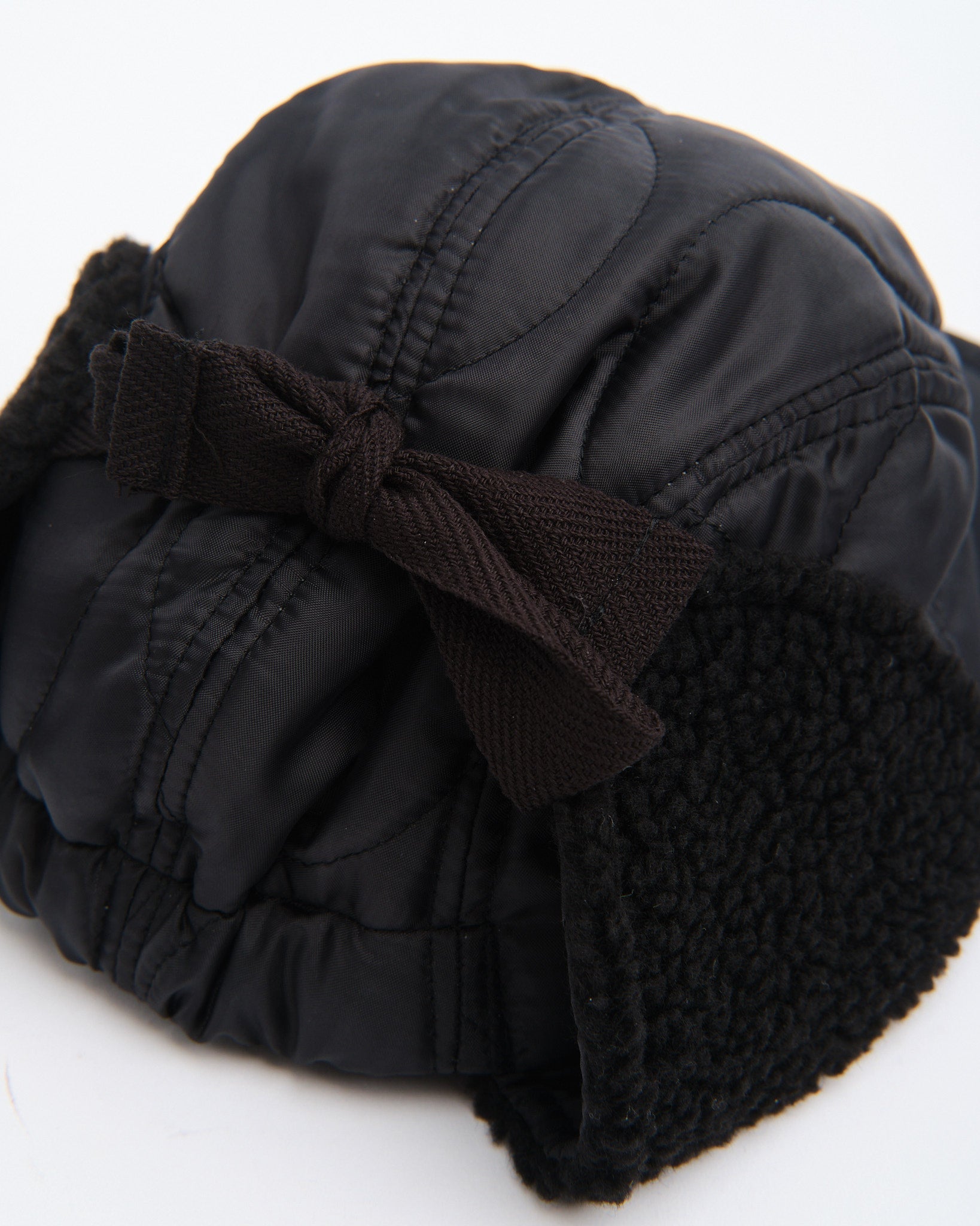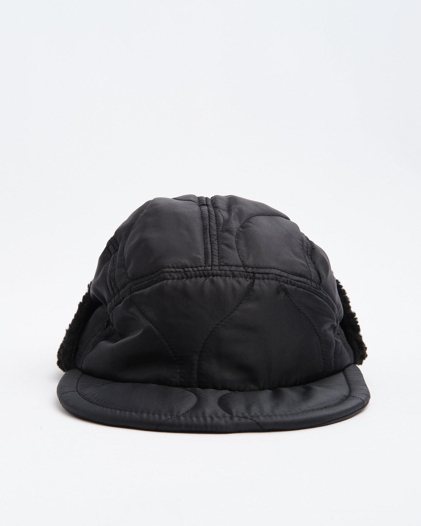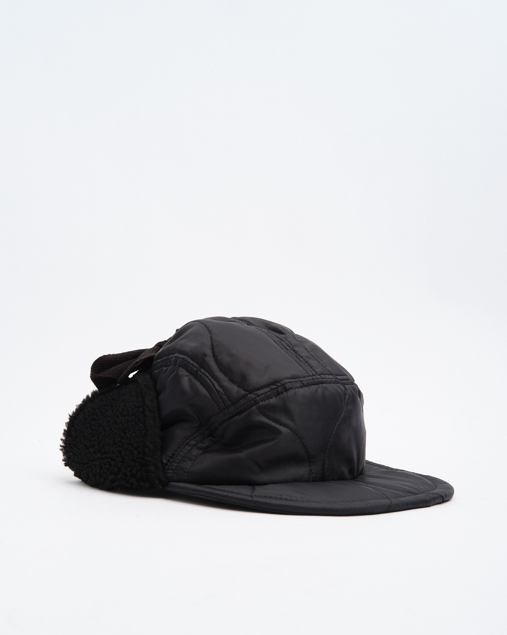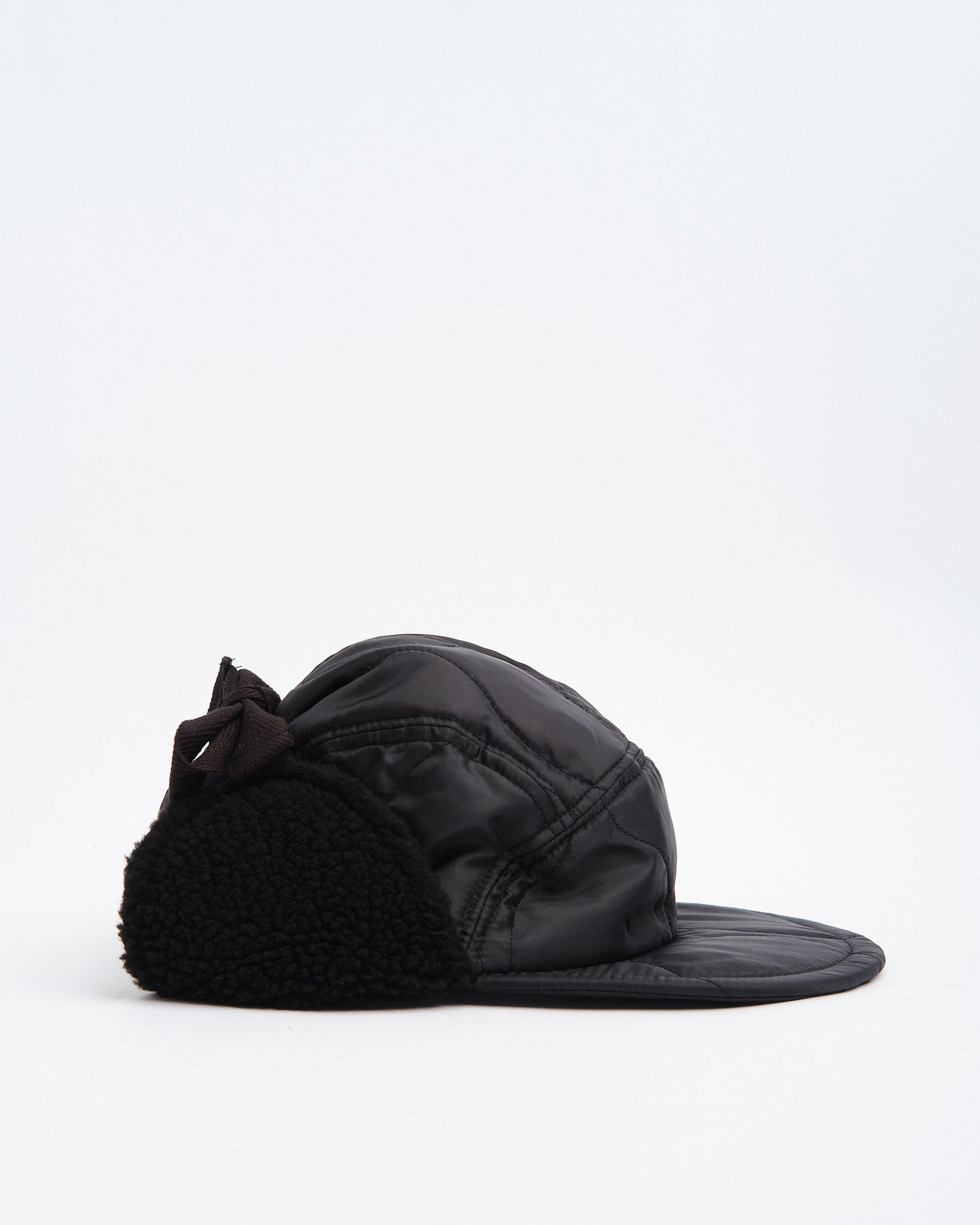 The Halfmoon Cap With Ears in Black by Found Feather is a cold-weather essential rooted in military inspiration and refined in execution. Made in Japan from a quilted nylon outer with polyester fill, it features boa fleece ear panels for added insulation. The 4-panel construction, semi-wide EVA foam brim, and full-back elastic combine to offer a structured yet flexible fit. Subtle cotton flat laces, hand-stamped detailing, and a QR-coded care tag finish this unisex cap designed for both utility and urban cool.