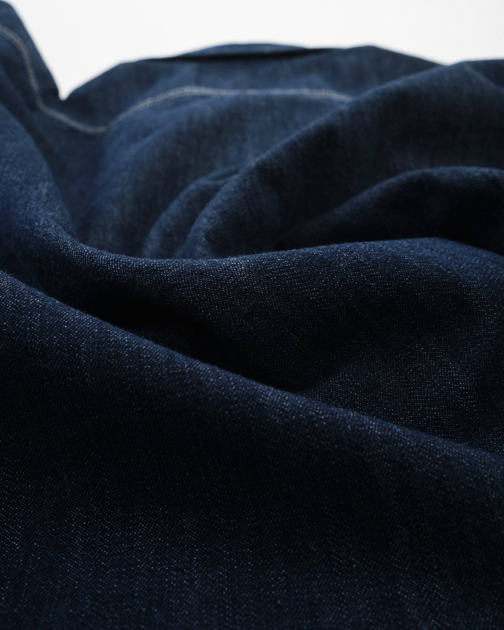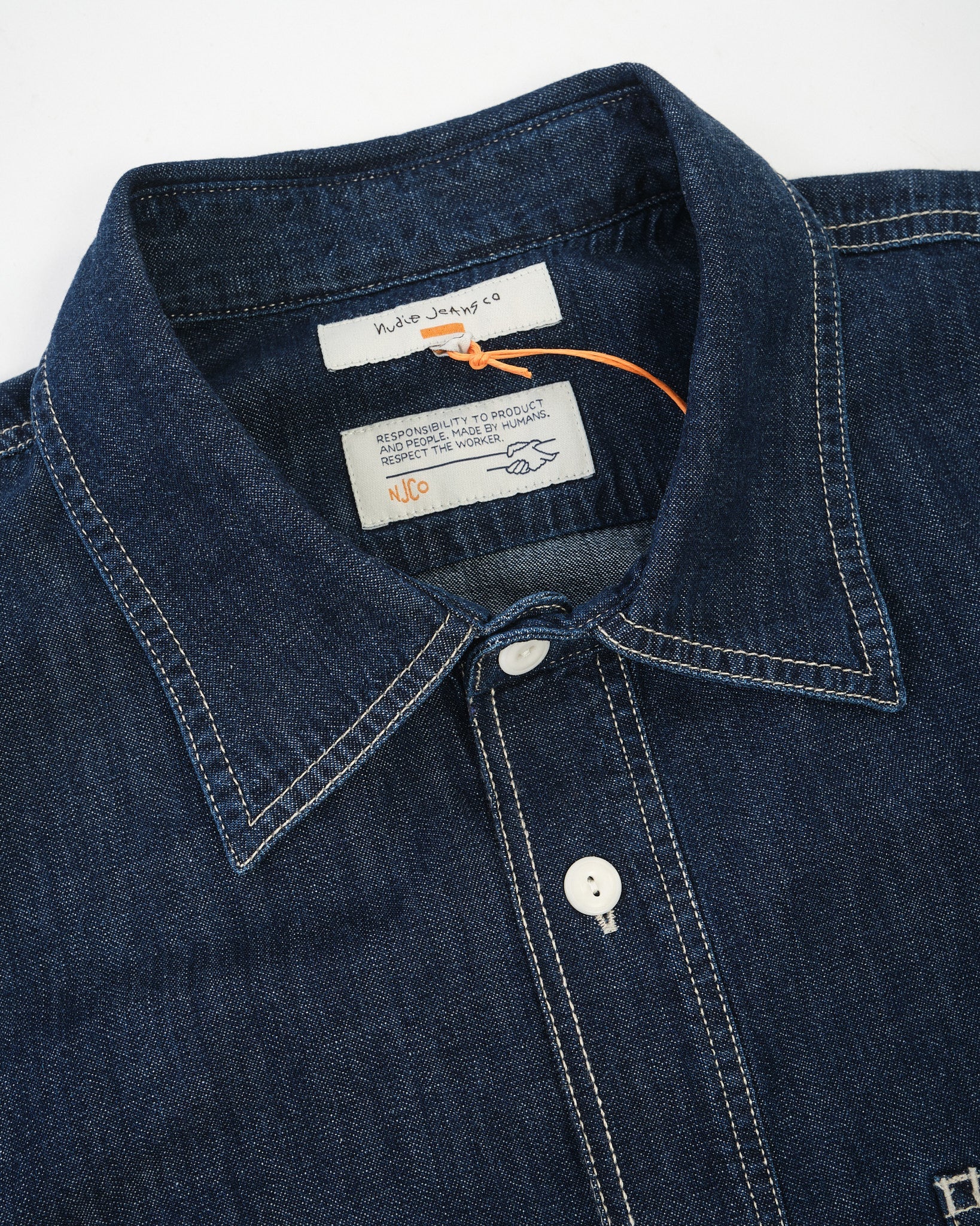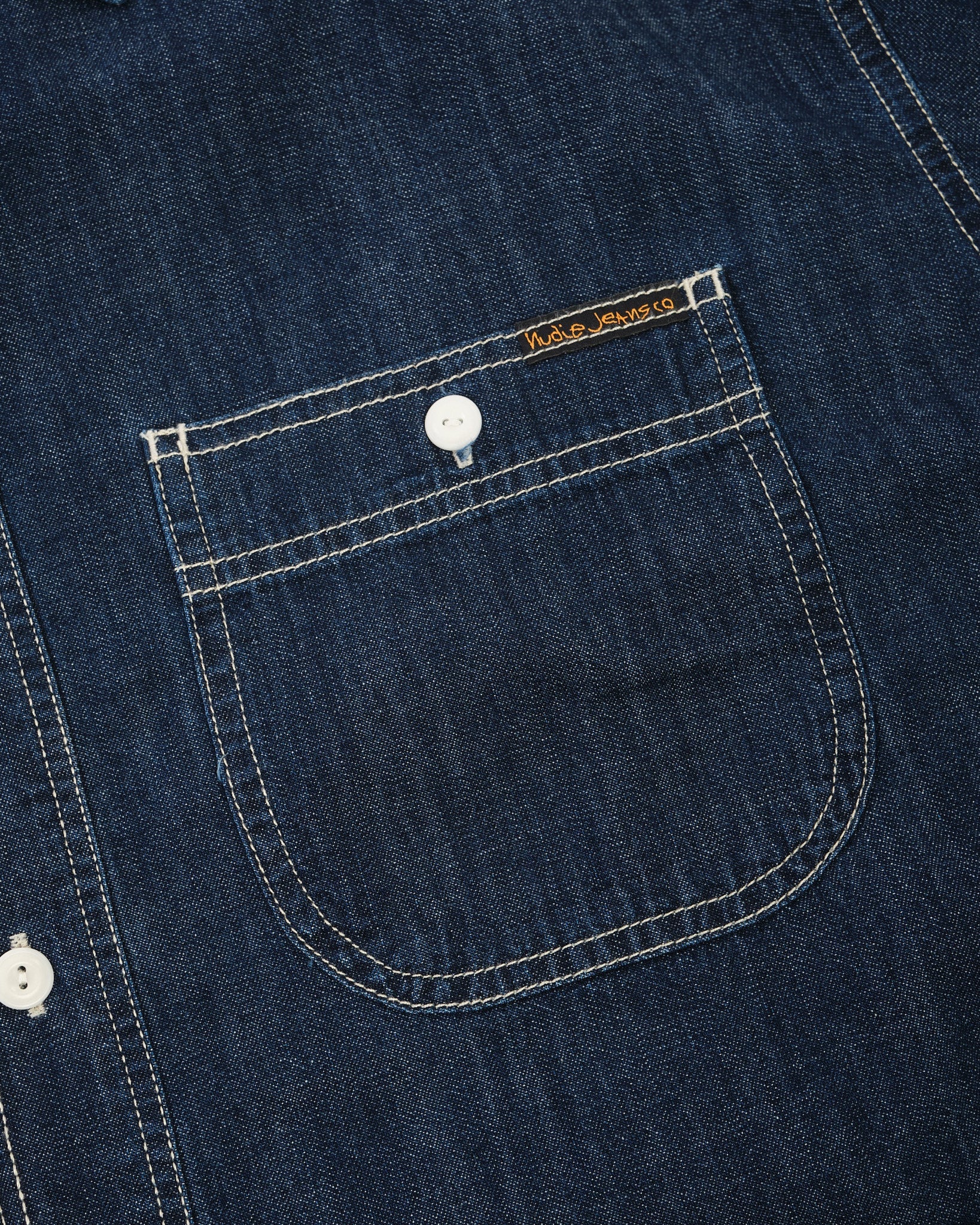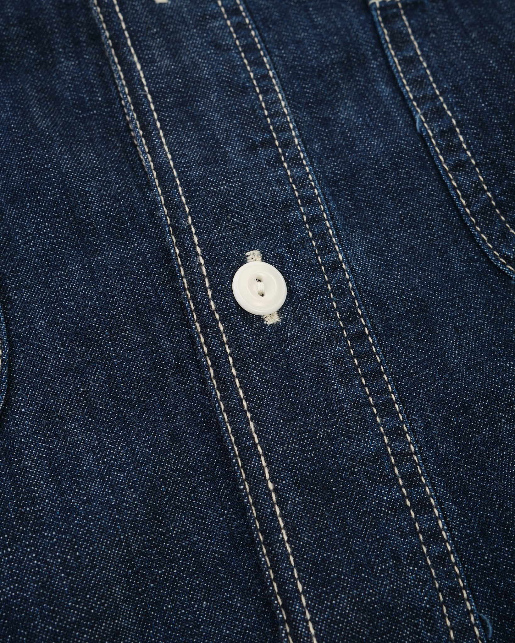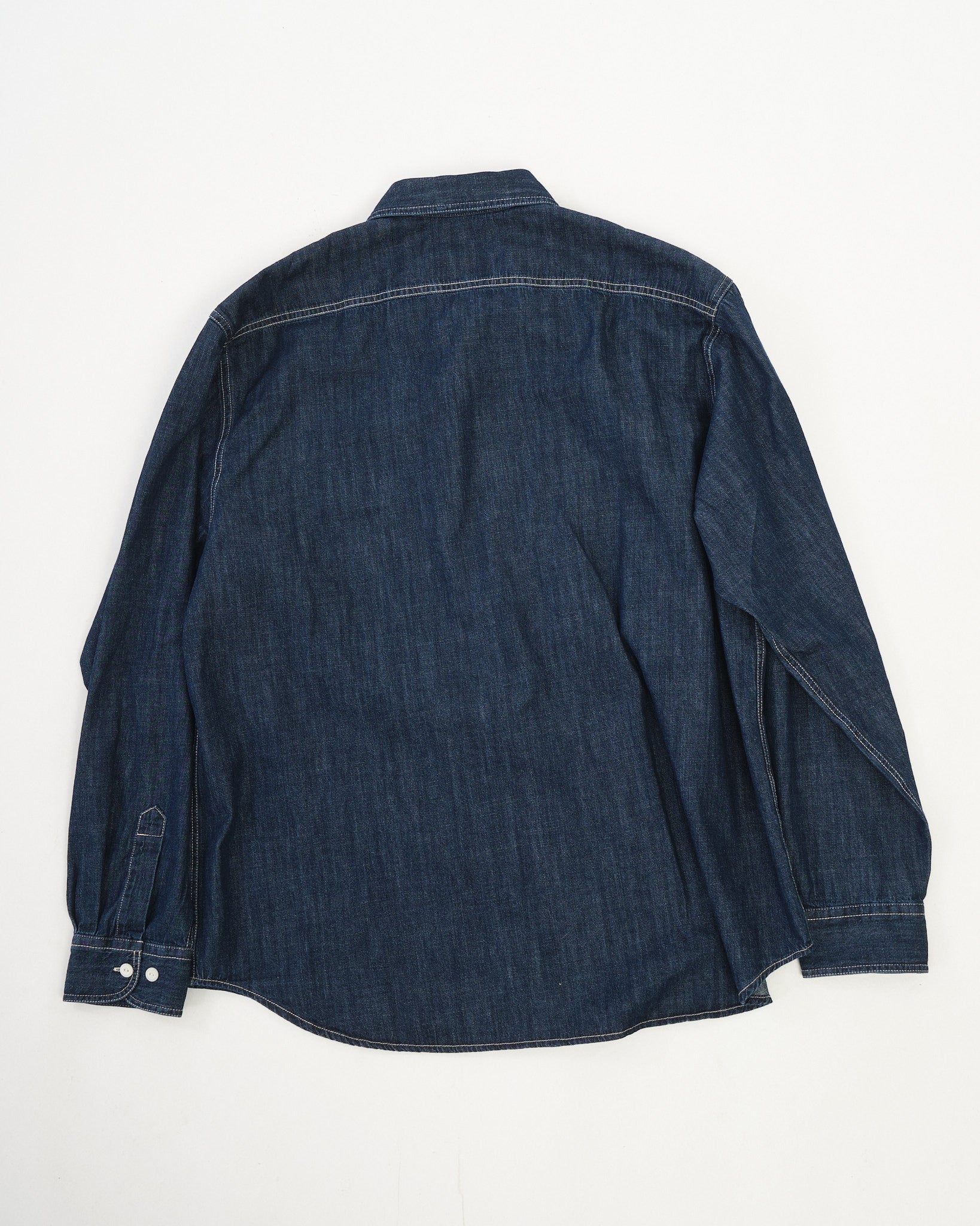 Rinsed to achieve a deep, clean blue tone, the shirt features off-white stitching and corozo buttons that create a sharp contrast against the dark fabric. While the rinse gives it a refined starting point, the denim will continue to fade with wear and washing, allowing the shirt to develop personal character over time.