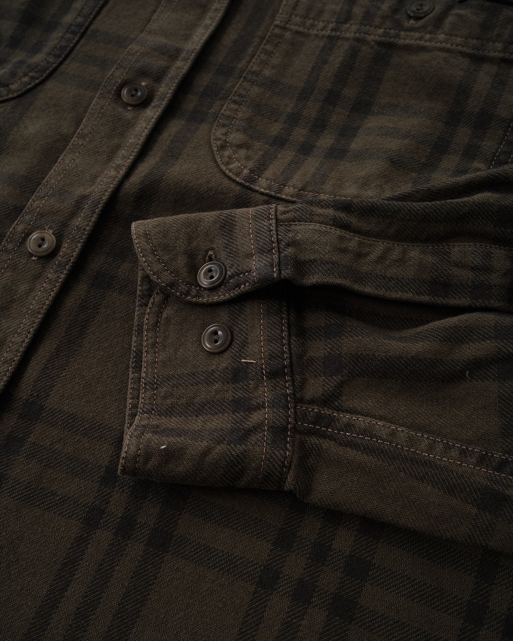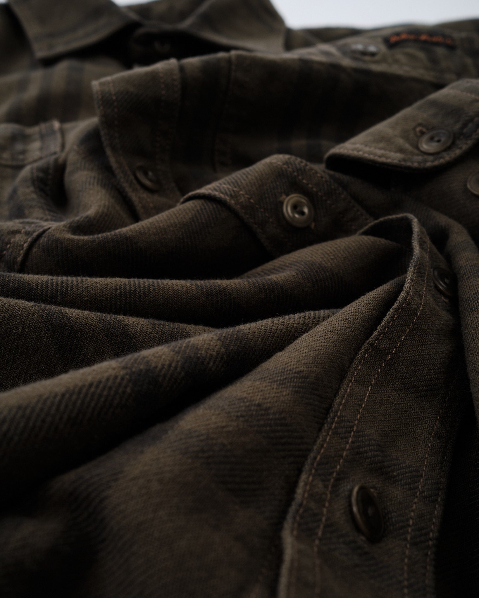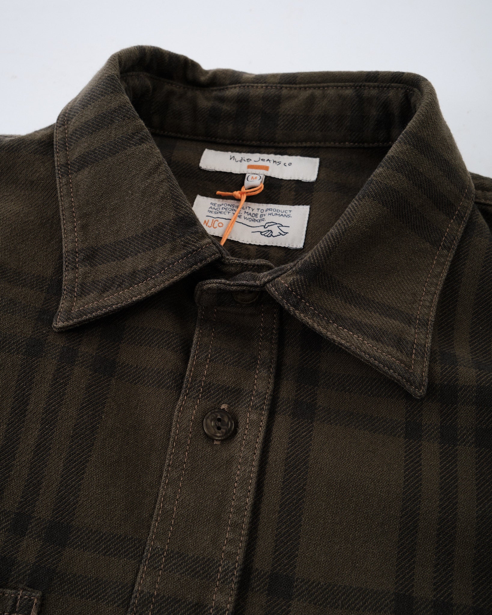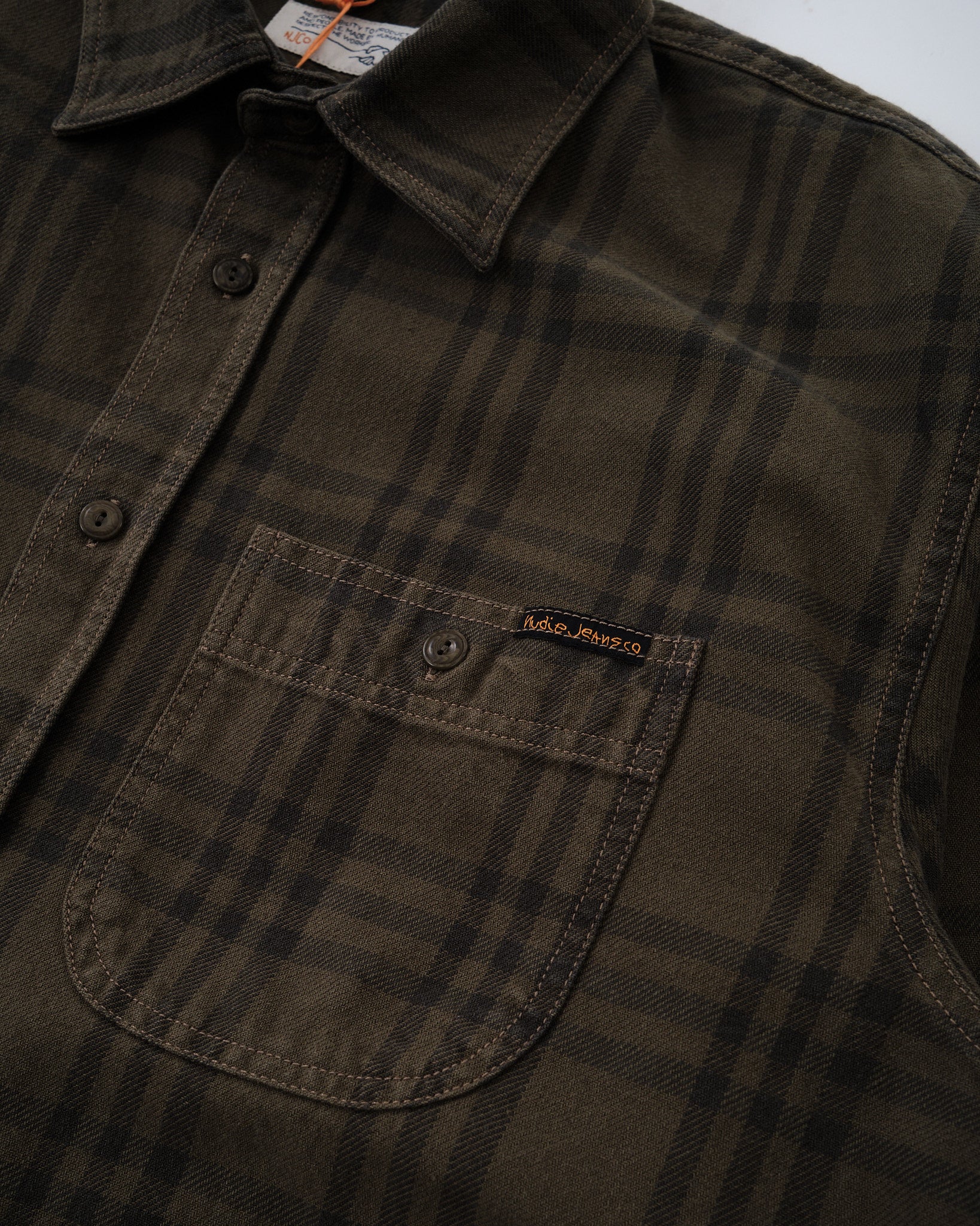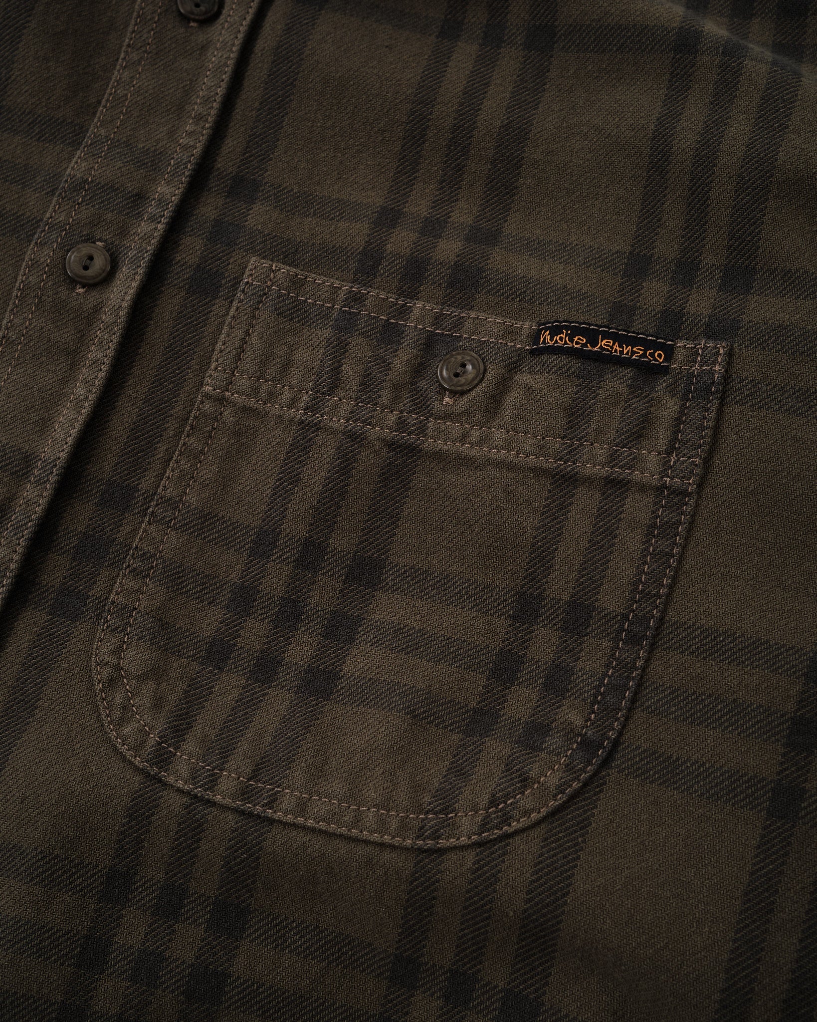 NUDIE JEANS CO. JULIAN WORKER PLAID CHECK SHIRT OLIVE är en klassisk långärmad skjorta med workwear-inspiration, tillverkad i robust men mjuk ekologisk bomullstwill. Tyget har en jordig olivgrön bas med ett mörkgrönt rutmönster, vilket ger en tidlös och mångsidig look.