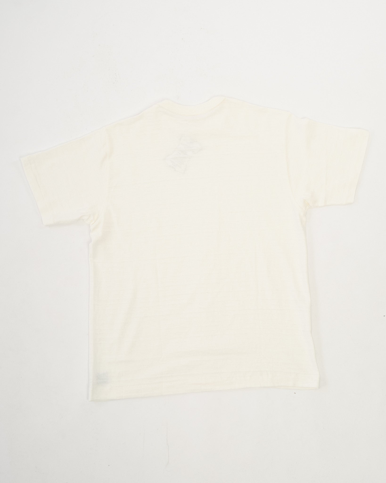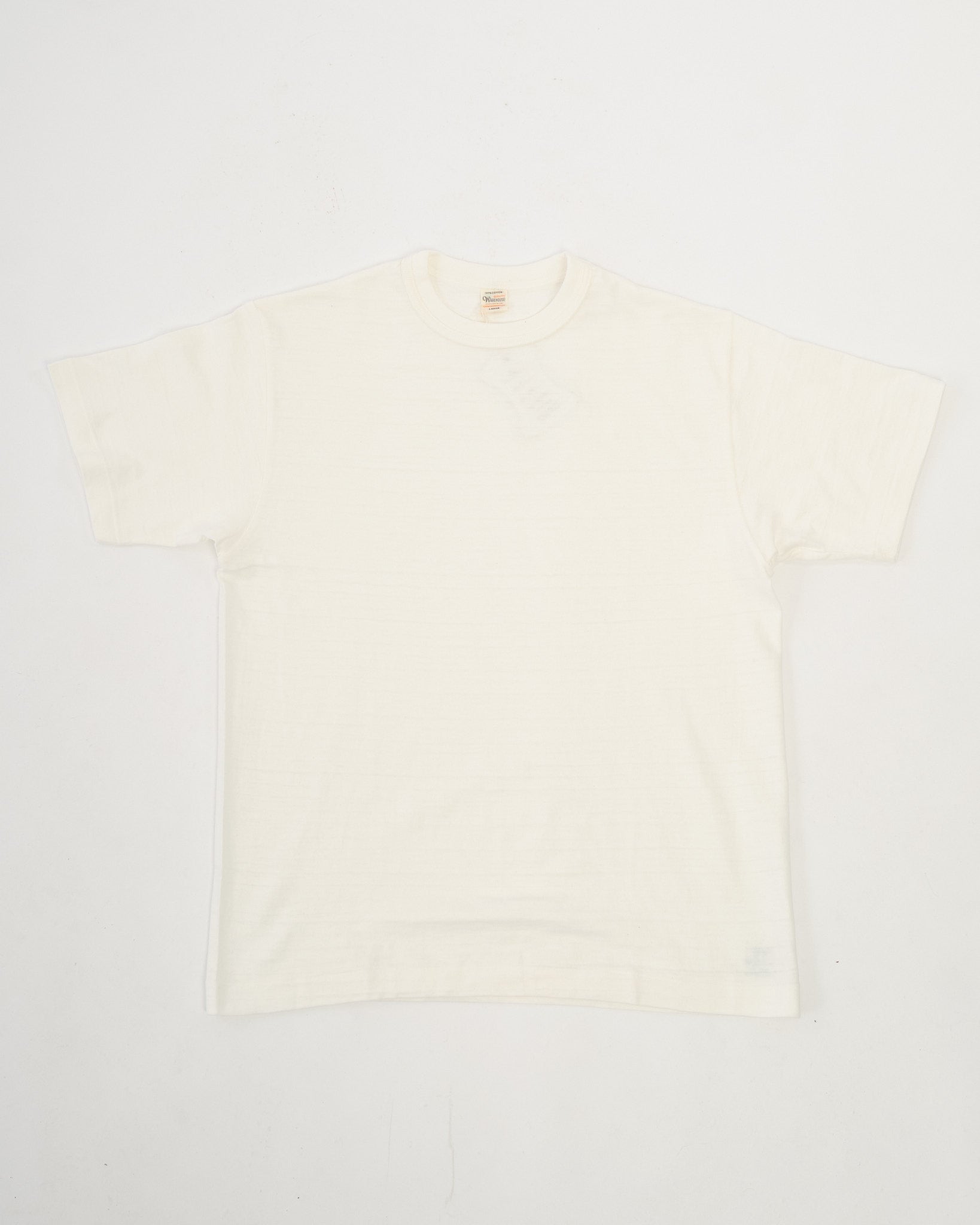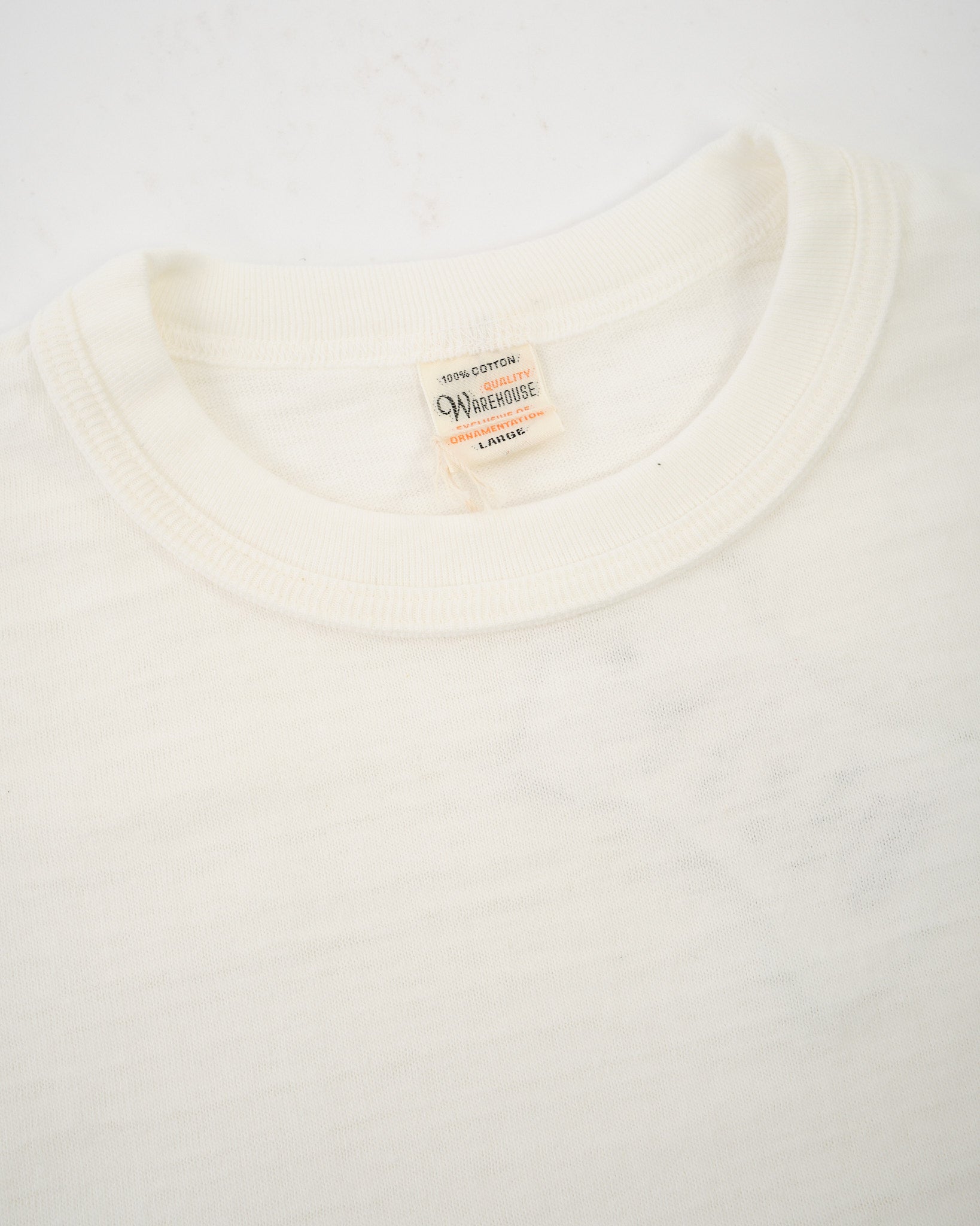 WAREHOUSE Lot 4601 T-shirten i Offwhite är en tidlös nödvändighet tillverkad av förstklassig slubbad bomull. Med sin mjuka textur och bekväma passform, förkroppsligar denna enkla t-shirt vintagekvalitet och vardagsmångsidighet. Oavsett om den bärs som ett baslager eller för sig själv, levererar den både hållbarhet och klassisk stil. Ett måste i varje garderob.