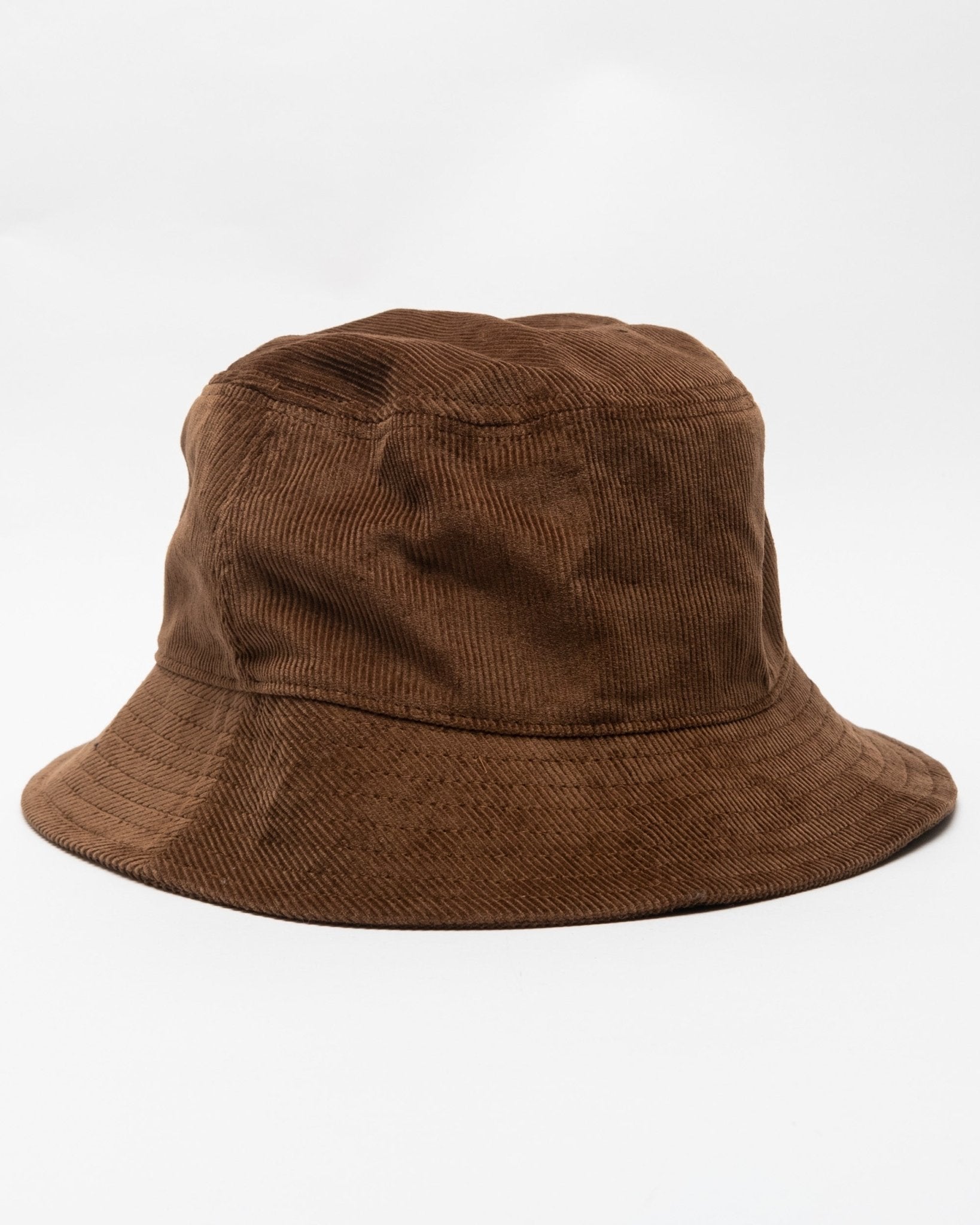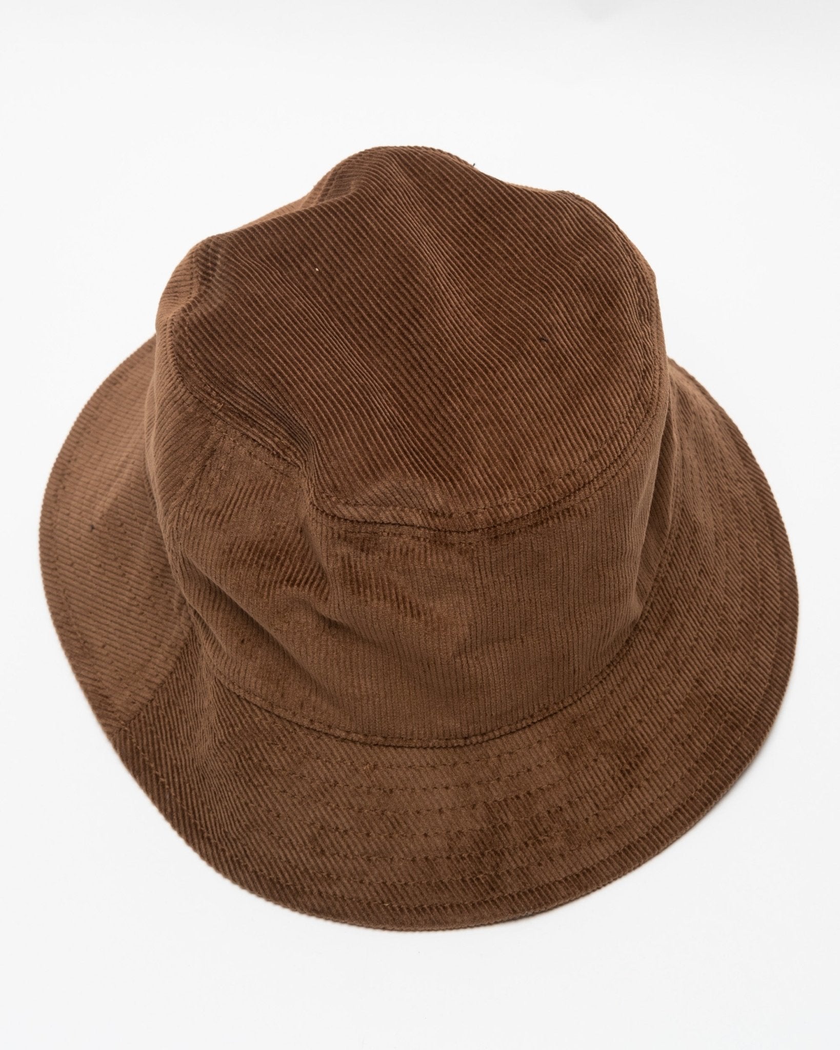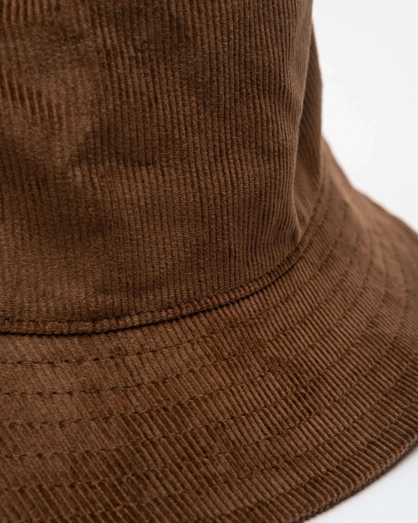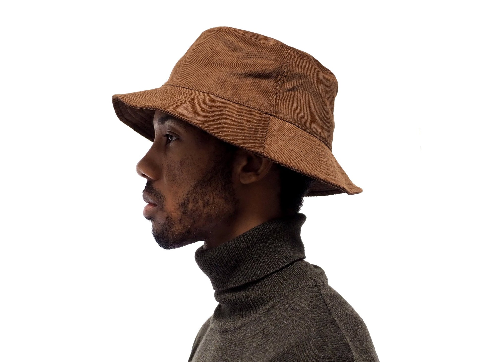 Bucket Hat Brown från Found Feather. En lätt, justerbar, manchesterhatt. Denna hatt har en djupare krona och längre brätte, inspirerad av 80-talet. För att justera storleken på hatten, lyft bandet inuti för att se kardborrebandet, justera hela vägen till vänster för den största storleken (61cm) eller justera hela vägen till höger för den minsta storleken (57cm). Japansk manchester. Tillverkad i Japan.