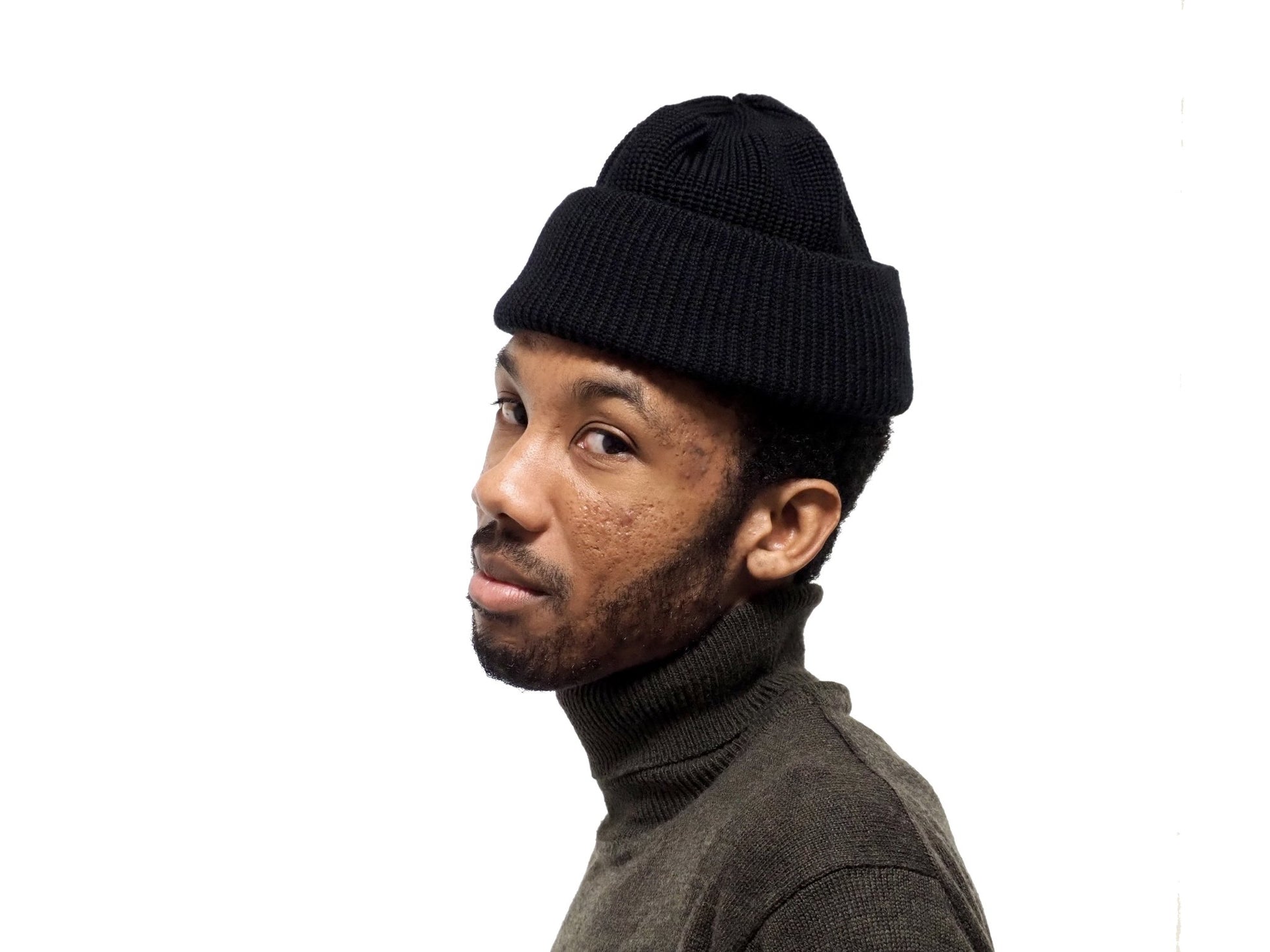 Knit Watch Cap Black från Found Feather. En keps av 100 % merinoull, designad efter vintage militärstickade kepsar. Allt garn kommer från och importeras från Italien. Tillverkad i Japan.