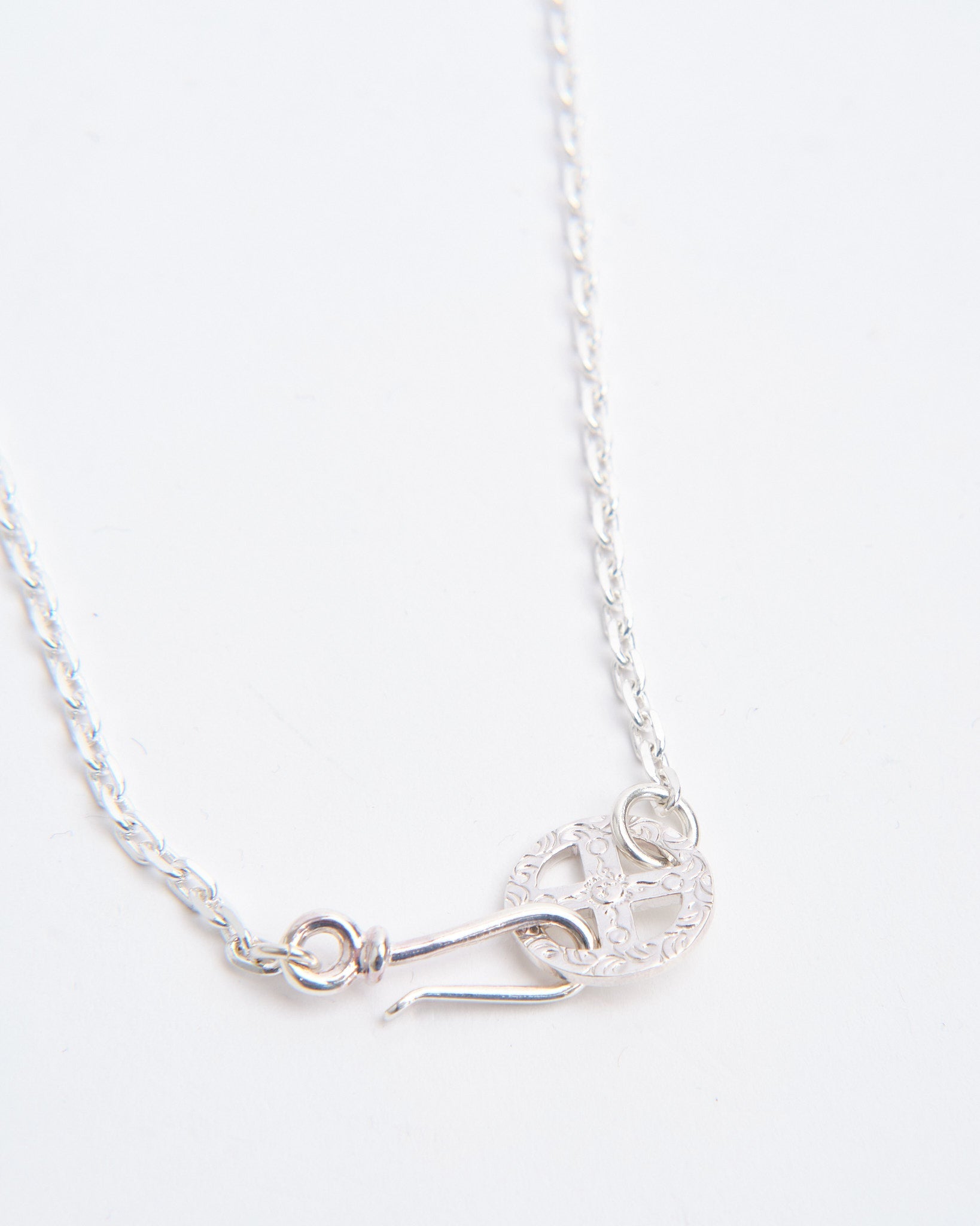 Paired with a 55cm silver chain, this necklace is ready to wear straight out of the box. First Arrows apply their exclusive heat-treatment process to strengthen the silver, improving durability while maintaining a clear, refined surface. Over time, the silver will naturally darken and develop patina, giving the piece greater depth and individuality.