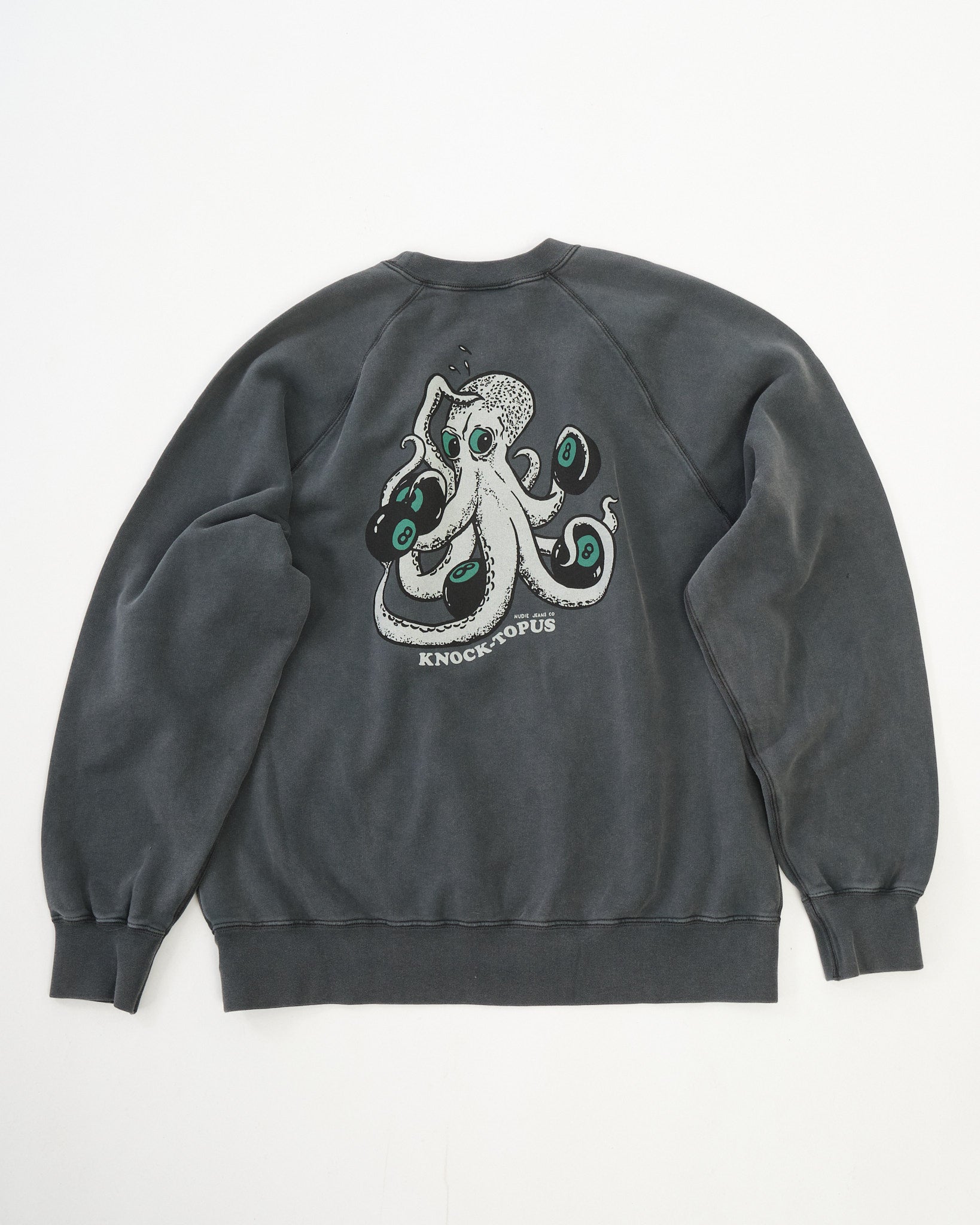 The sweatshirt is garment dyed and fade-out washed to achieve its faded antracite tone, giving it a gently worn-in appearance with subtle variations in colour. Designed with raglan sleeves, flatlock seams, and rib-knit cuffs, it offers a clean, relaxed silhouette with practical comfort.