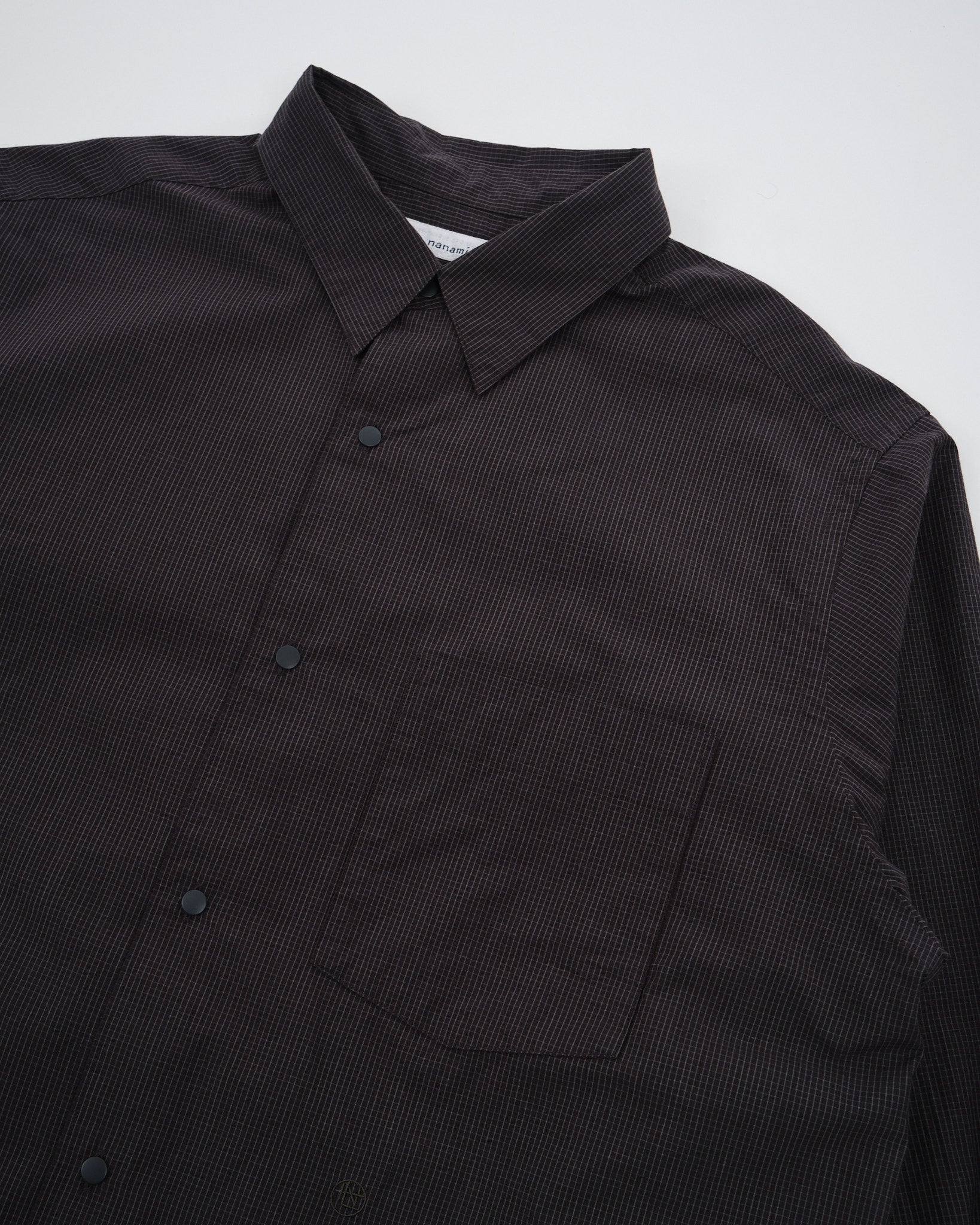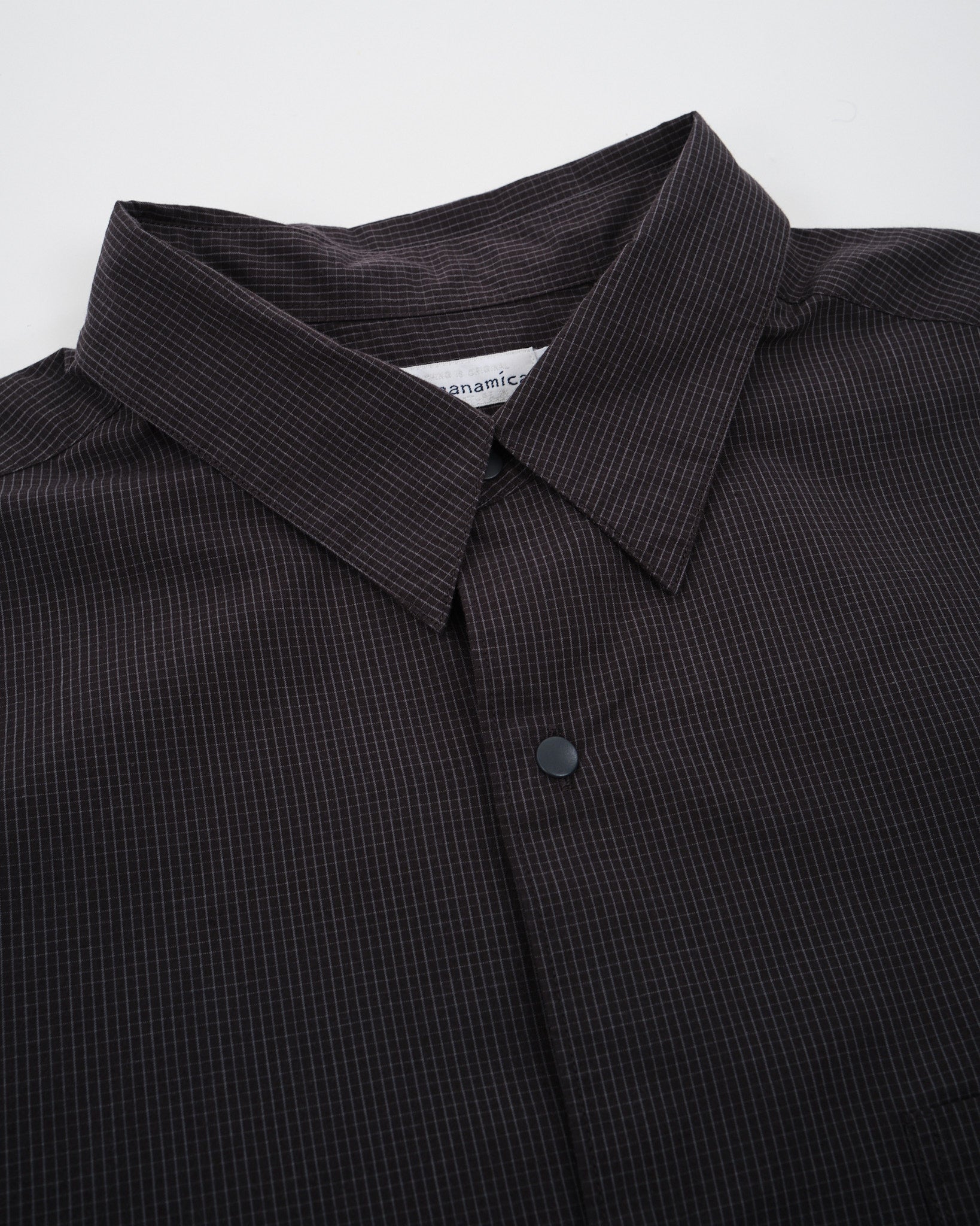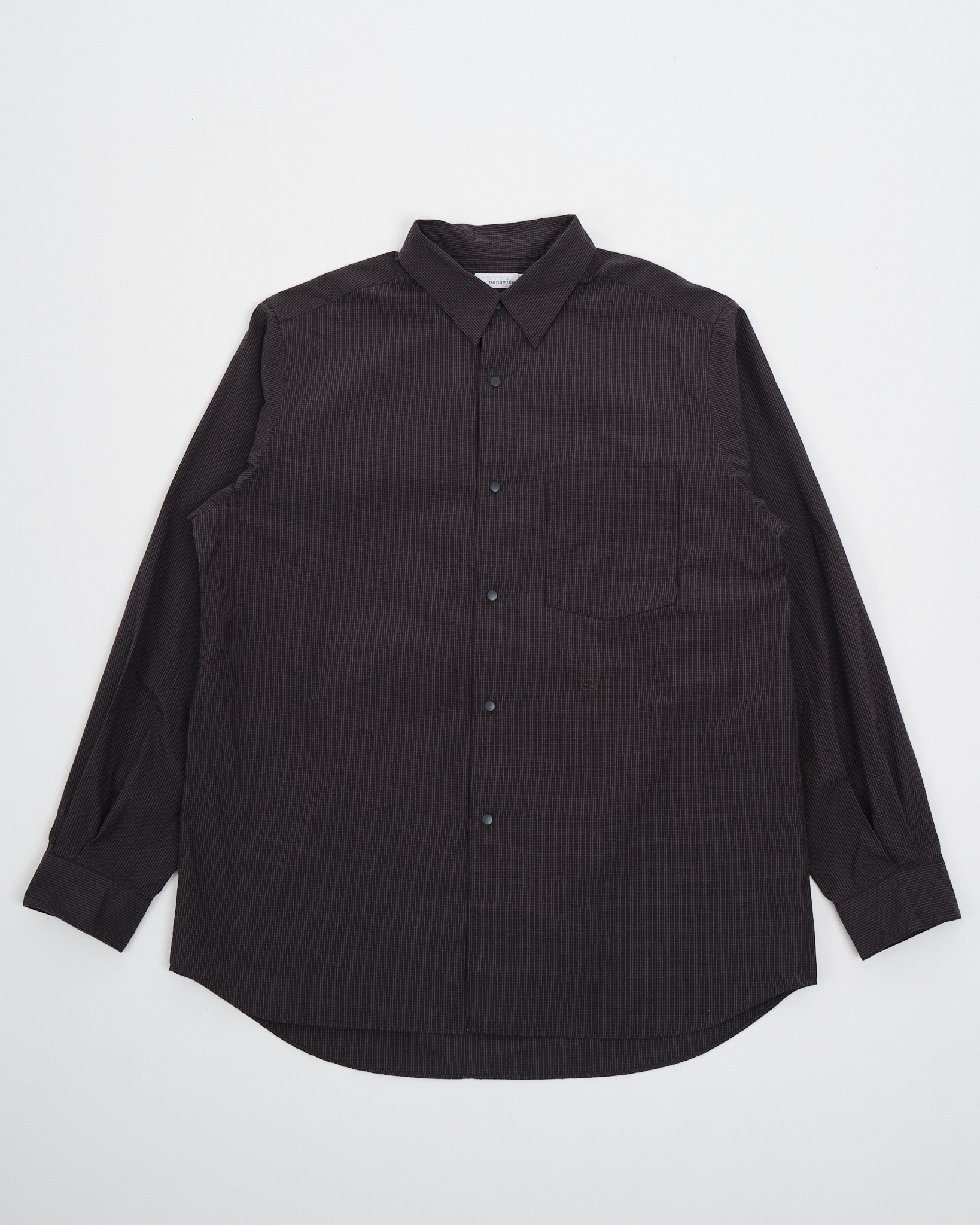 Stig in i förfinad sofistikation med Nanamicas Regular Collar Wind Shirt i en djup kolnyans. Skjortan förenar traditionell dragningskraft med samtida elegans. Dess unika broadclothtyg, tillverkat av täckande kärntråd, är omsorgsfullt designat med bomull som omsluter en polyesterkärna. Jämfört med den standard SUGS307, skryter den med en lättare tygtextur och erbjuder en silhuett ungefär en storlek smalare. Skjortan pryds av ett klassiskt rutigt mönster, som subtilt förhöjer dess estetiska tilltal. För att komplettera dess design, är alla knappar utformade som prickknappar, åtföljda av dekorativa knapphål, för den där extra finessen.